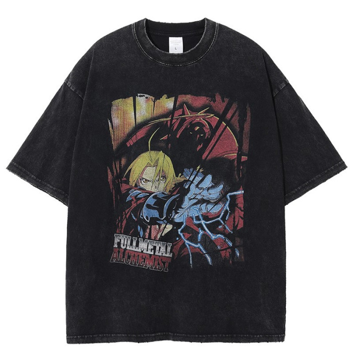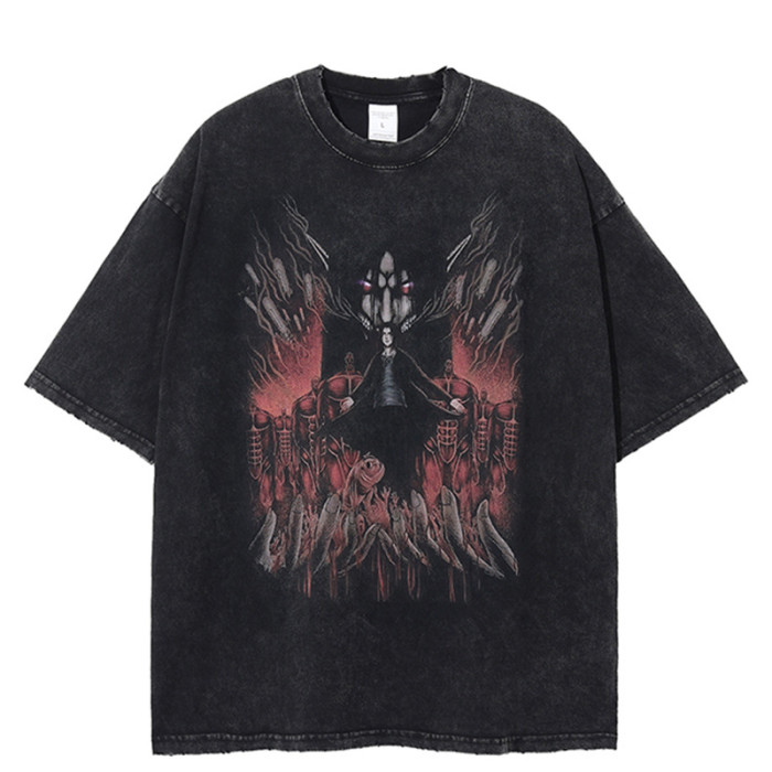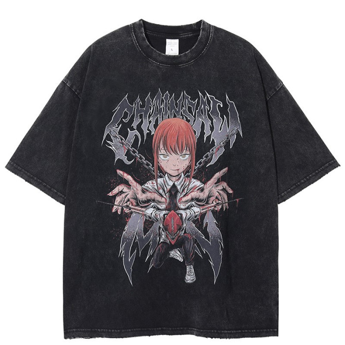 動漫電鋸男T恤男式復古水洗體恤美式高街大碼男式上衣街頭原宿