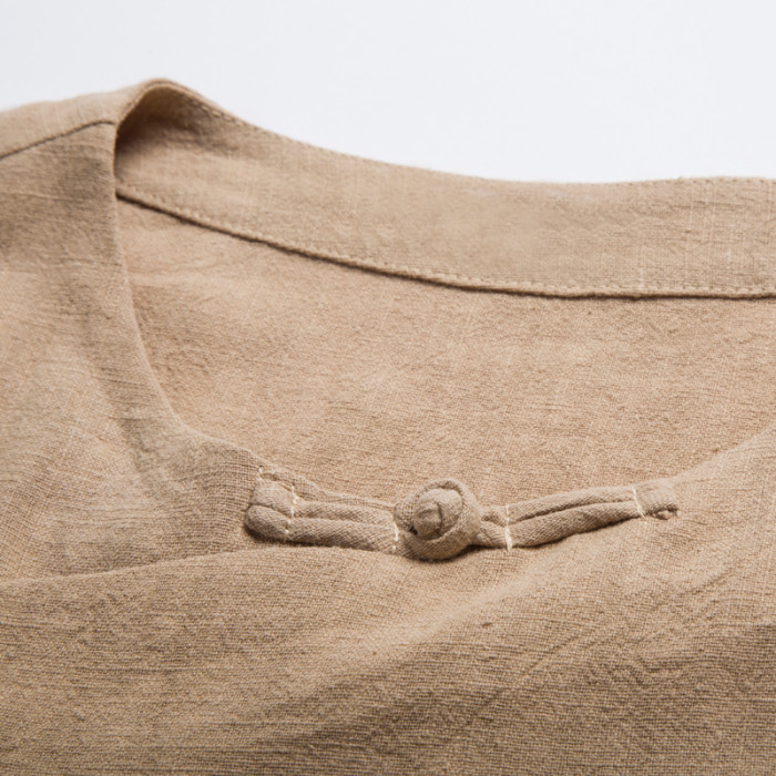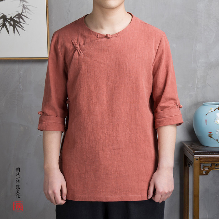 夏裝亞麻汗衫中是斜襟改良漢服棉麻禪服復古風七分袖茶服男T恤衫