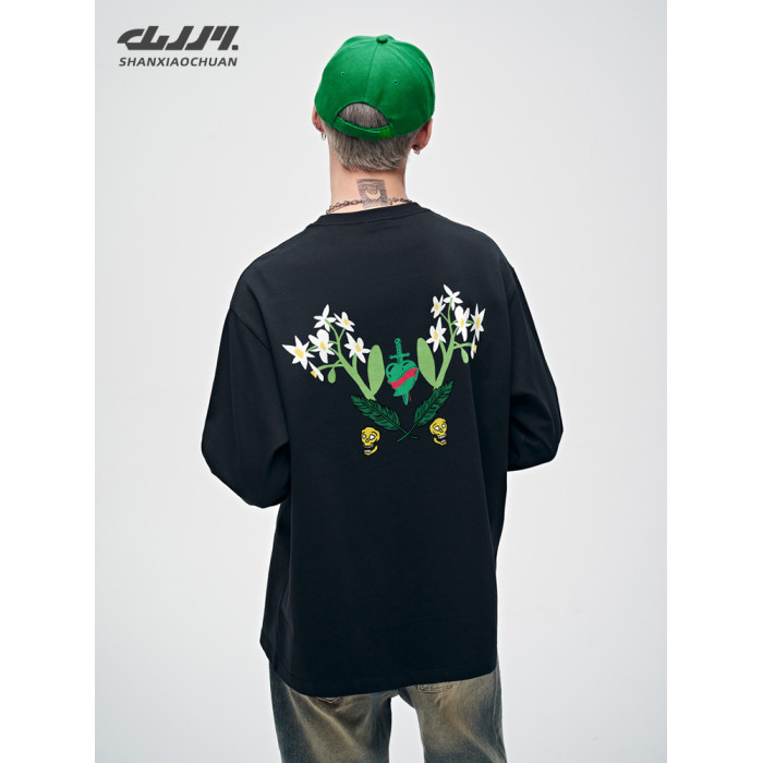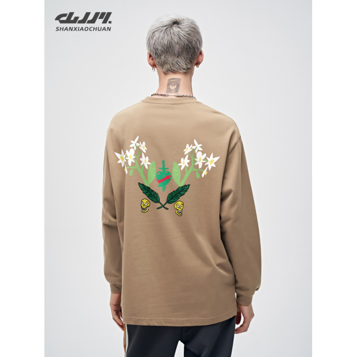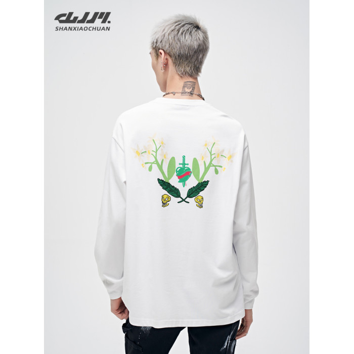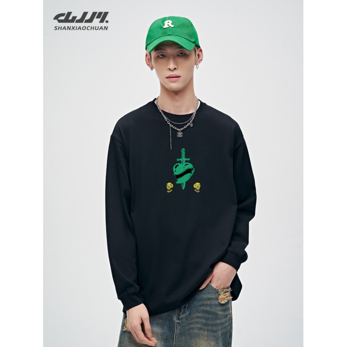 山小川原創圓領長袖男t恤秋冬重磅純棉美式男裝春秋衫學生打底衫