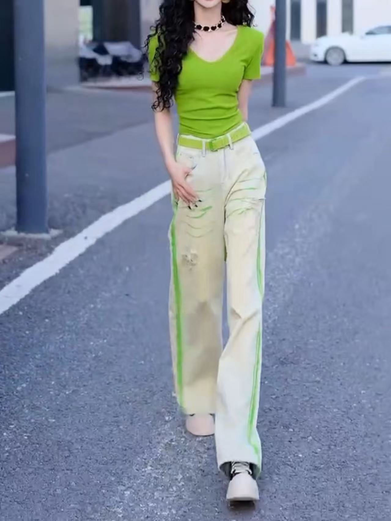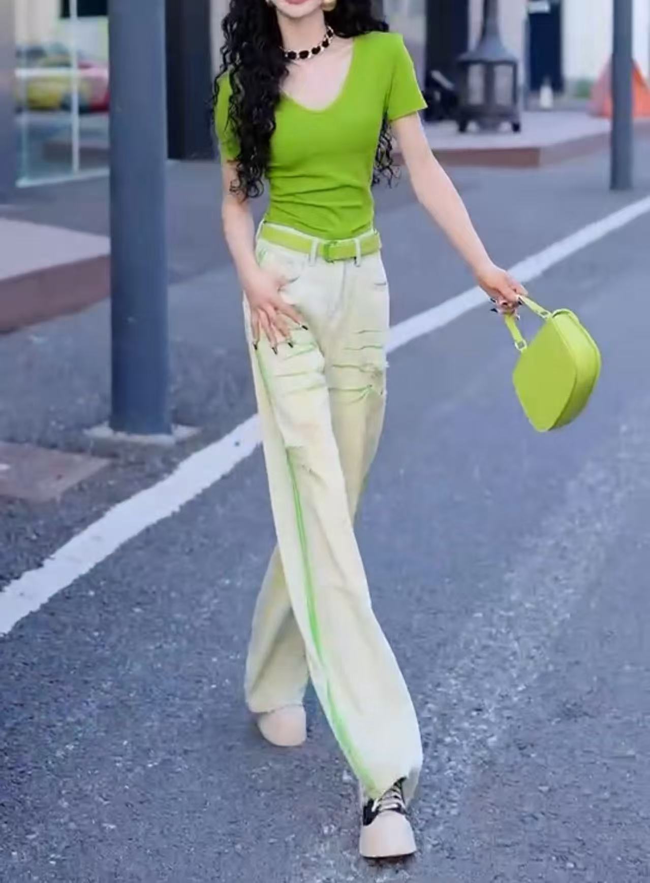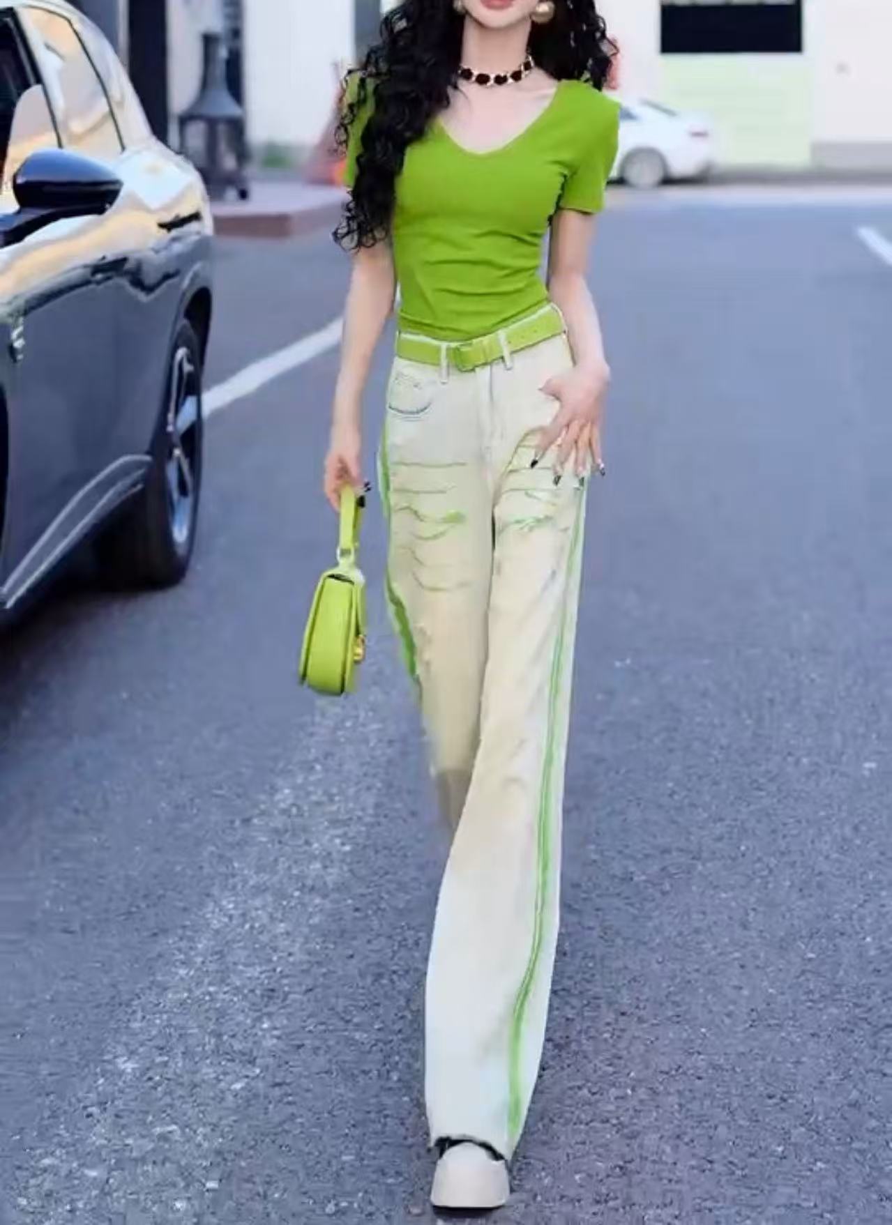 顔色 綠色上衣+綠條牛仔褲+腰帶