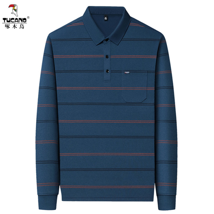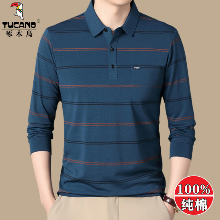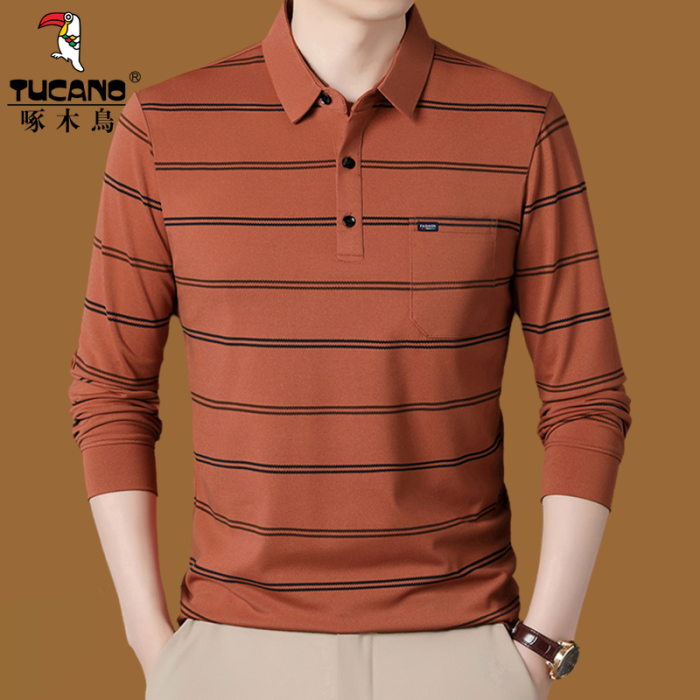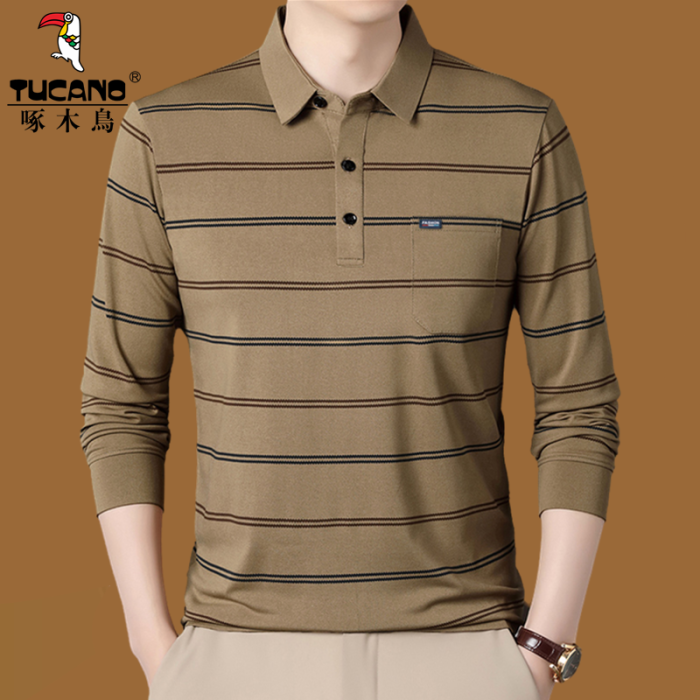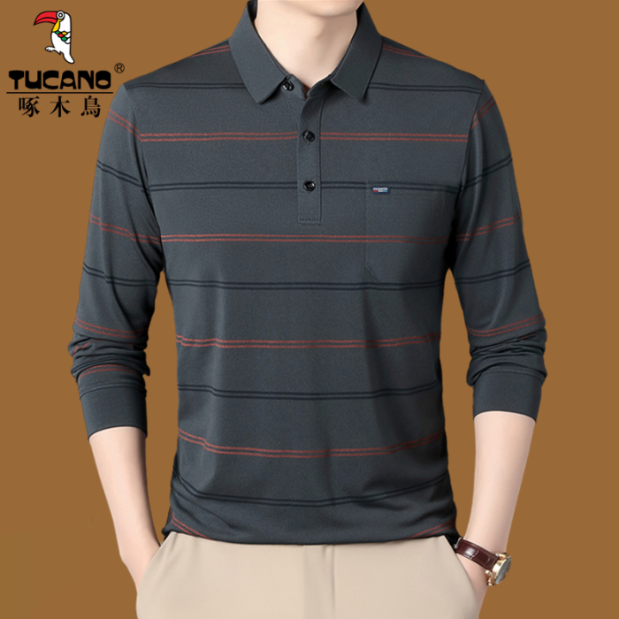 啄木鳥春秋長袖男t恤翻領條紋帶口袋polo衫中老年爸爸薄款打底衫