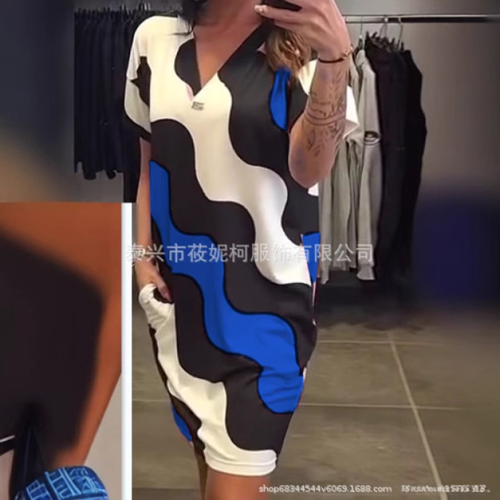 2024新款3D印花圖案 短袖V領收腰大裙擺連衣裙中長款女裝裙子