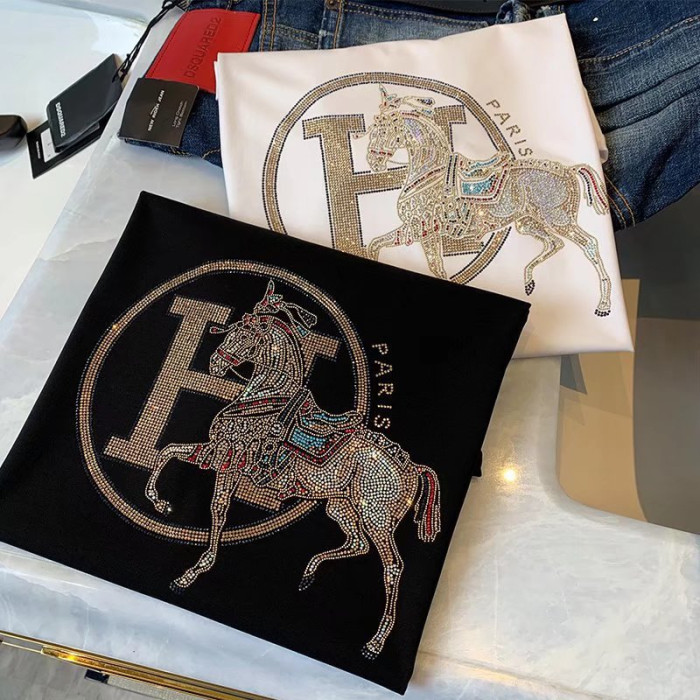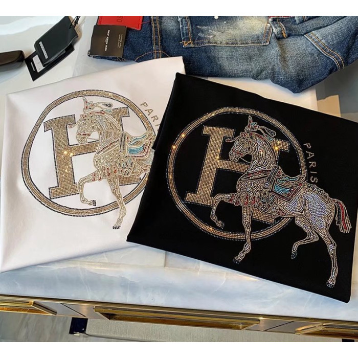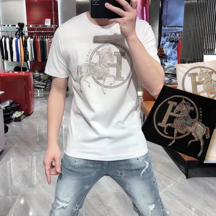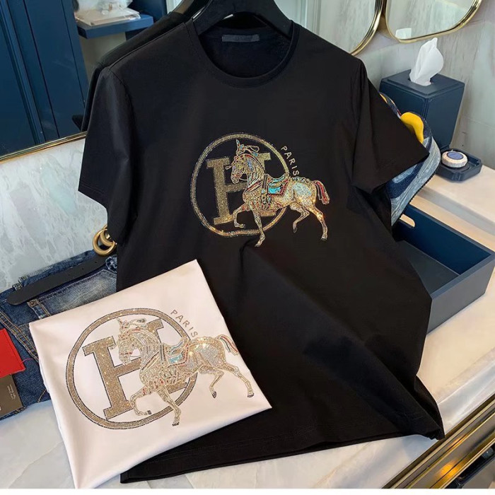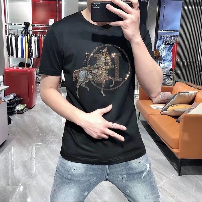 歐洲站夏季新款短袖男T恤燙鑽金色H薄款涼爽絲光棉時尚輕奢華潮牌