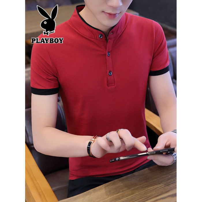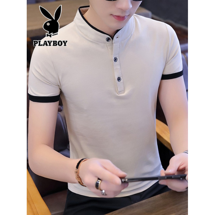 花花公子純棉短袖t恤男士2025夏季潮流立領半袖修身上衣休閒男T恤
