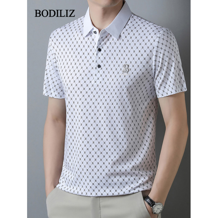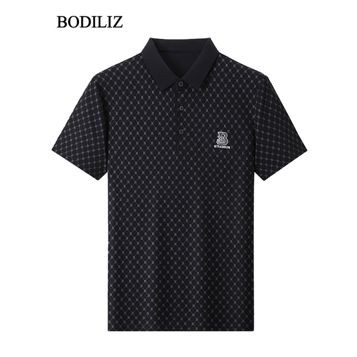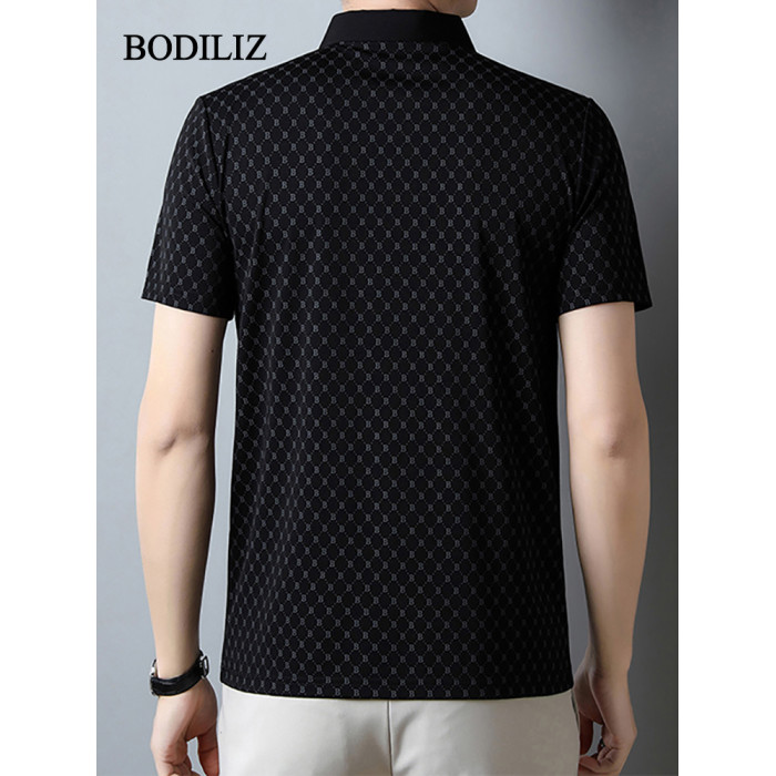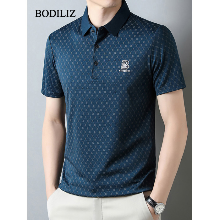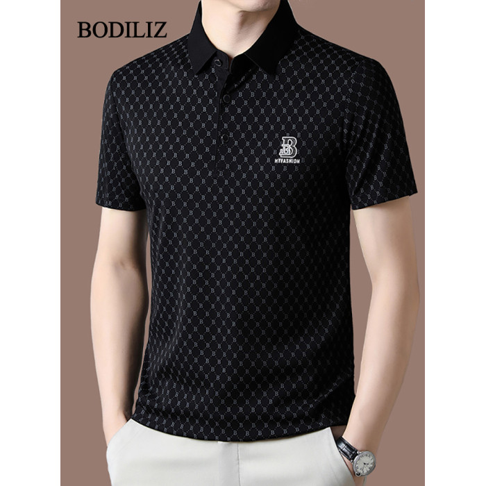 輕奢碎花黑色冰絲短袖t恤男商務polo衫男2025年中年翻領休閒上衣