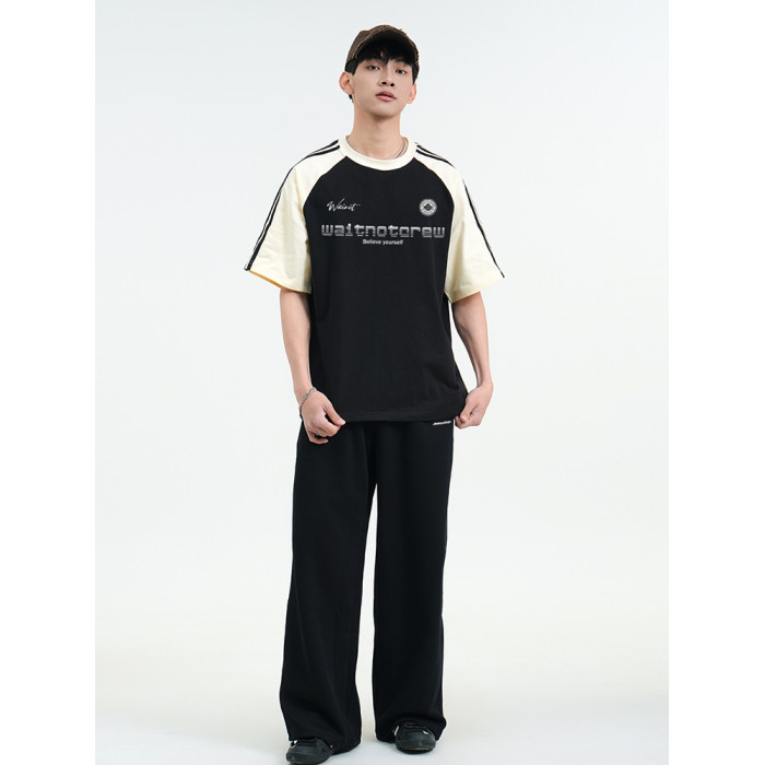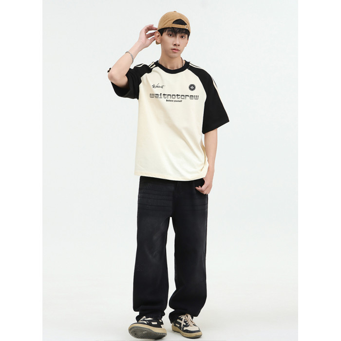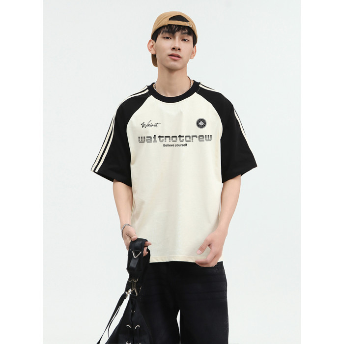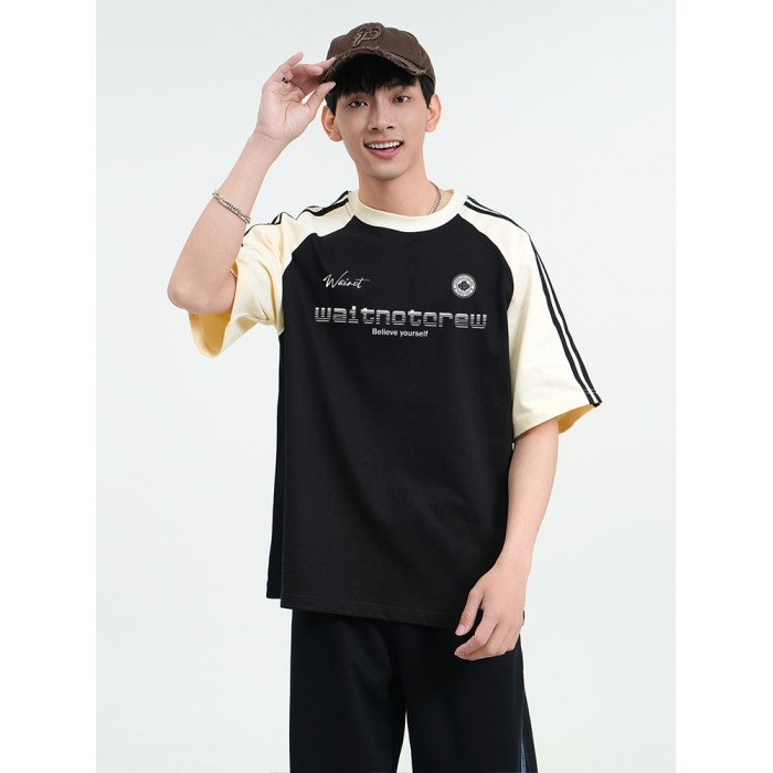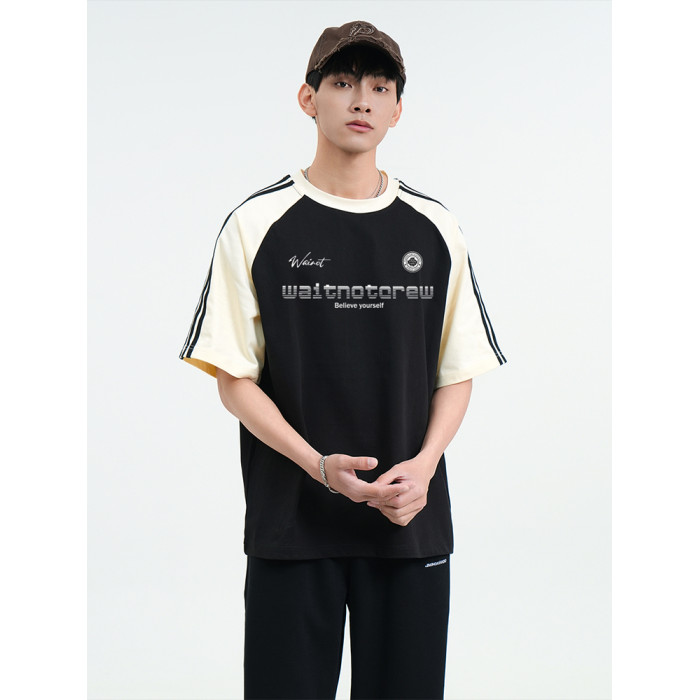 WAINOT美式街頭重磅純棉撞色插肩袖上衣夏季t恤短袖男t恤2025新款