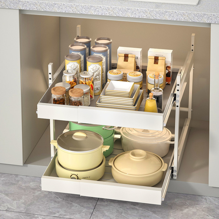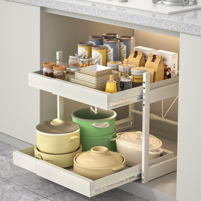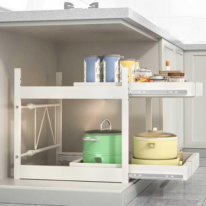 廚房可伸縮收納架免打孔抽屜式櫥櫃碗碟調料拉籃下水槽抽拉置物架