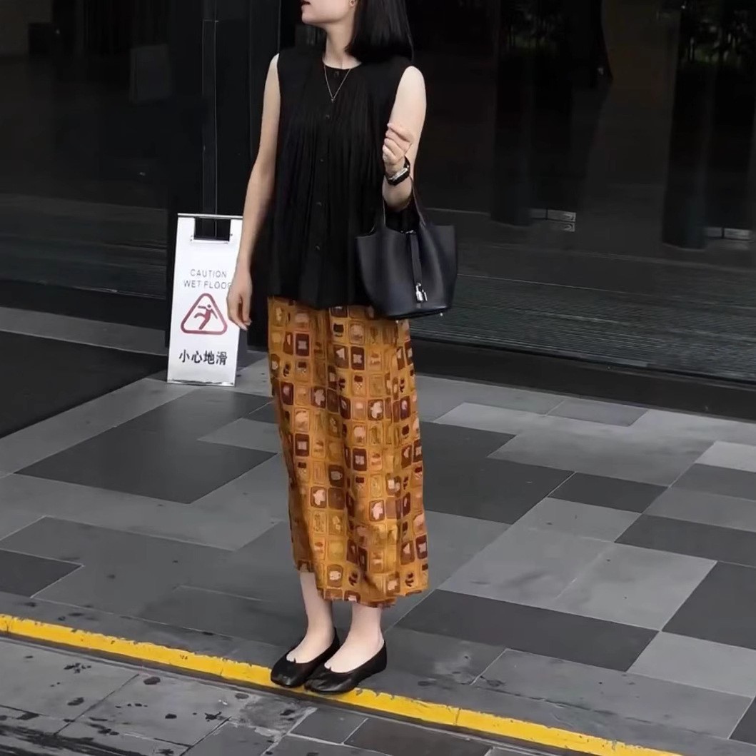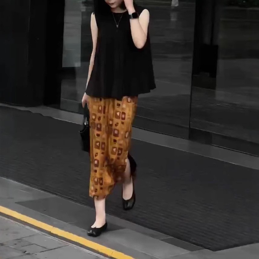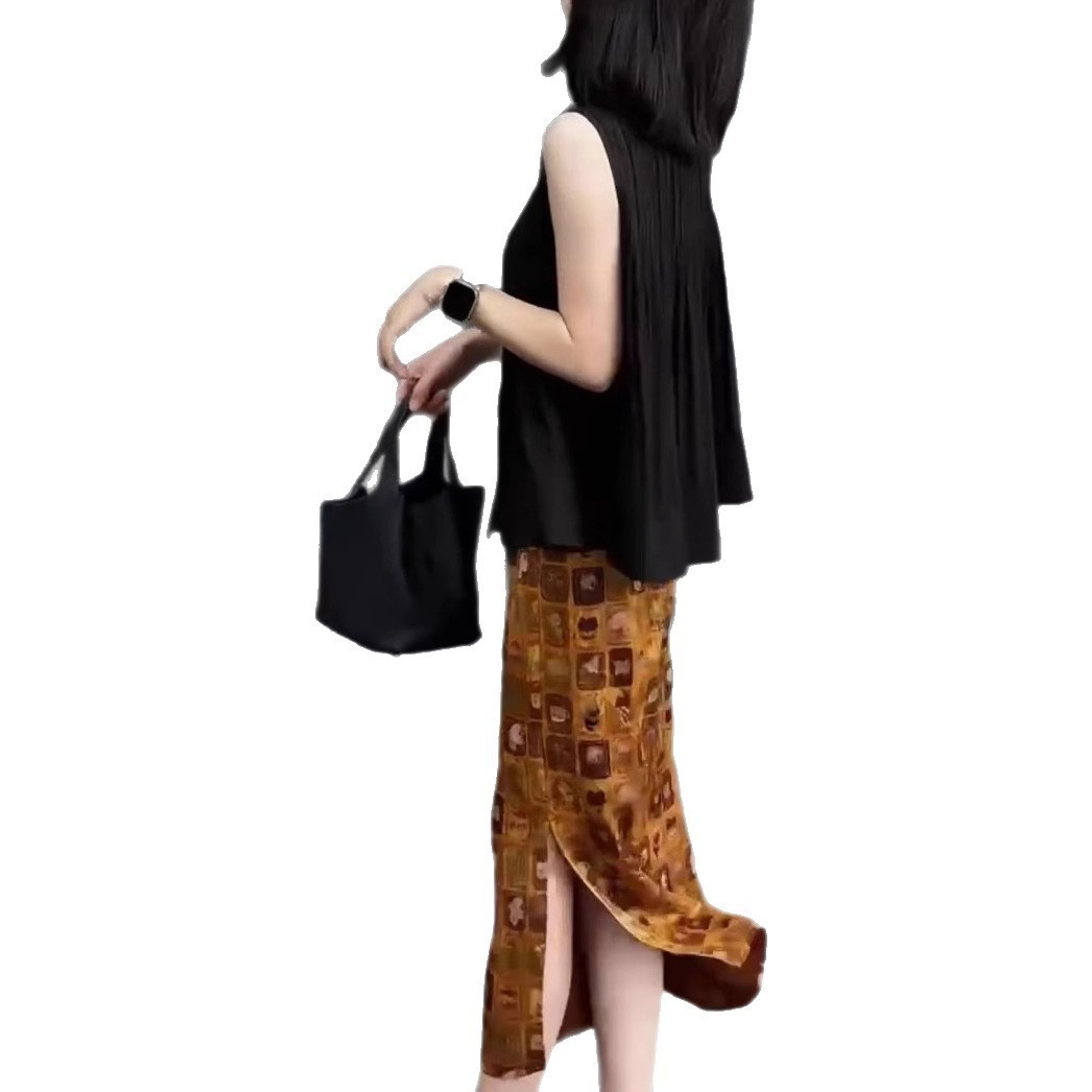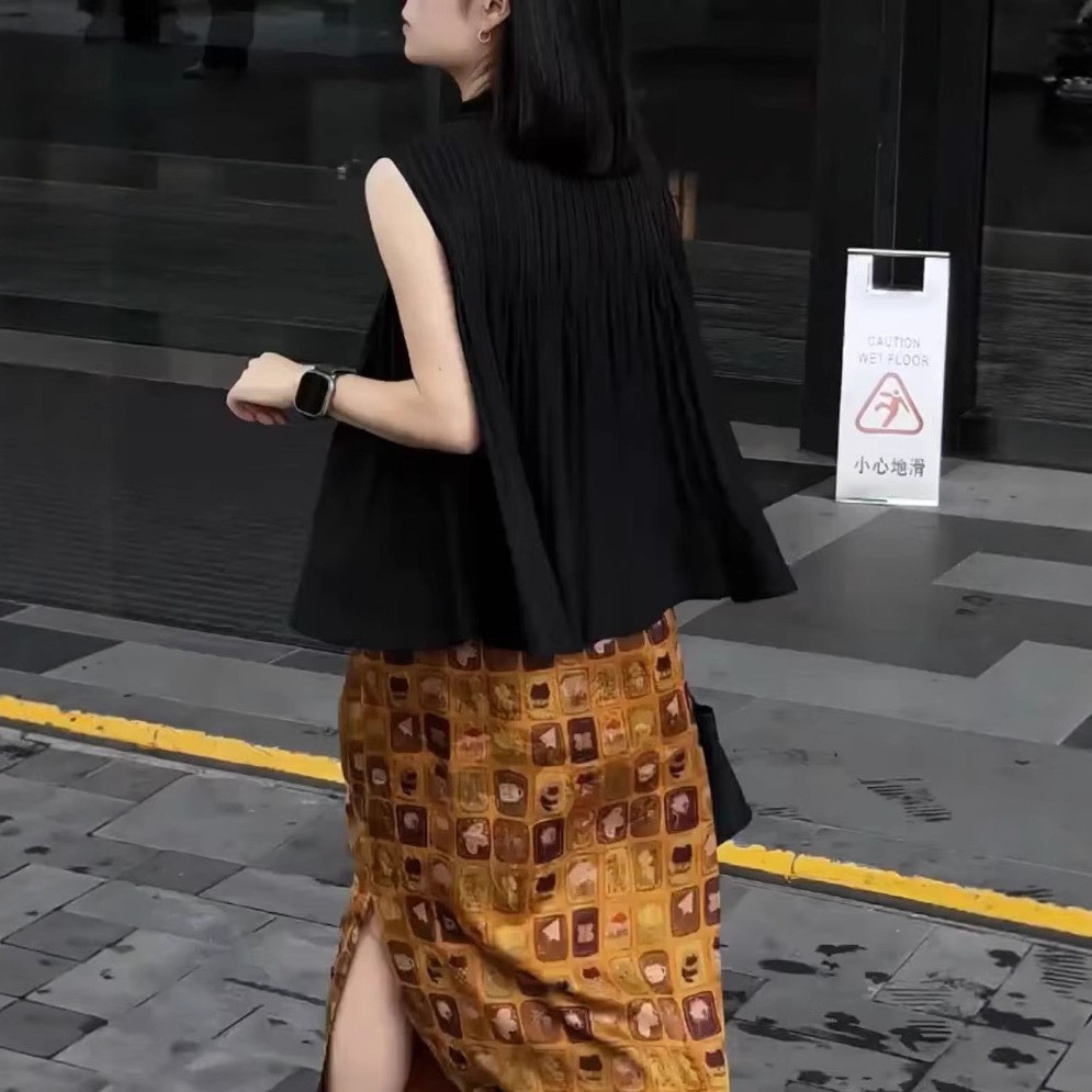 250513大愛美依緣2025夏季新款無袖壓褶寬松上衣復古開叉半身裙女