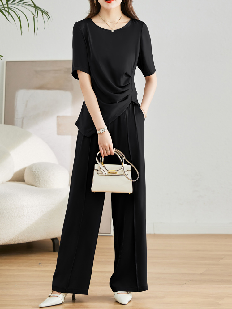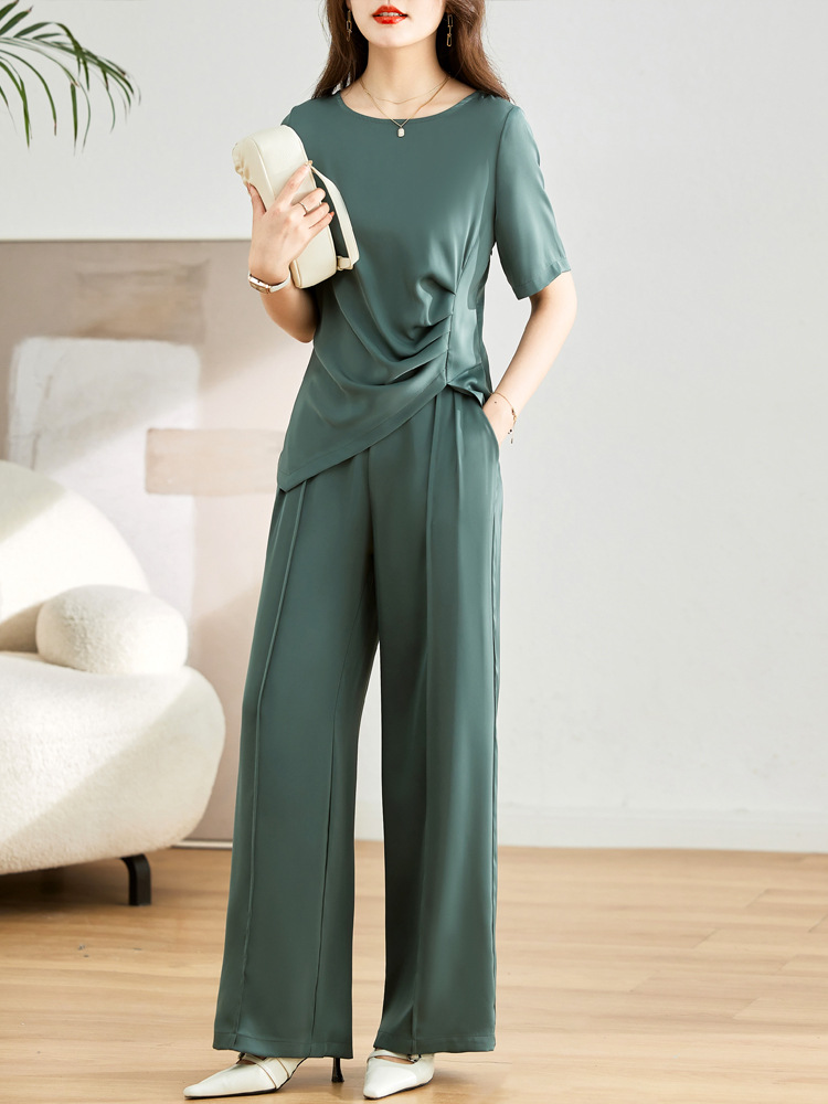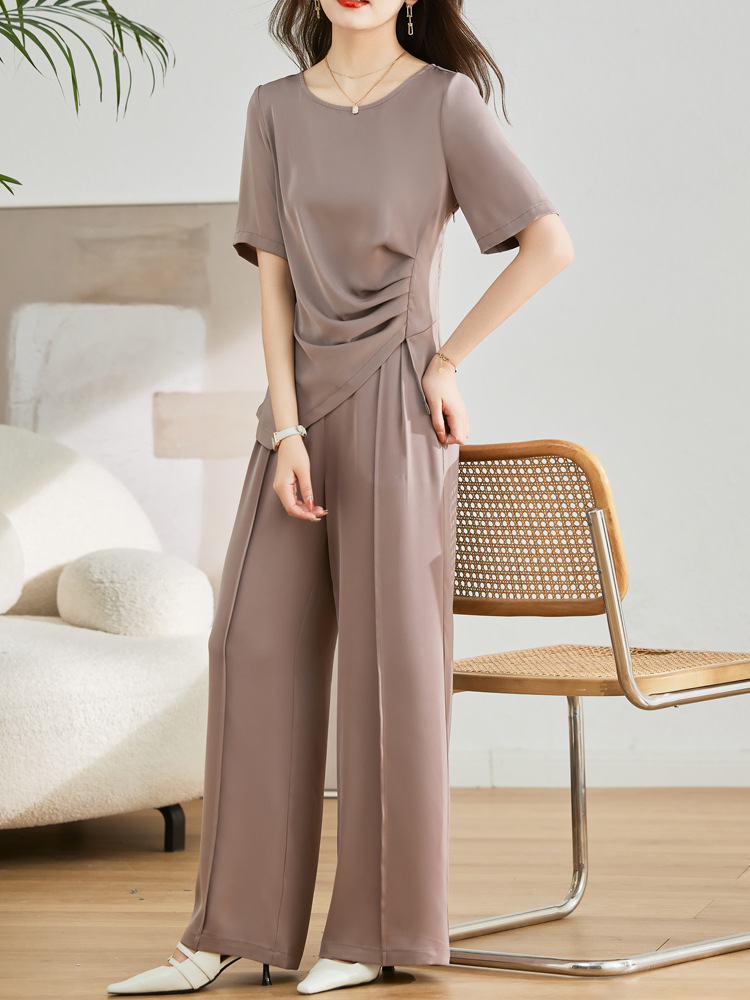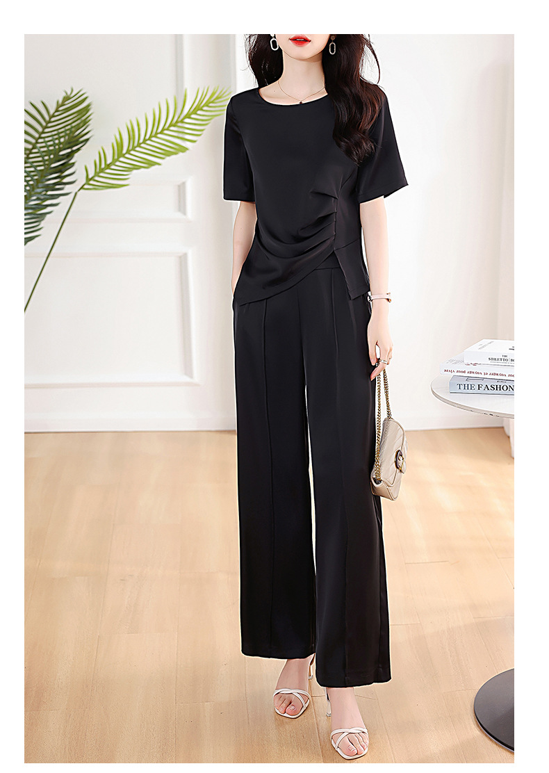 預售2841大碼女裝絲滑清涼垂感濶腿褲套裝胖mm緞面遮肚上衣兩件套