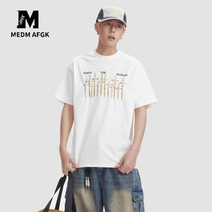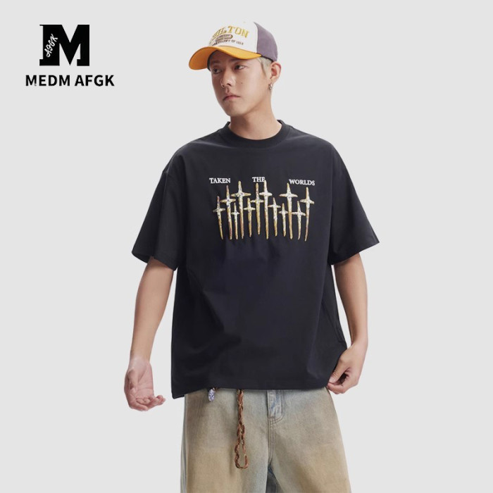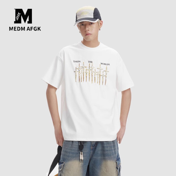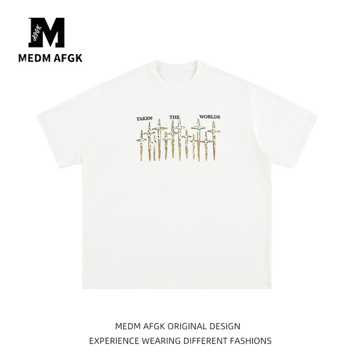 MEDM AFGK索羅娜美式復古十字架印花短袖男T恤250g重磅寬松圓領衣