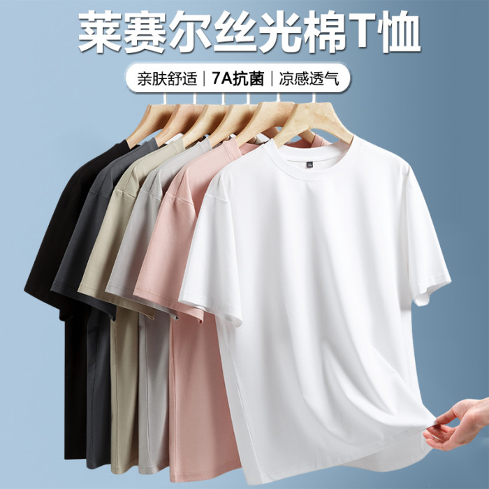 奧特萊斯萊賽爾天絲短袖T恤男夏季絲光棉男t恤抗菌純色冰絲體恤衫