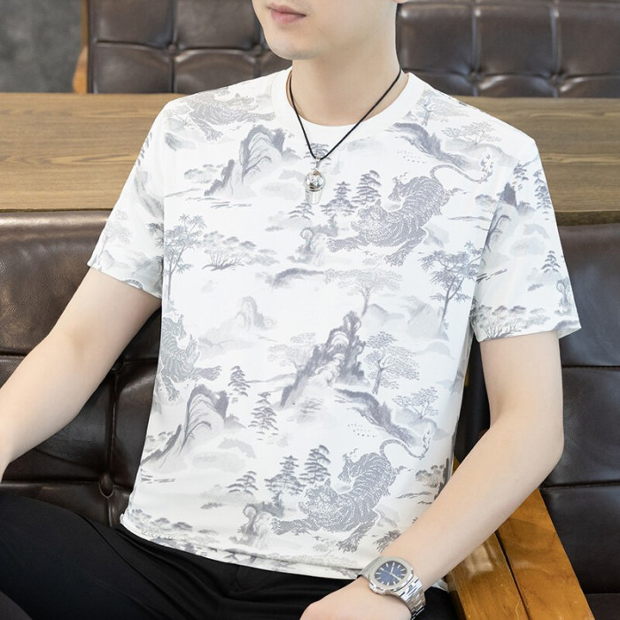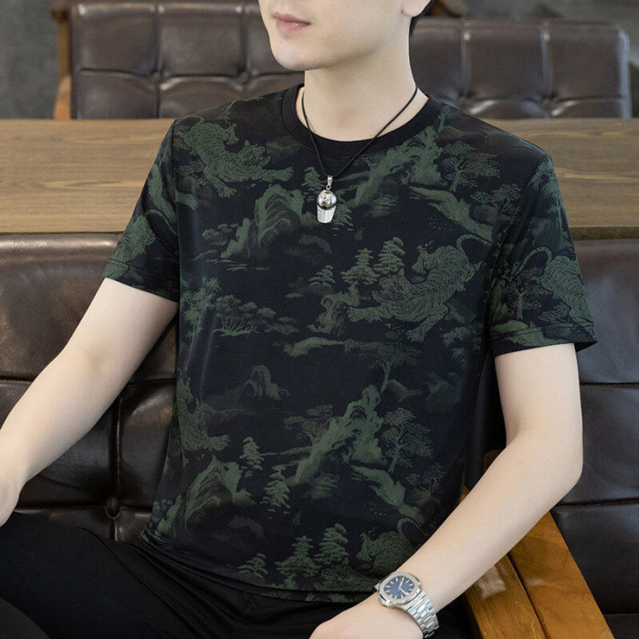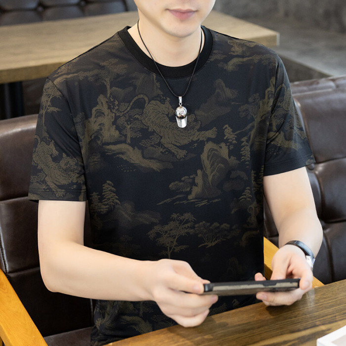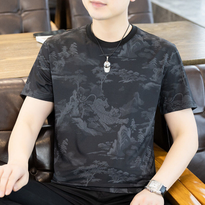 高級短袖t恤男士夏季新款時尚休閒體恤潮流半袖圓領青年冰絲男T恤