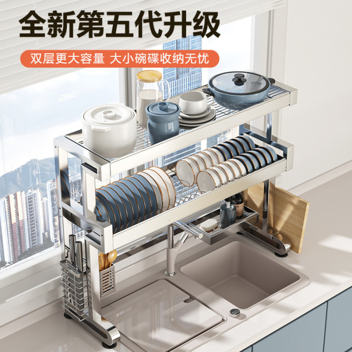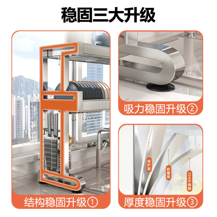 雙層304不鏽鋼【可伸縮+全套66cm+主架+刀架+筷子筒+砧板架+潔具架】