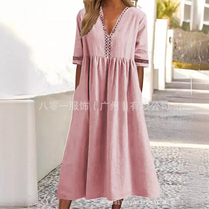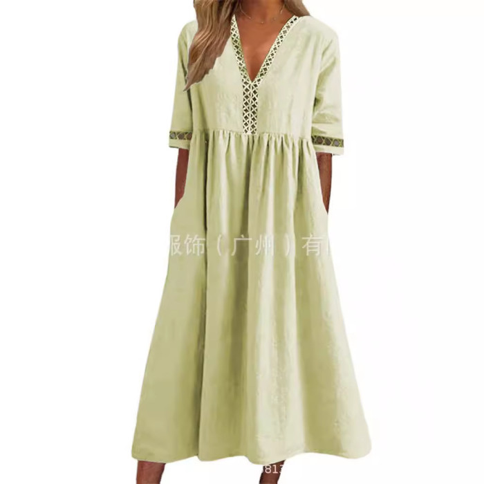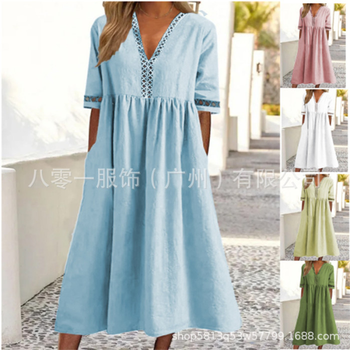2023歐美春夏純色短袖花邊V領收腰連衣裙