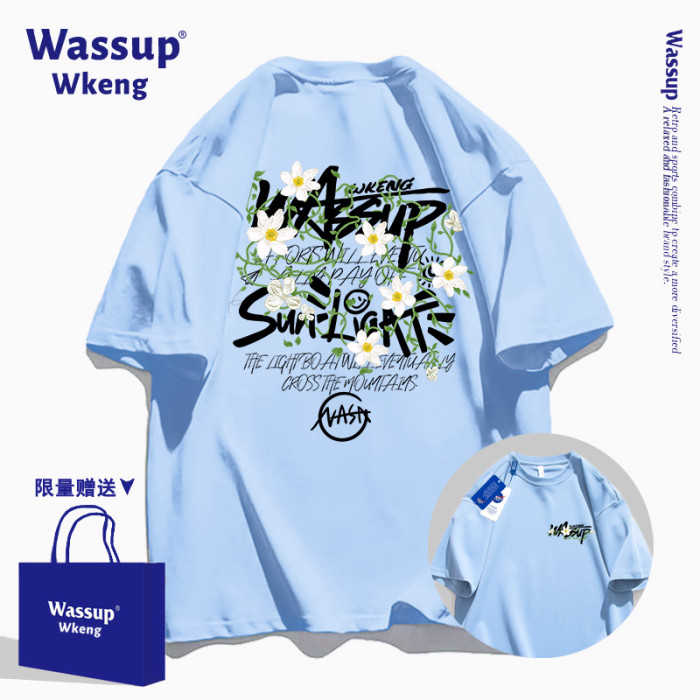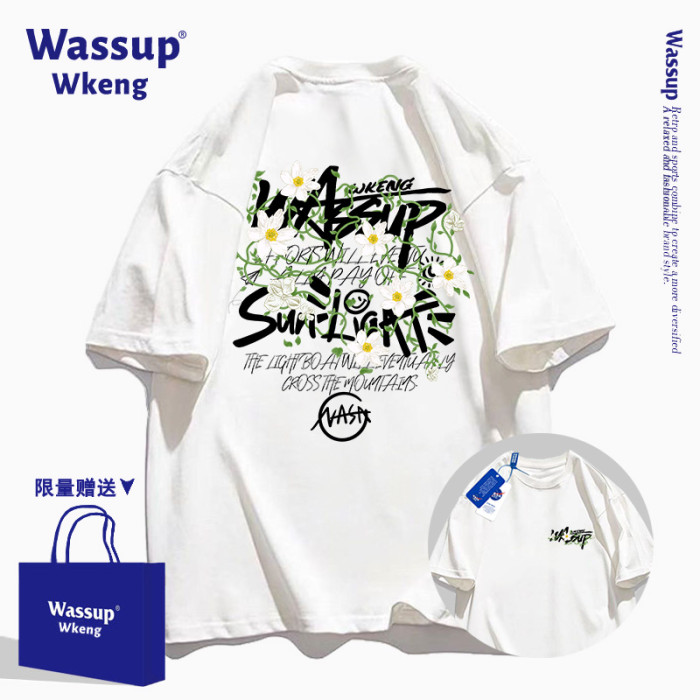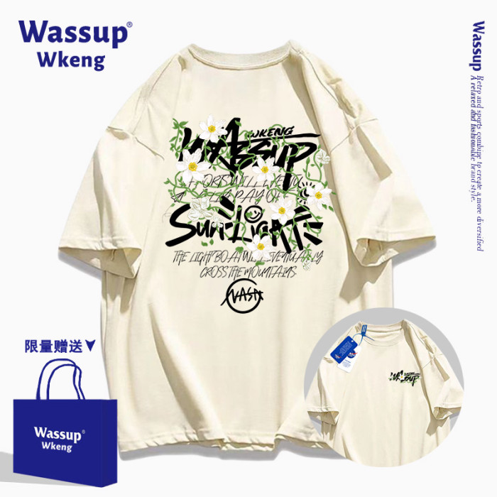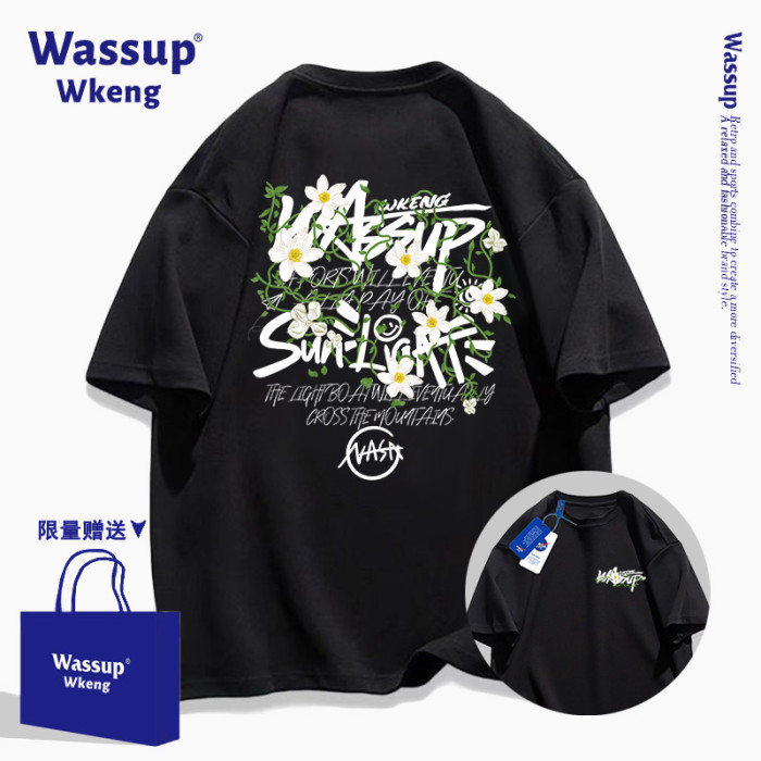 wassup聯名美式潮牌黑色短袖男T恤2025新款夏季寬松純棉印花上衣