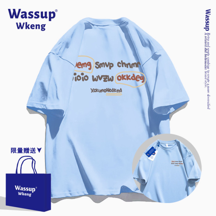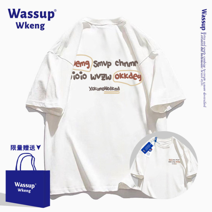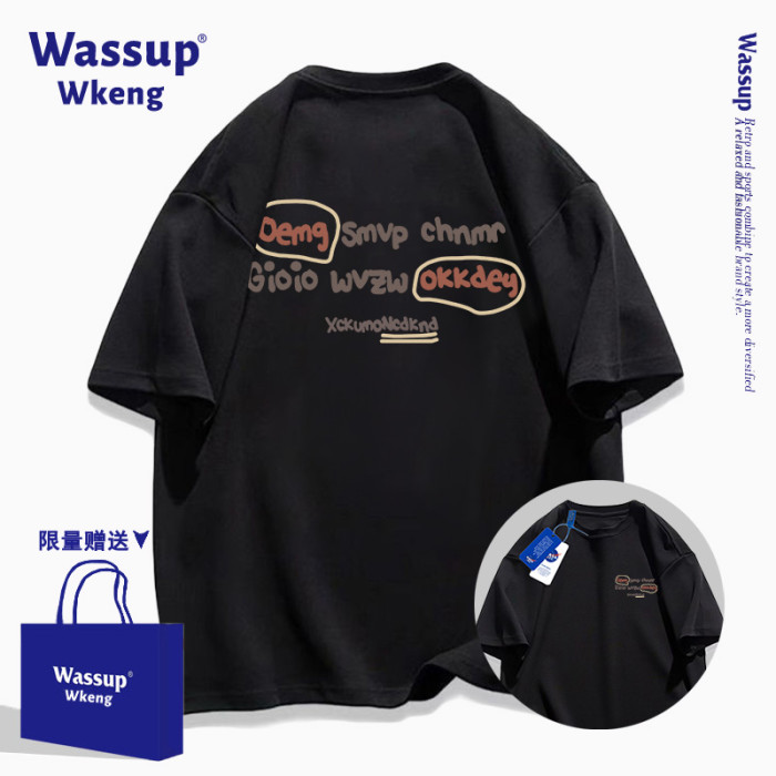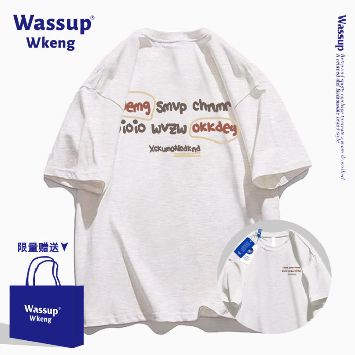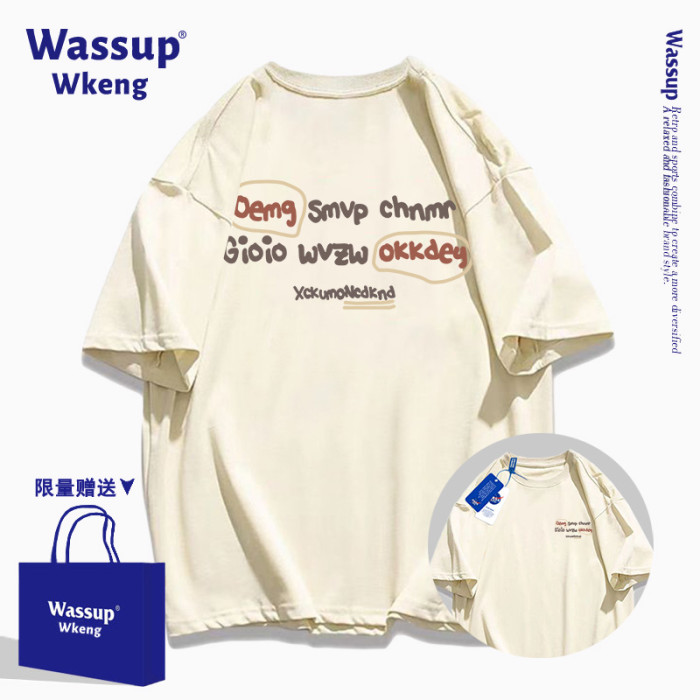 wassup聯名杏色短袖男t恤2025新款夏季美式潮流青少年寬松上衣男