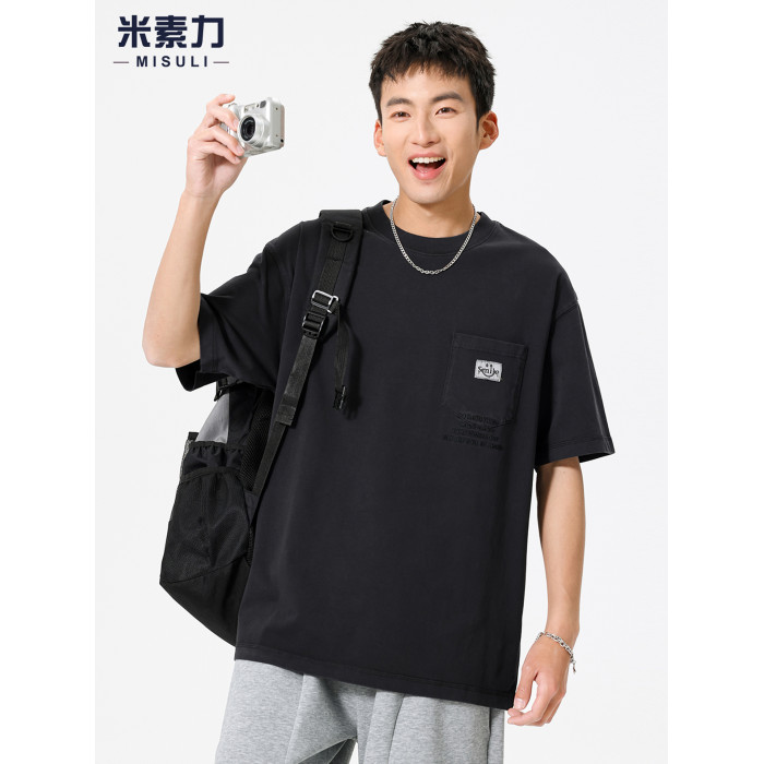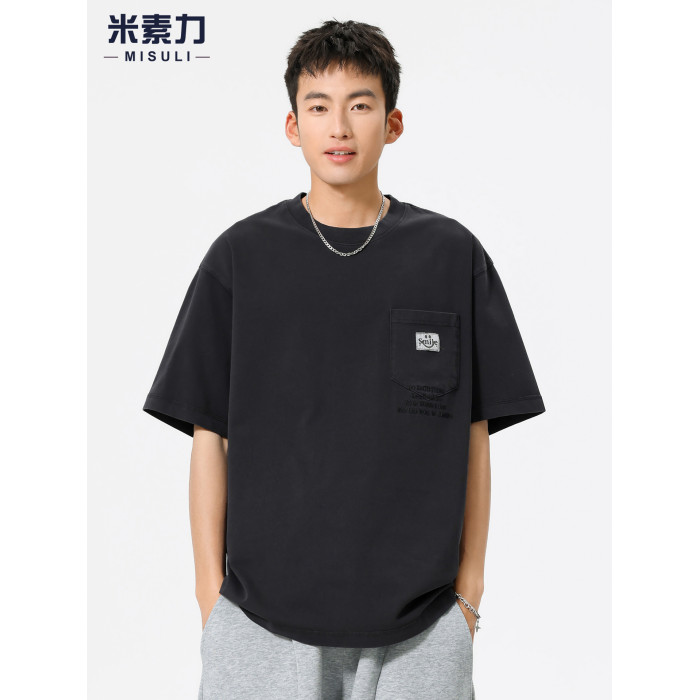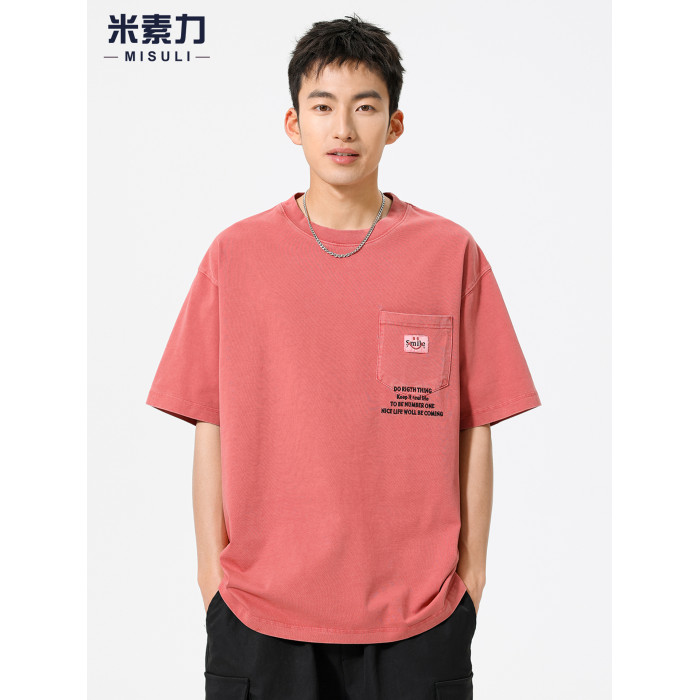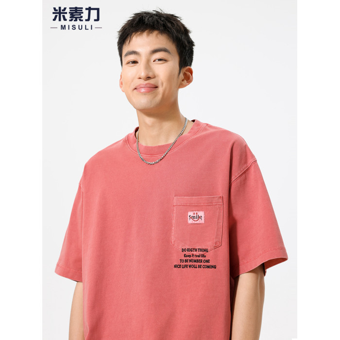 高級純棉刺綉短袖男T恤2025新款美式復古重磅水洗做舊紅色上衣潮