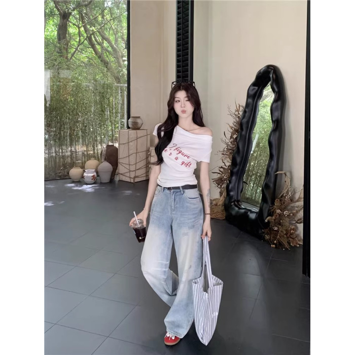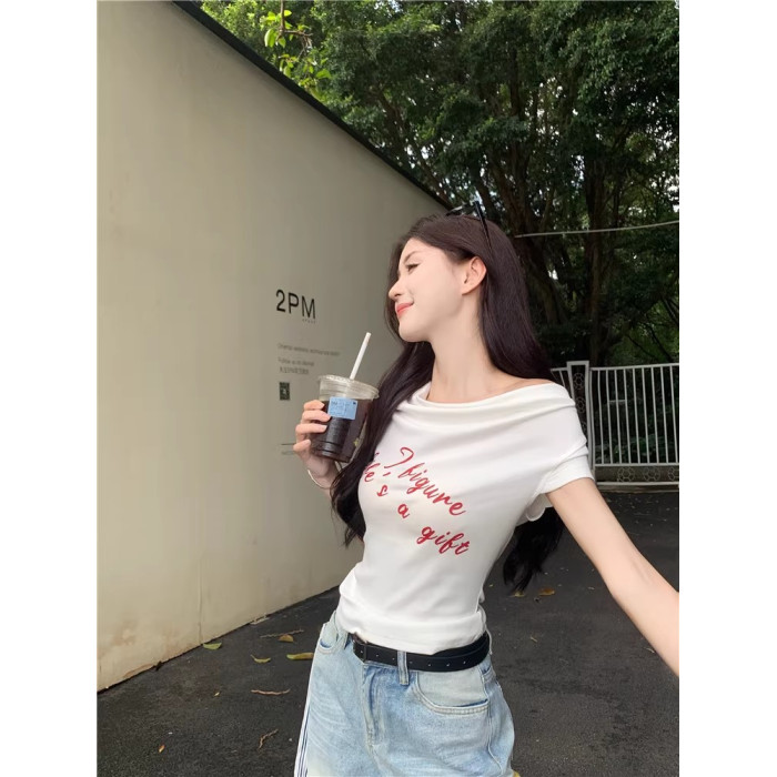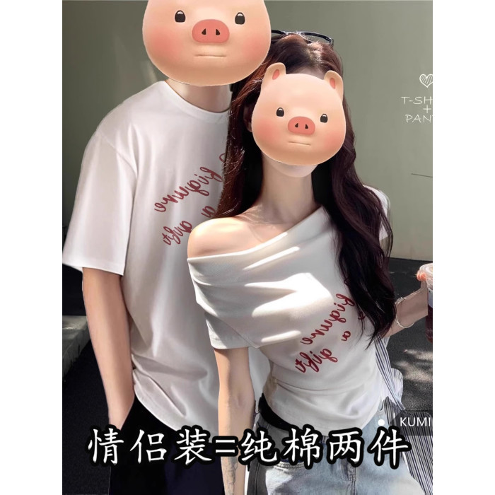 ins超火一字肩情侶裝短袖夏季辣妹修身斜肩短款女寬松男t恤兩件裝