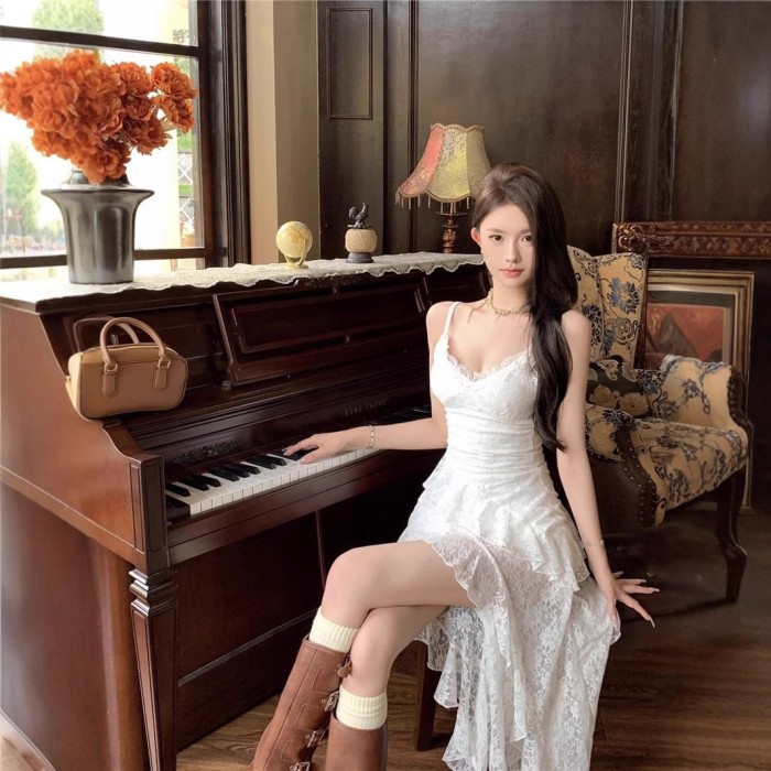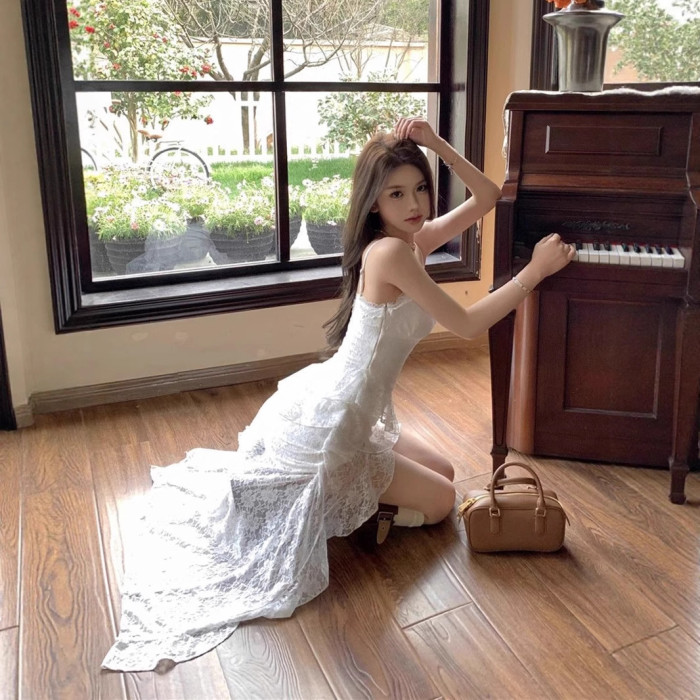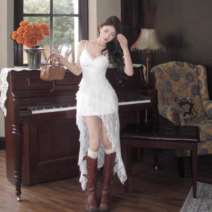 法式蕾絲v領吊帶連衣裙旅遊夏季度假不規則裙子收腰中長裙