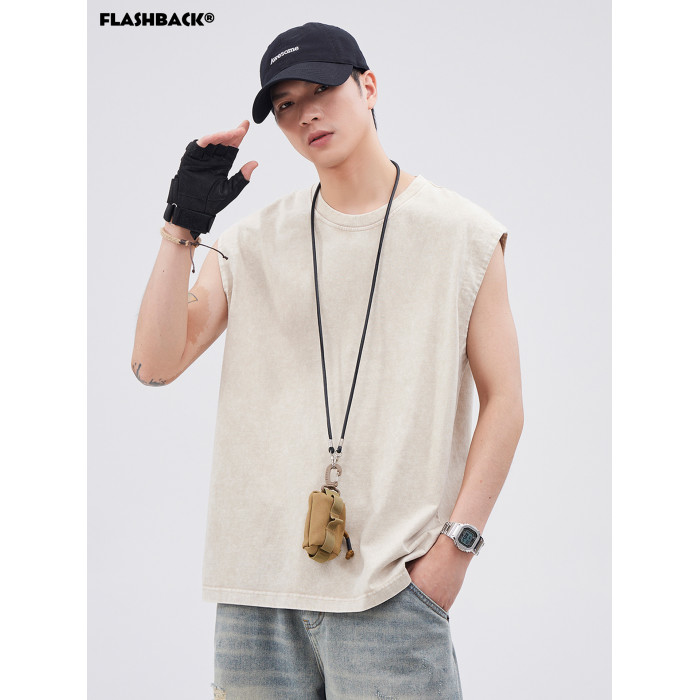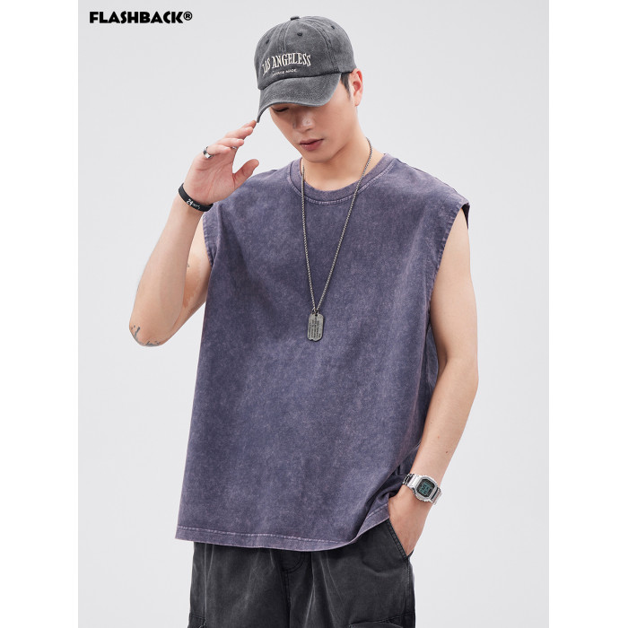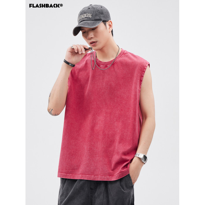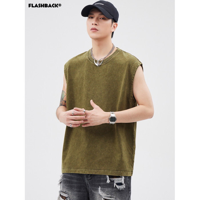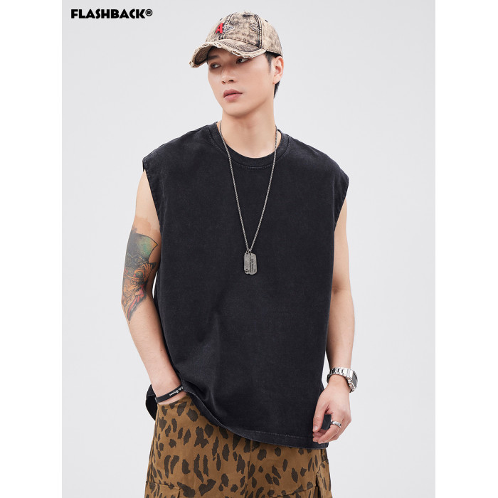 夏季新款美式重磅竹節棉做舊水洗寬松潮流運動健身無袖背心男T恤