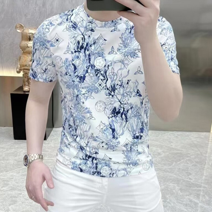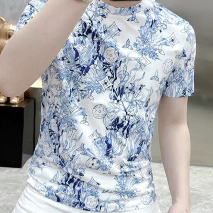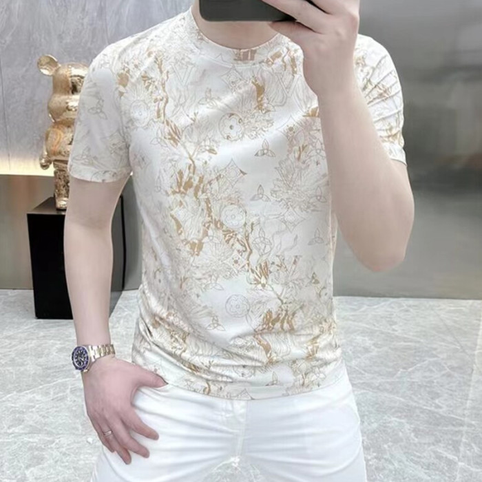 2025年夏季新款歐貨潮牌重工印花短袖男T恤時尚百搭修身圓領上衣
