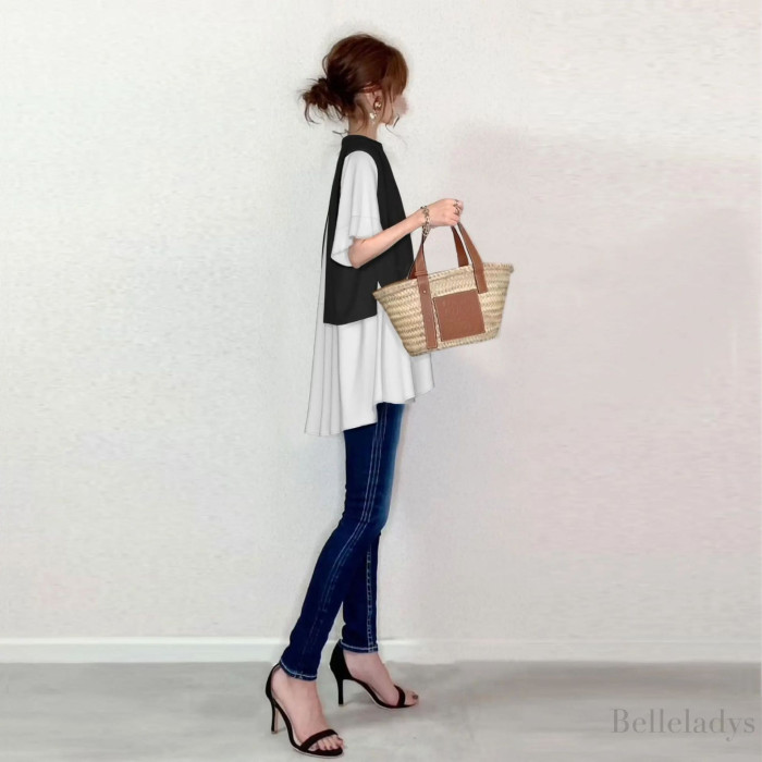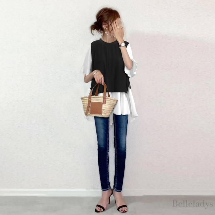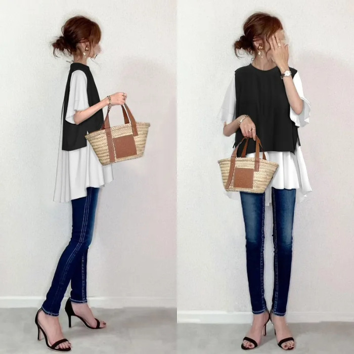 日系2024夏裝假兩件拼接圓領氣質氣質寬松時尚套頭短袖上衣潮