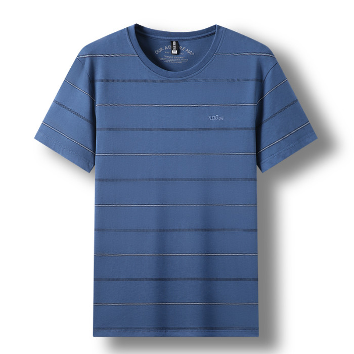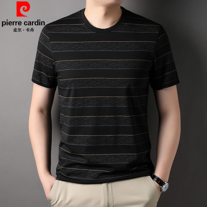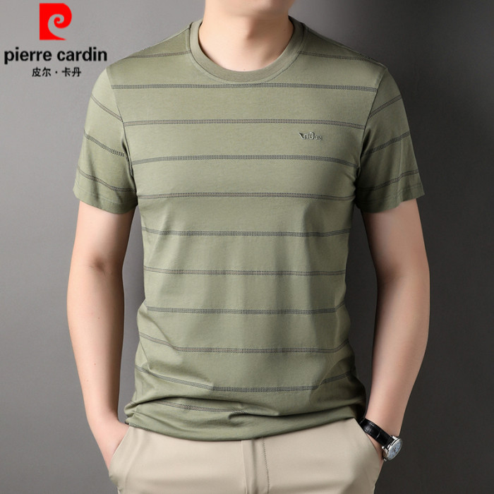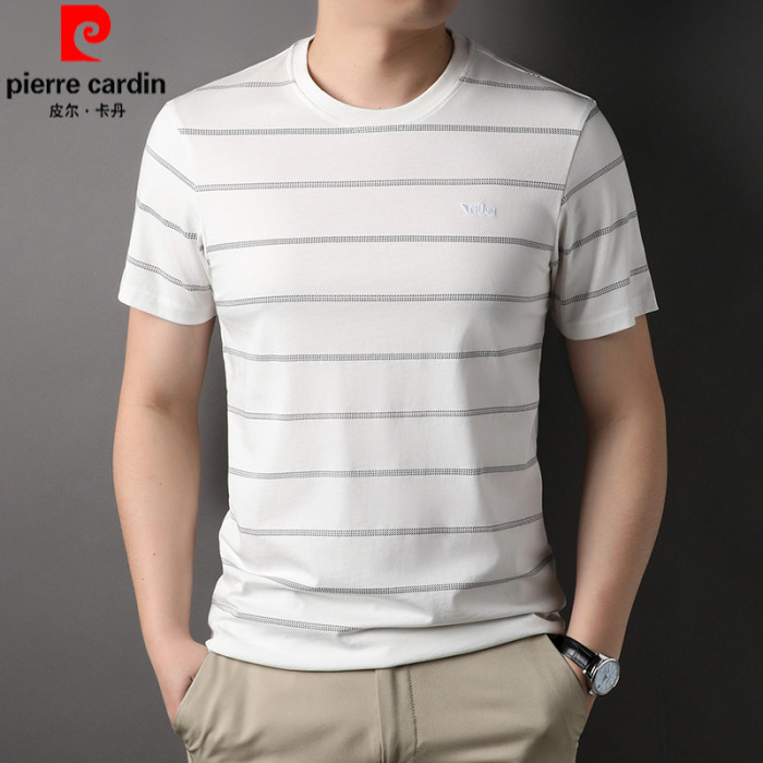 皮爾卡丹奢侈品牌男t恤短袖純棉圓領刺綉橫條紋父親高級運動上衣