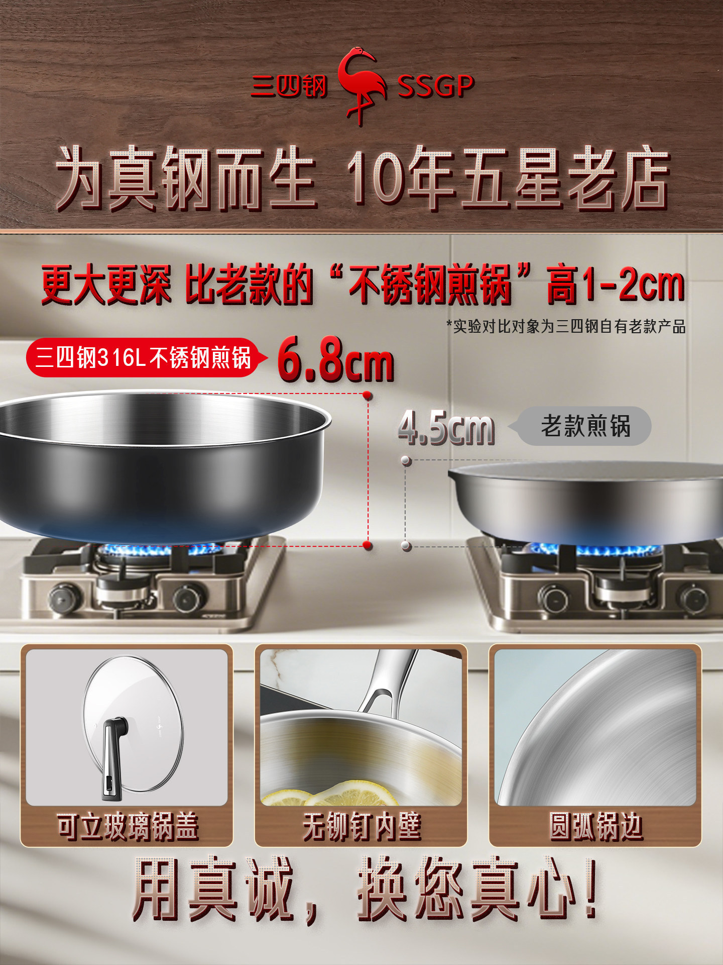 三四鋼®316L不鏽鋼煎鍋食品接觸級無塗層瓦斯爐家用聚油平底鍋