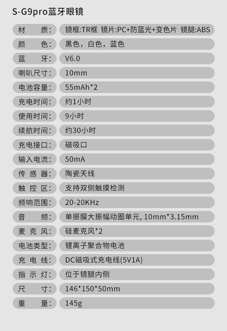 | 包裝清單 | 眼鏡*1 磁吸充電線*1 說明書*1 擦鏡布*1 |