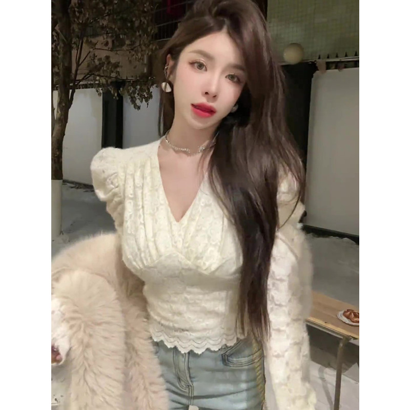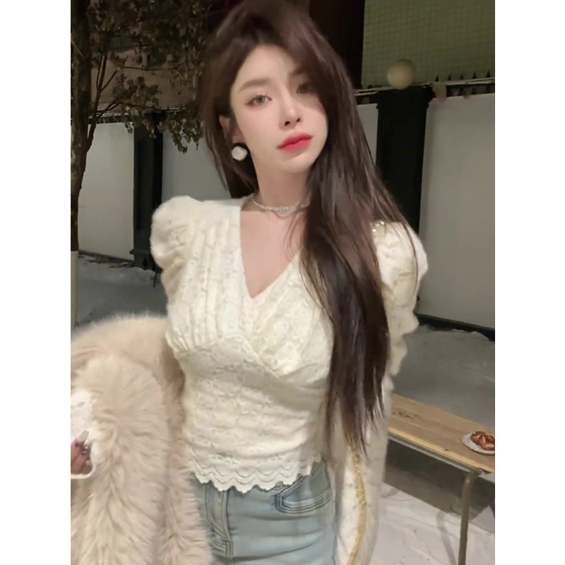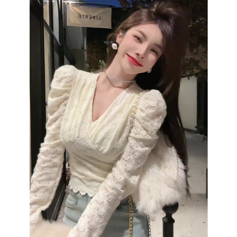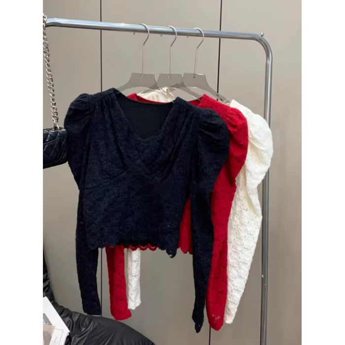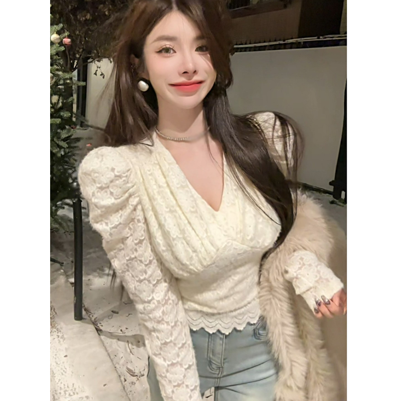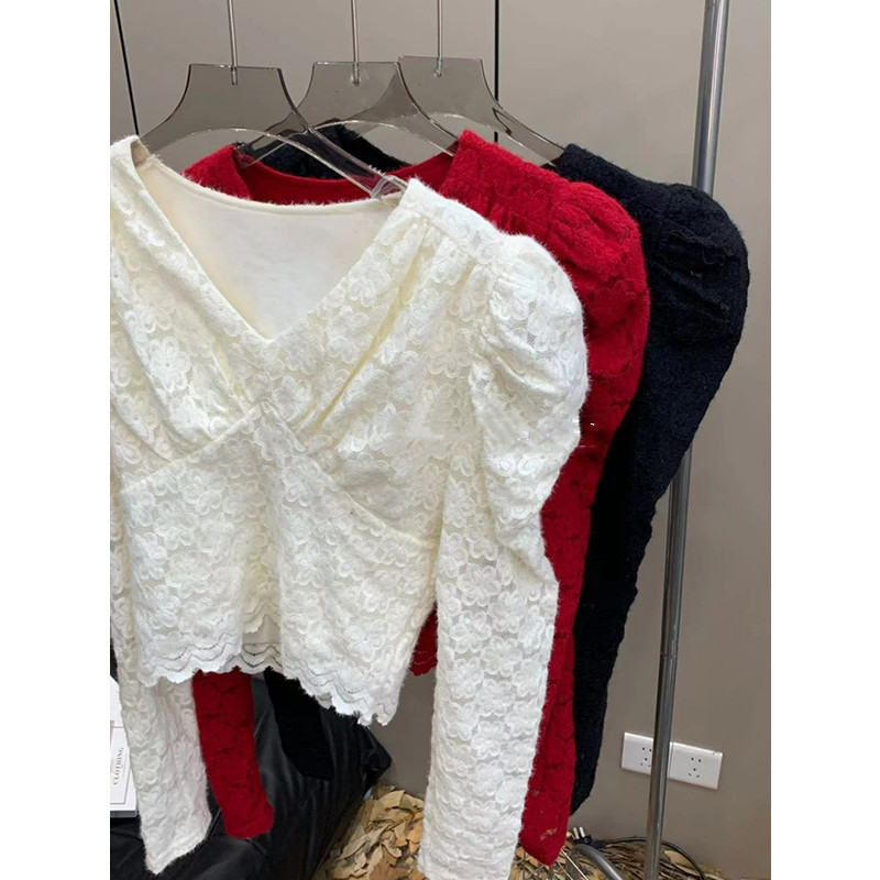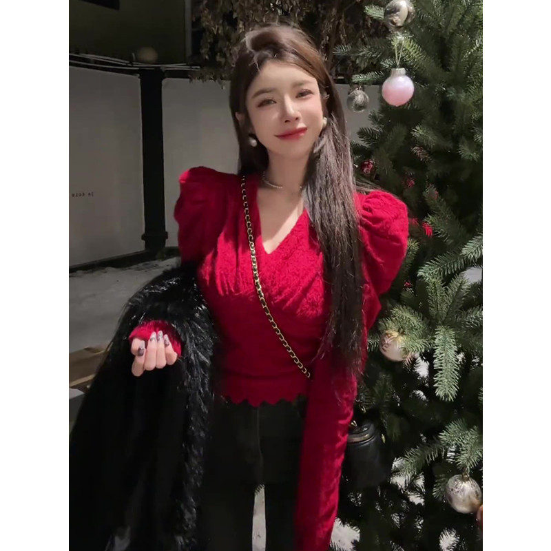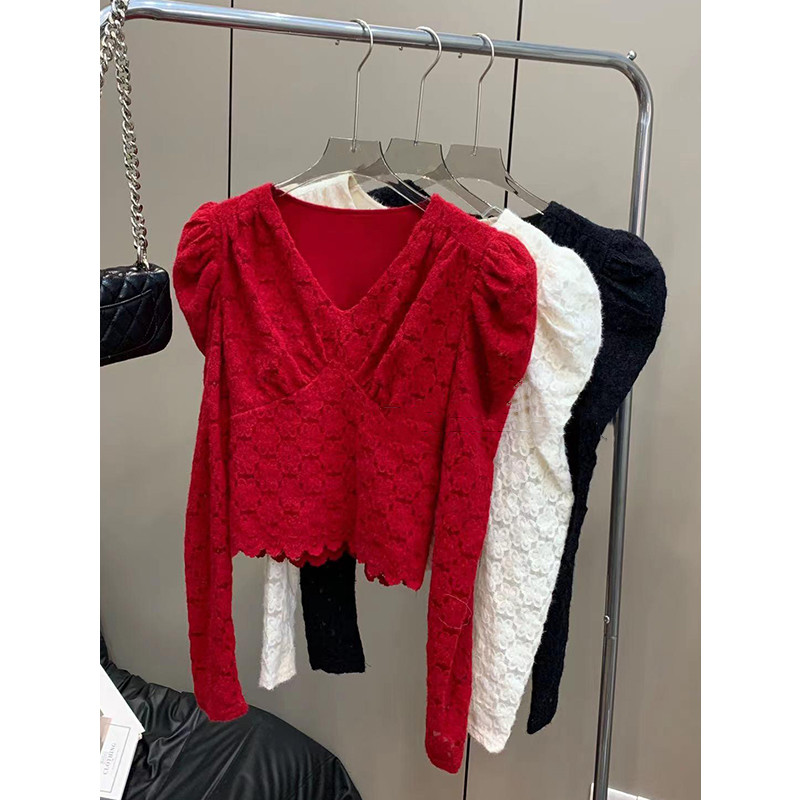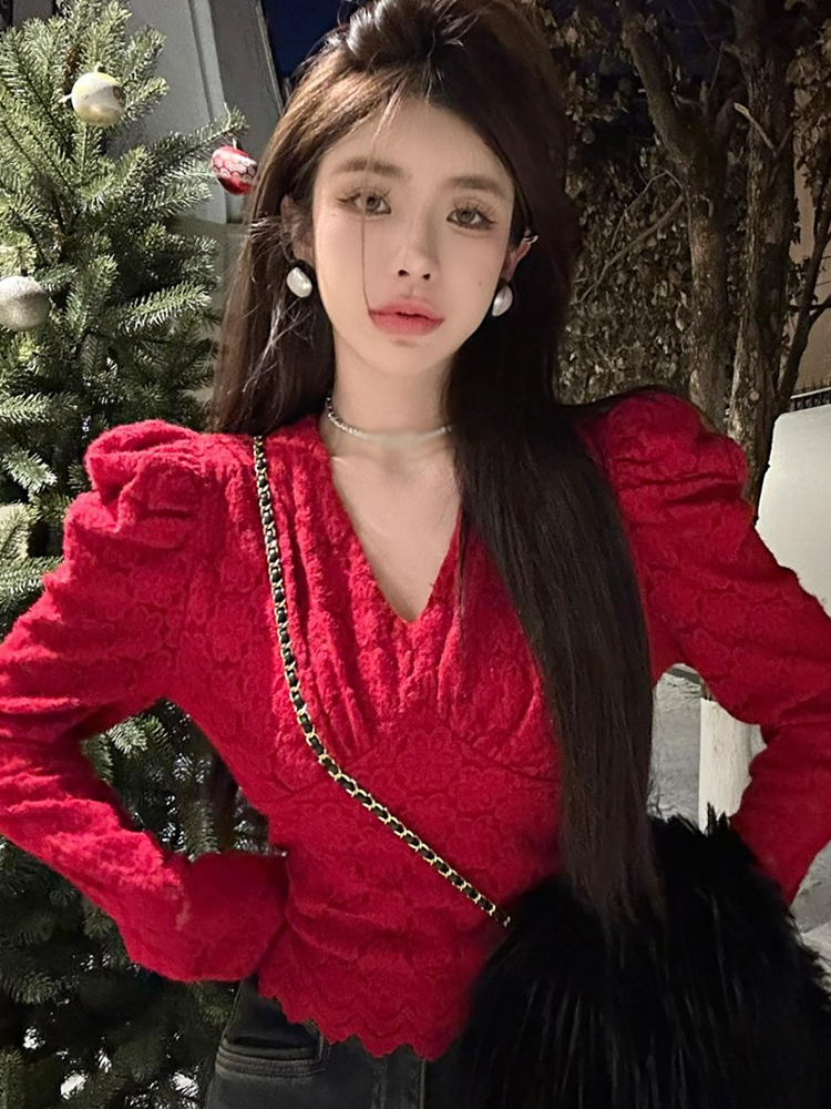 聖誕紅色v領加絨加厚蕾絲衫女秋冬季新款法式氣質修身泡泡袖上衣
