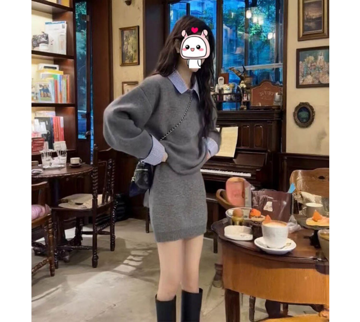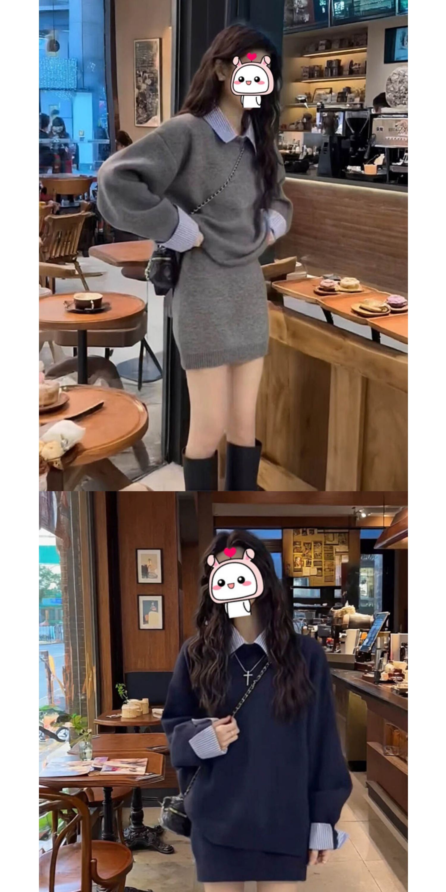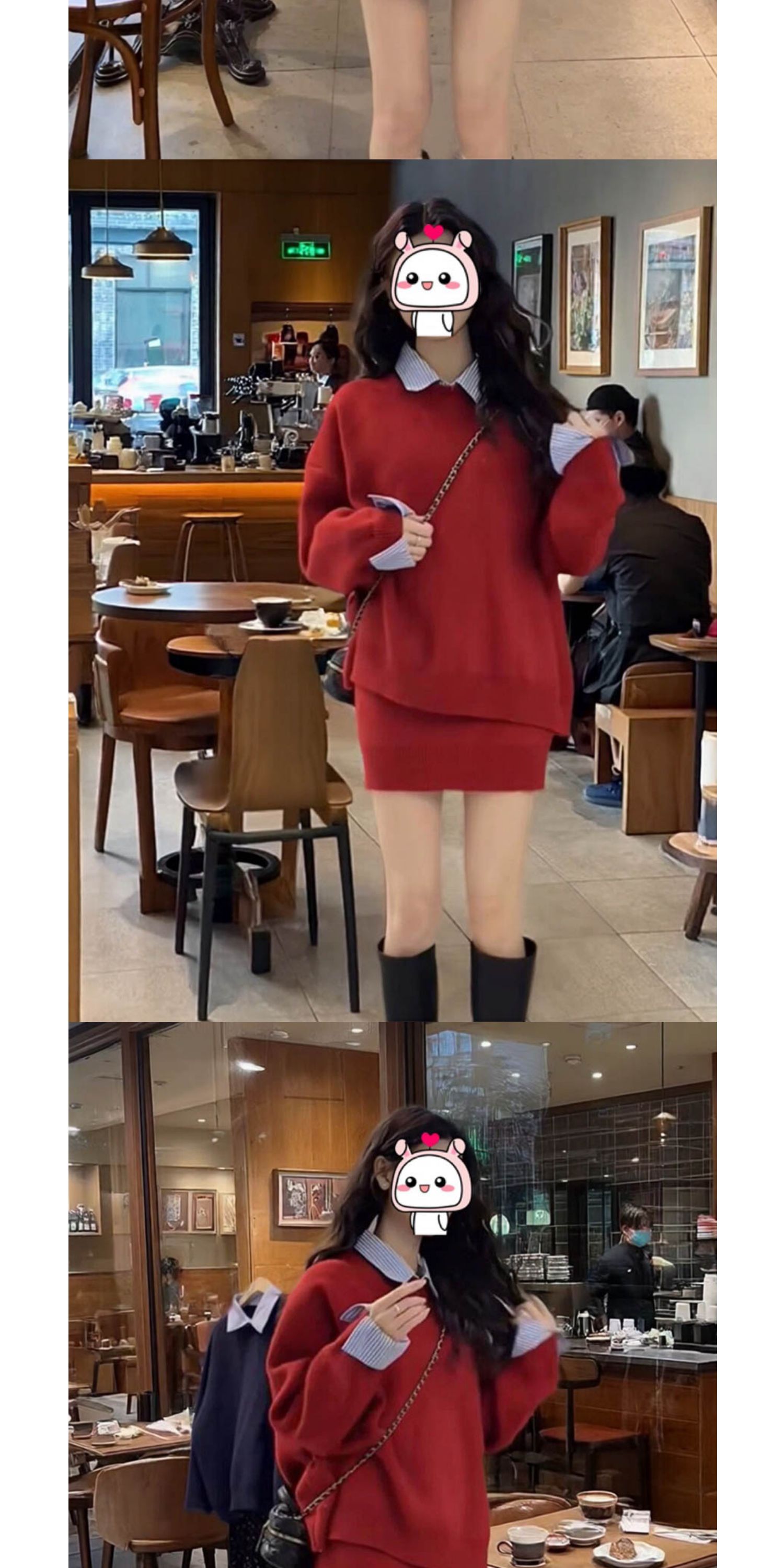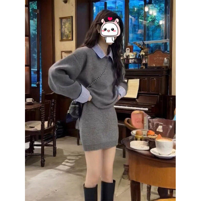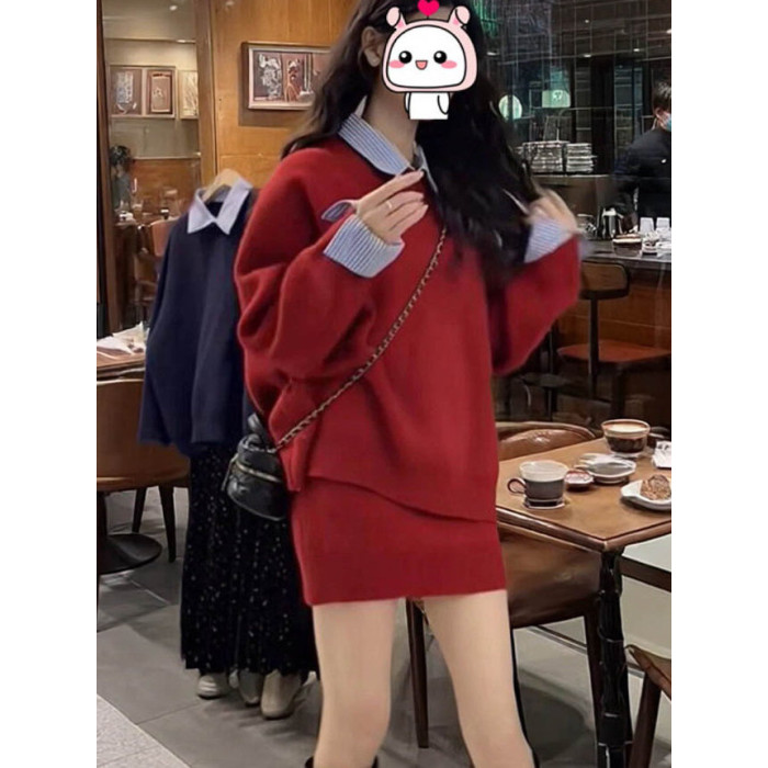 女秋冬韓系聖誕紅色慵懶風休閒拼接襯衣領設計感毛衣高腰短裙套裝
