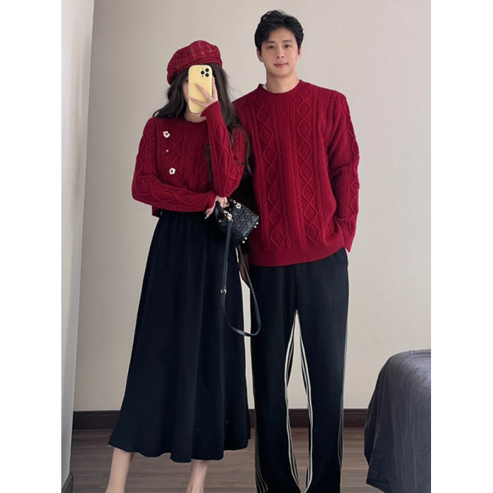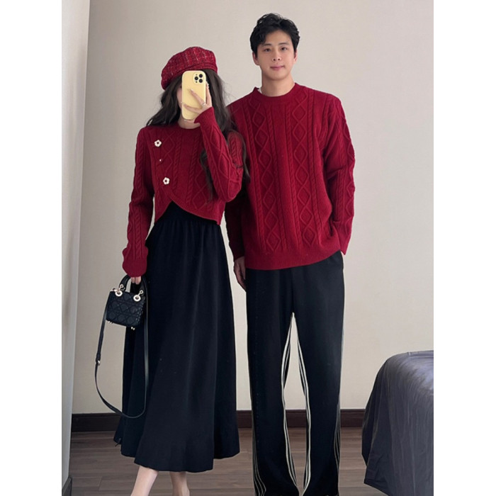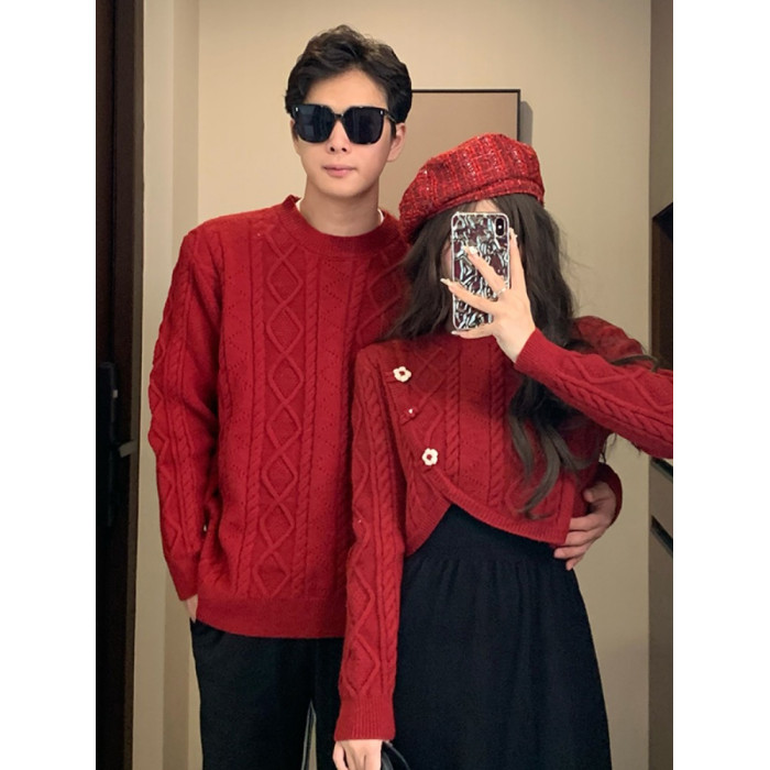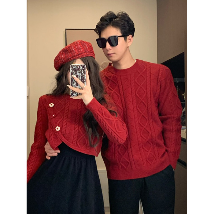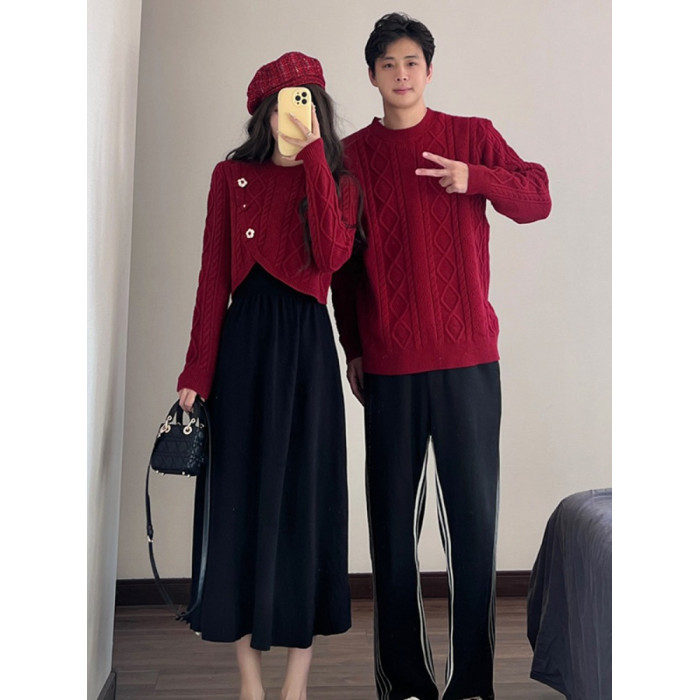 高級感情侶裝秋冬裝2025新款過年聖誕紅色毛衣連衣裙套裝一裙一衣