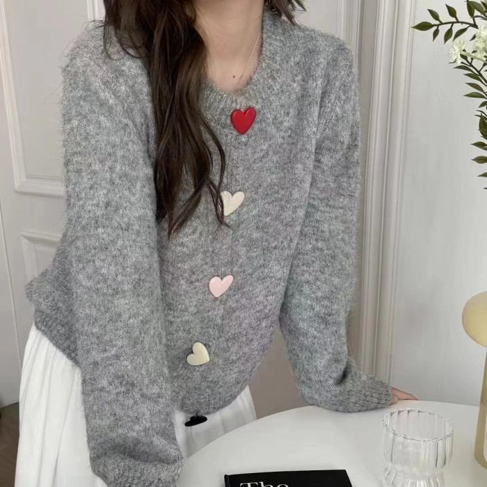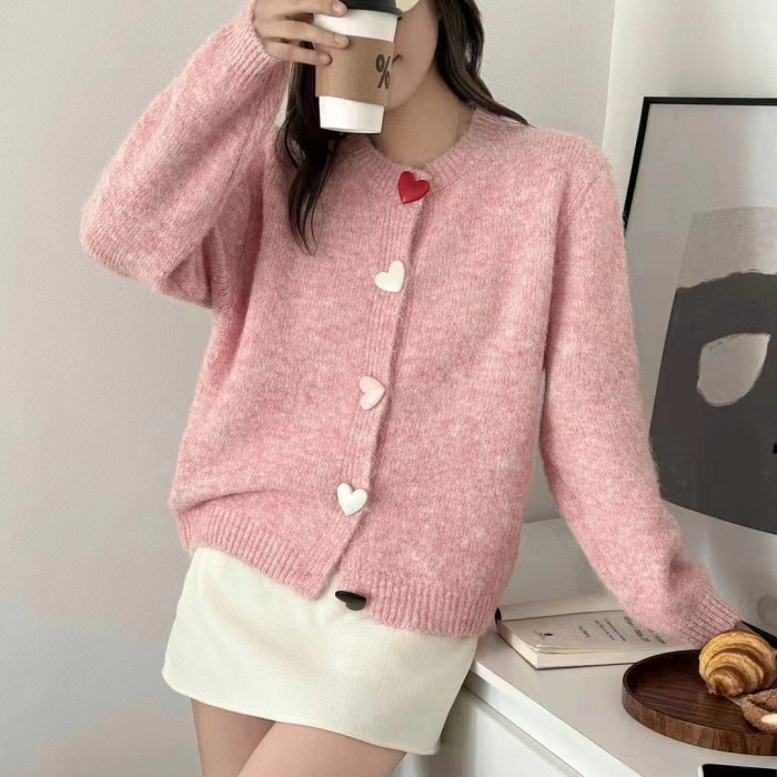 秋冬新韓版簡約圓領毛衣女外套彩色釦百搭寬鬆軟糯針織衫上衣