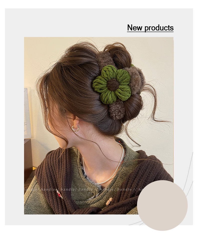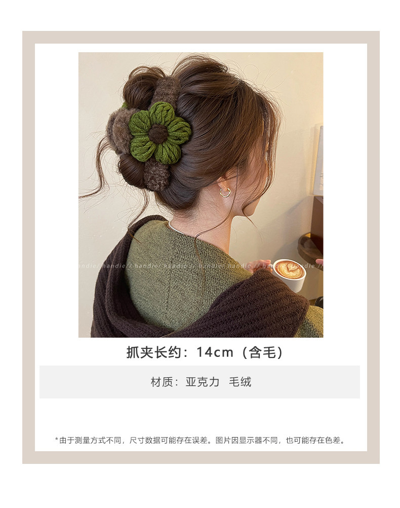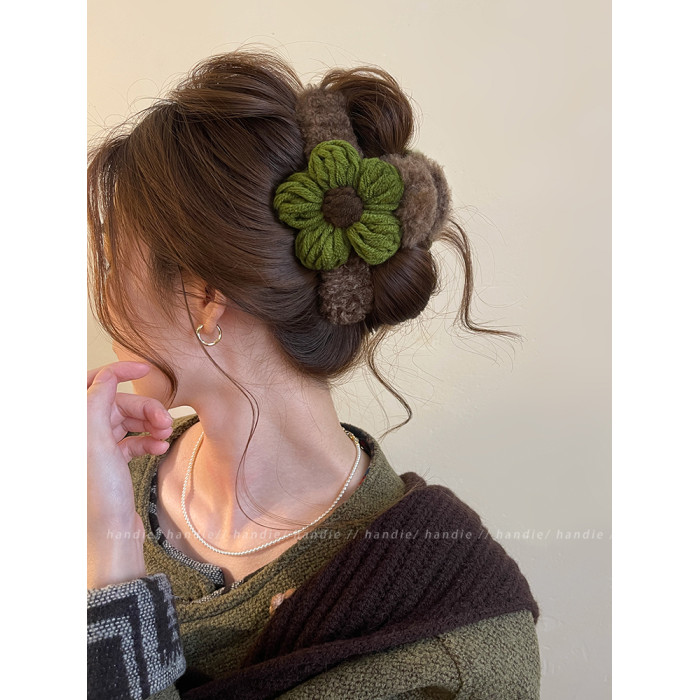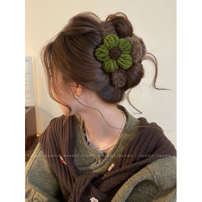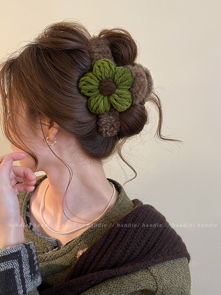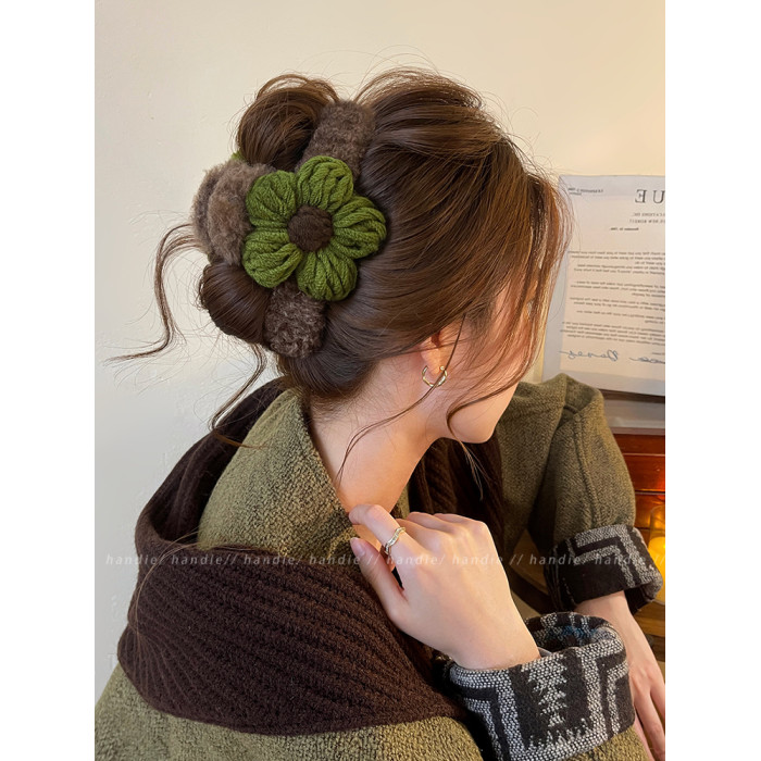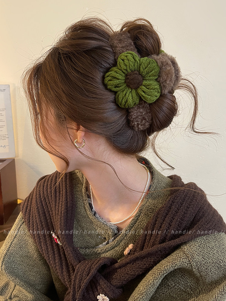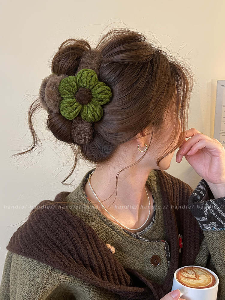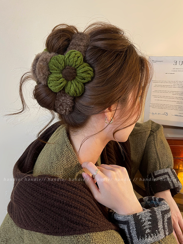 秋冬毛線花朵髮夾抓夾女高級感2025新款後腦勺盤髮鯊魚夾大號髮飾