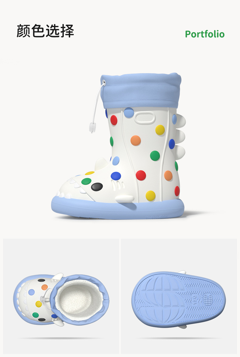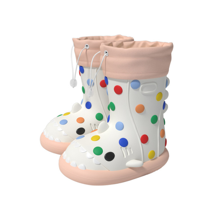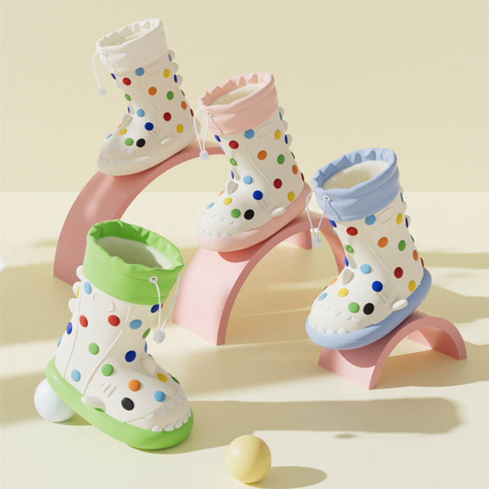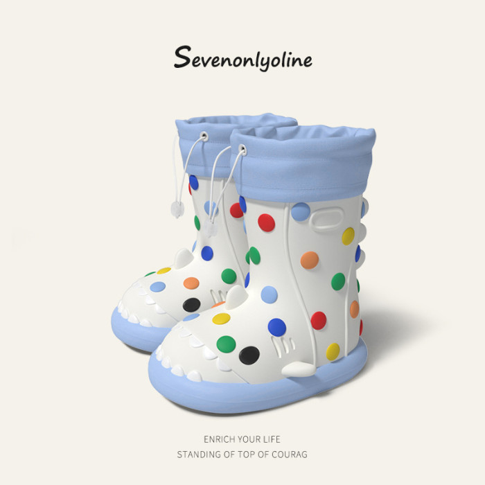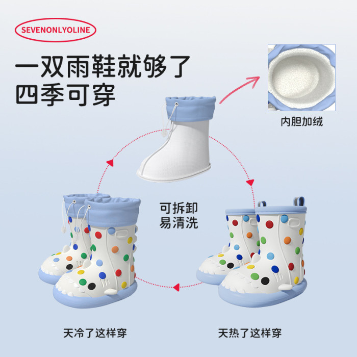 新款秋冬季束口加絨彩虹豆內裡可拆卸男女童鯊魚防水四季可穿雨靴