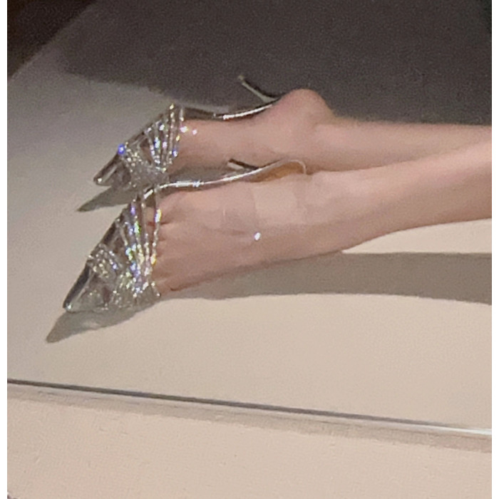 真的很絕~ 好氣質!尖頭水鑽氣質細跟性感涼拖鞋