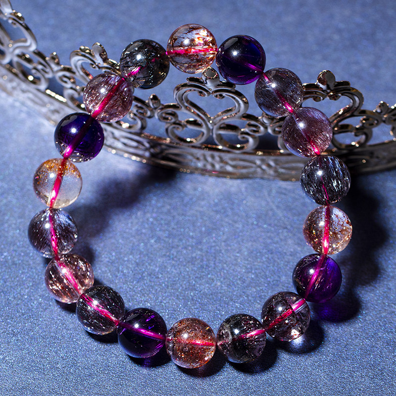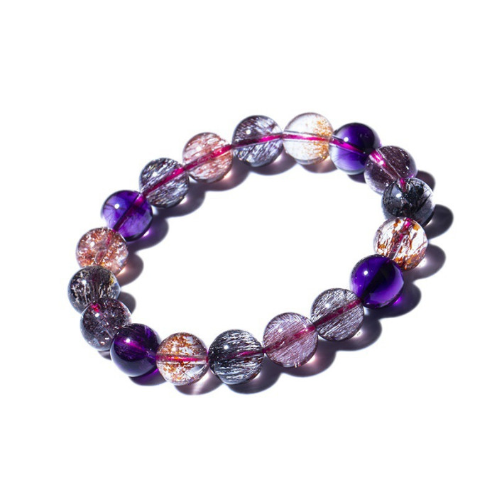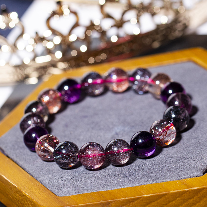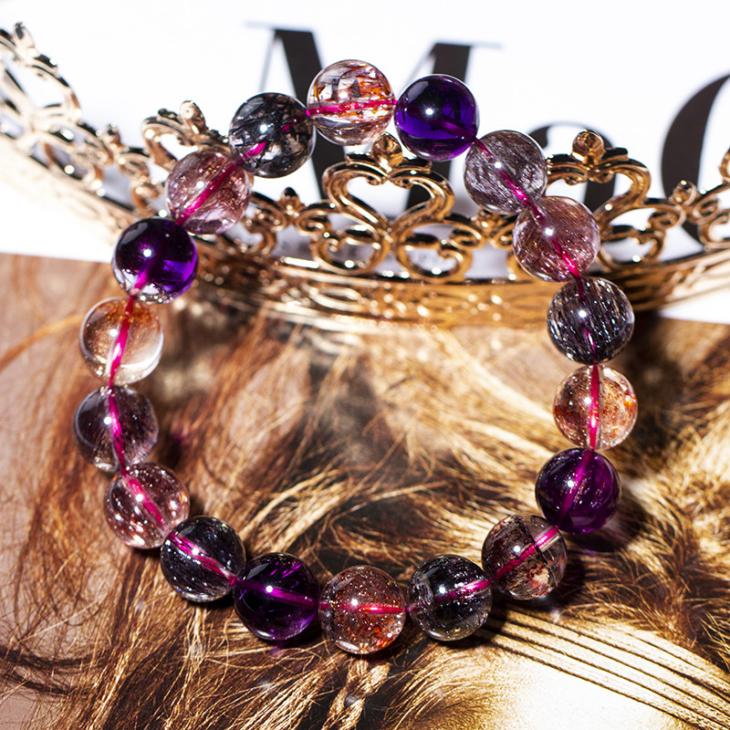 天然超七水晶手鏈少女款海紋石極光23超七碧璽金草莓紫鋰煇紅紋石