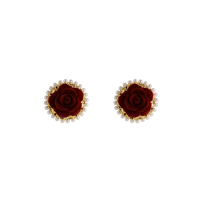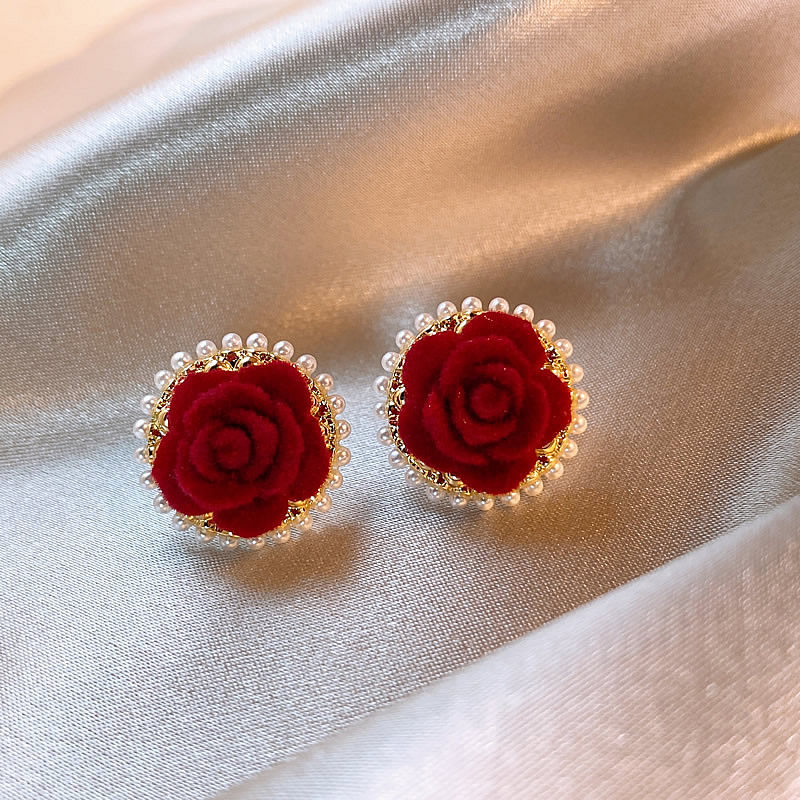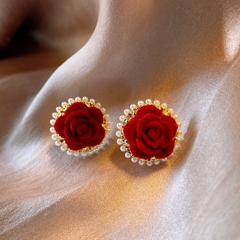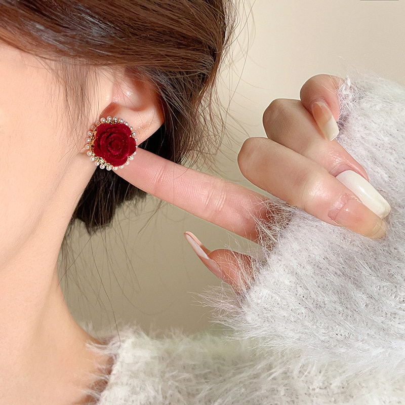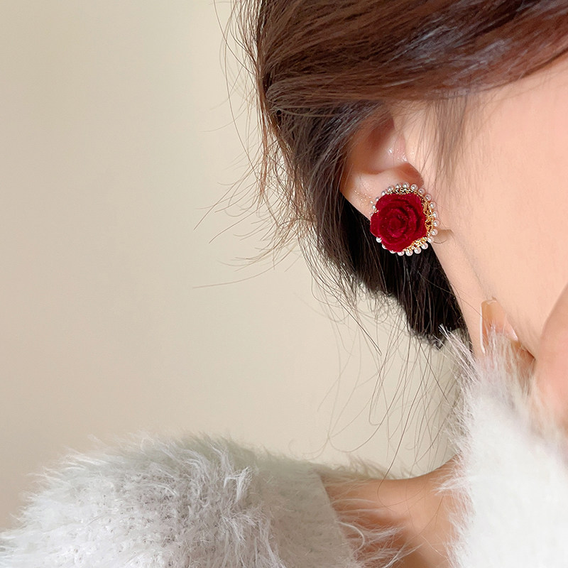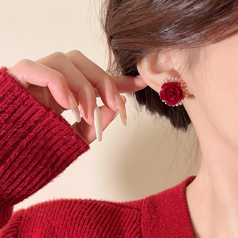 紅色花朵珍珠耳釘女輕奢高級感氣質耳環新款2026爆款新年喜慶耳飾