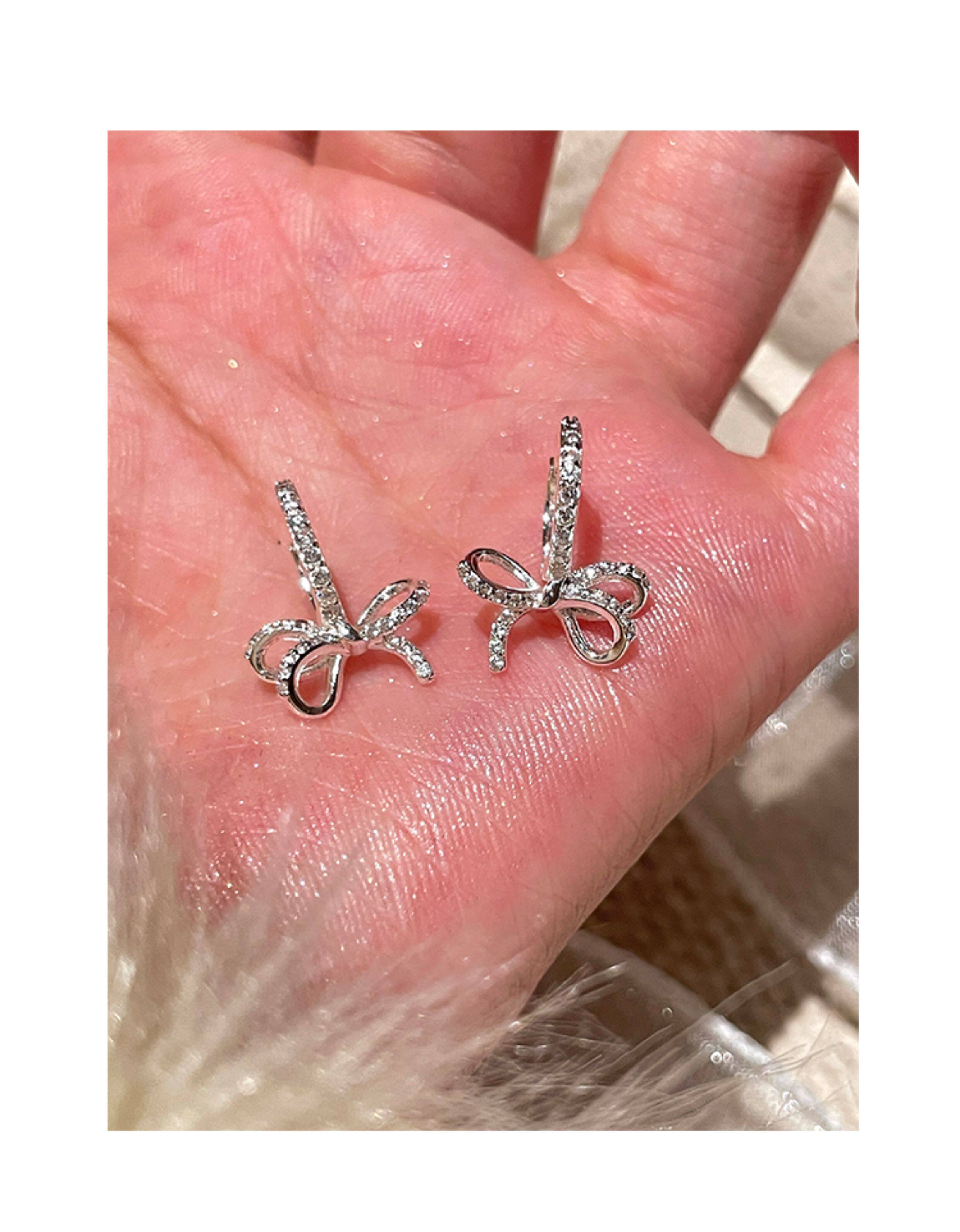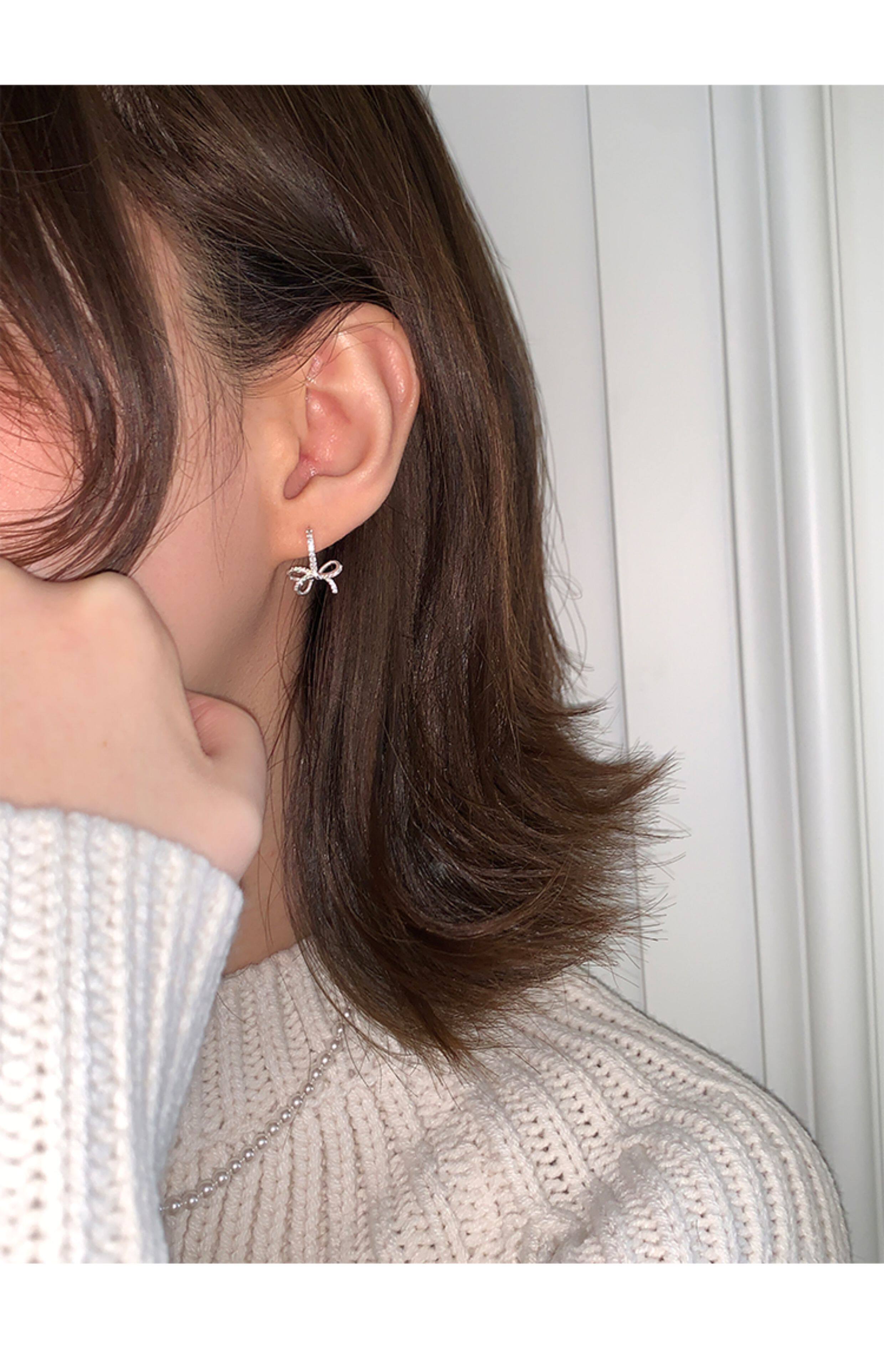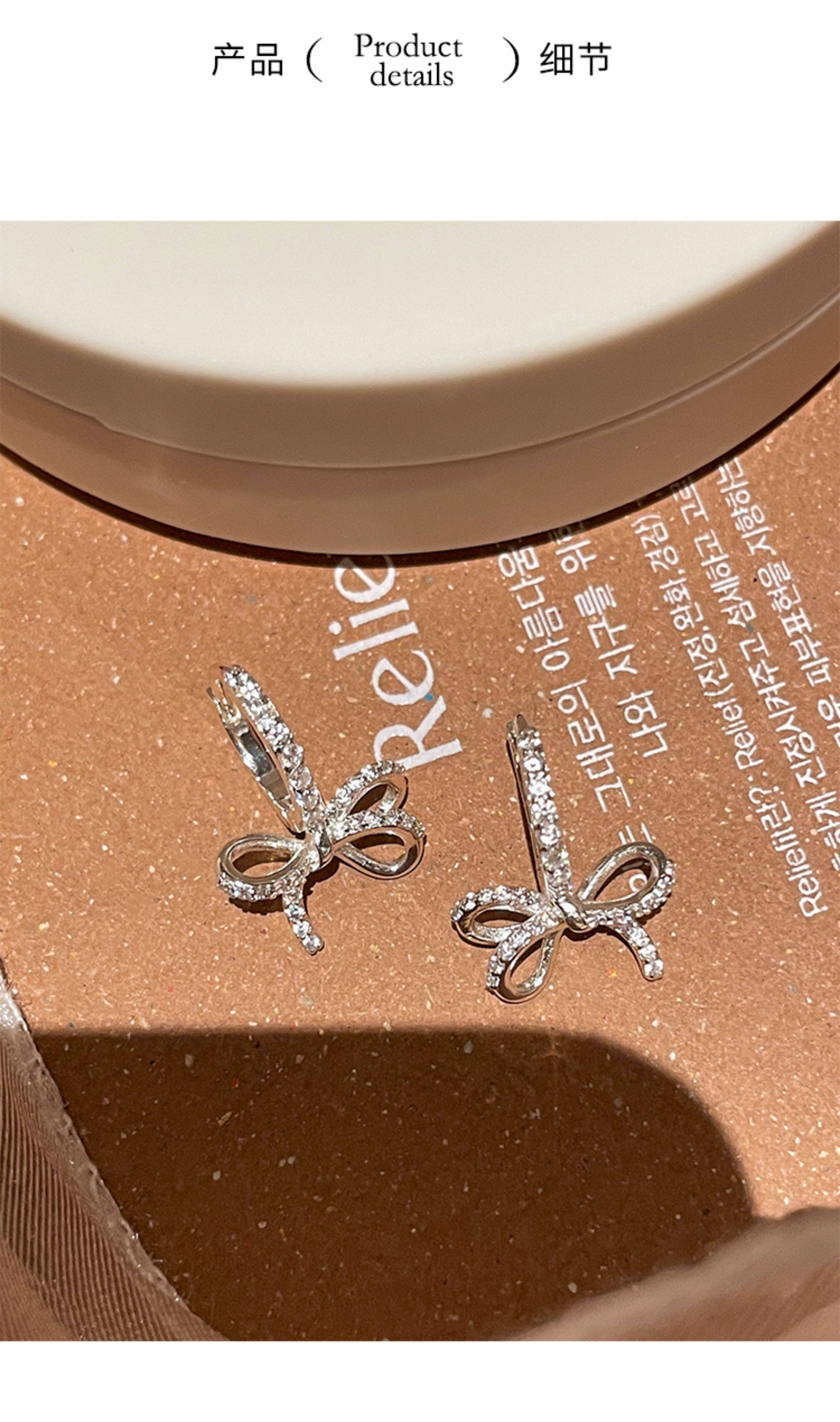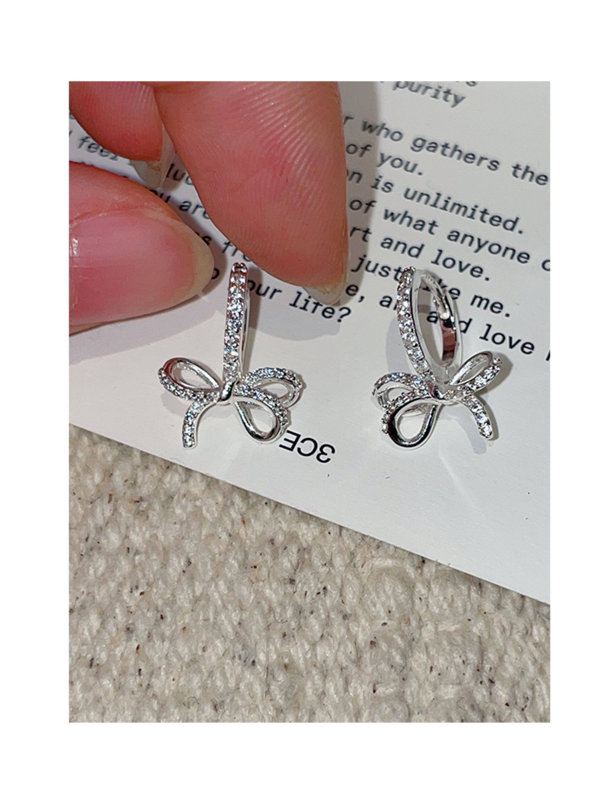 蝴蝶結鑲鑽鋯石耳環女款輕奢小衆設計感高級耳圈耳釦耳釘銀針耳飾