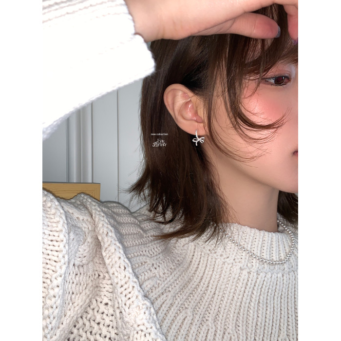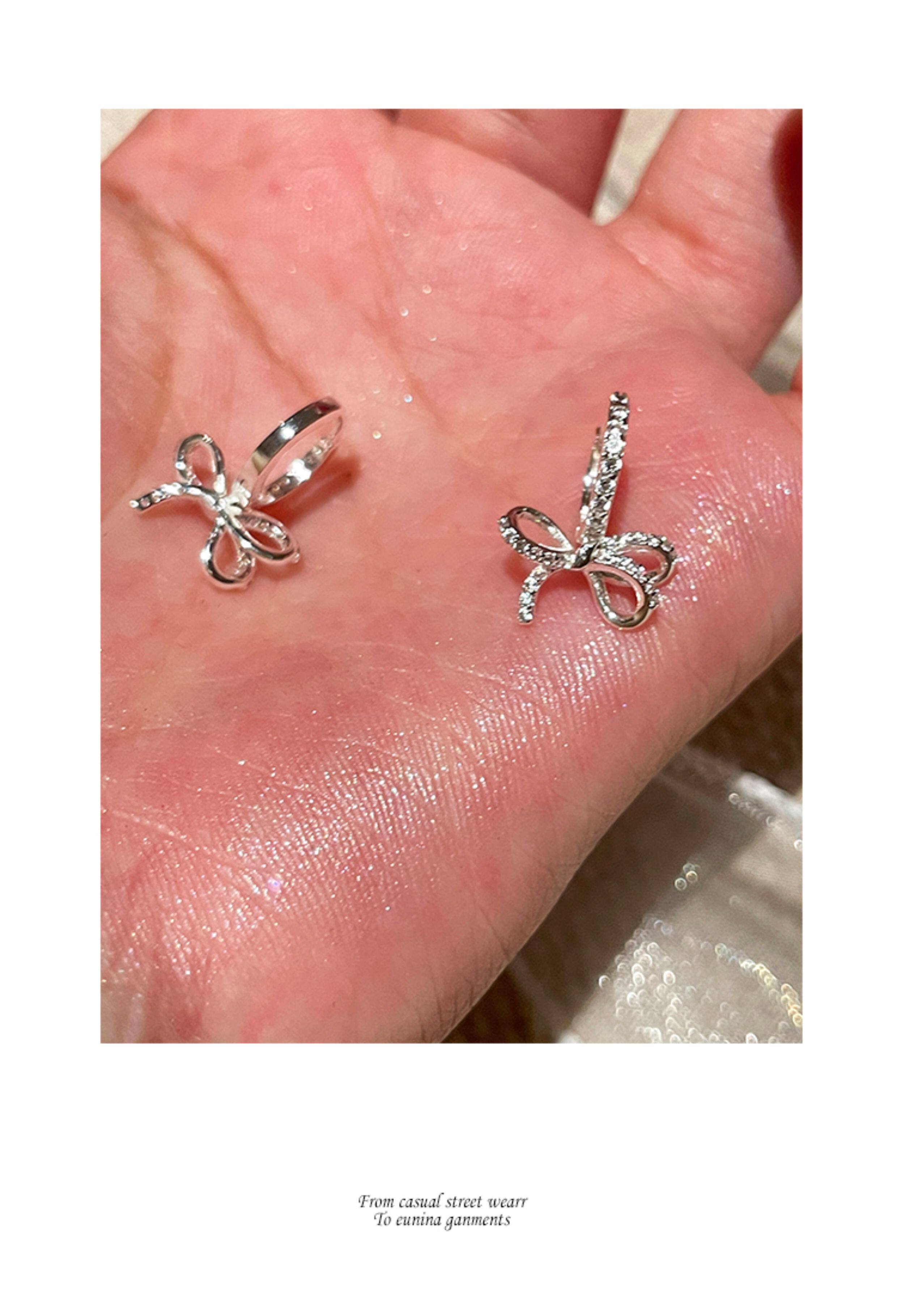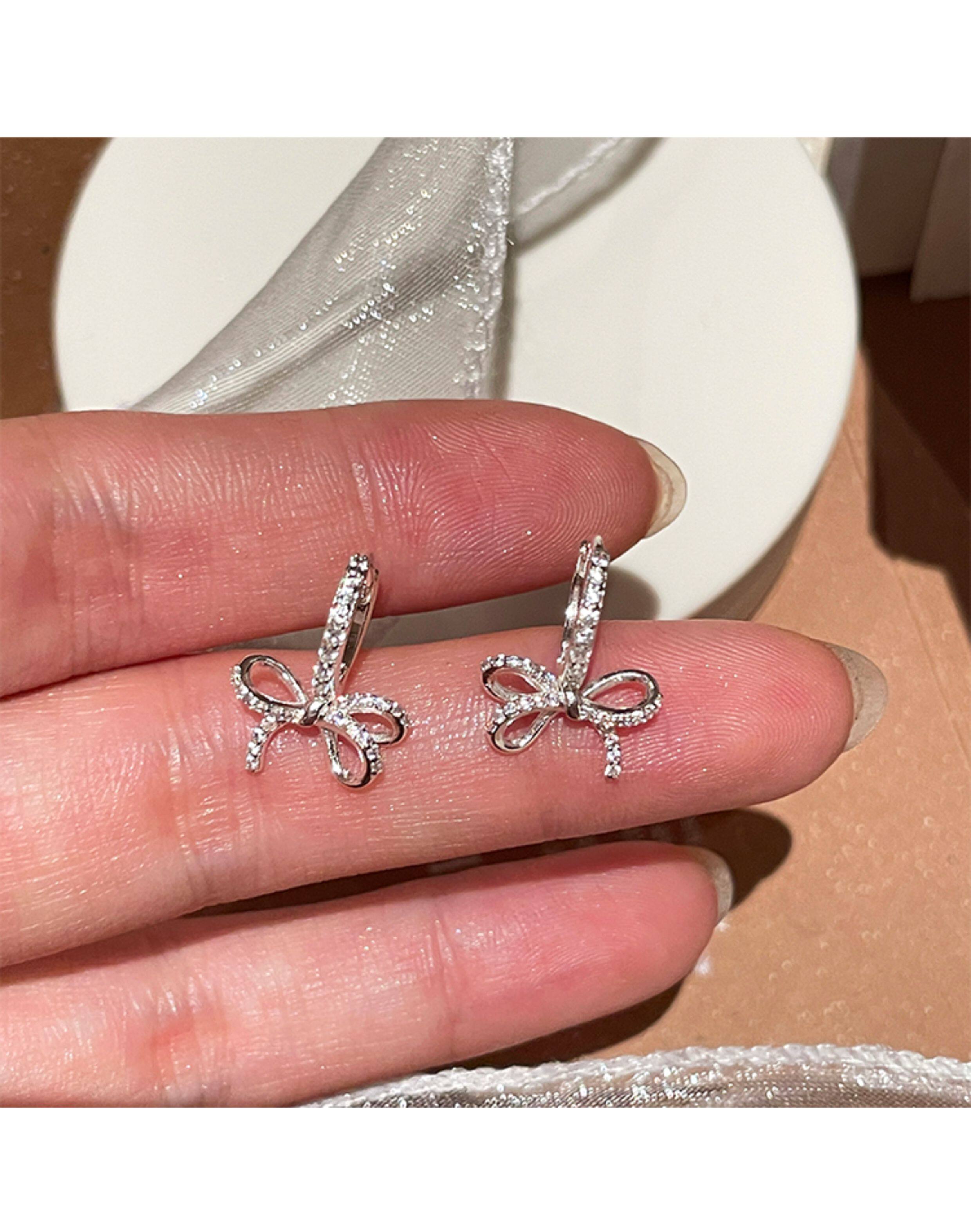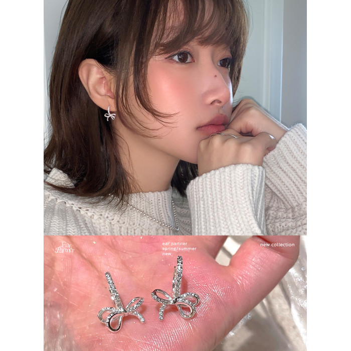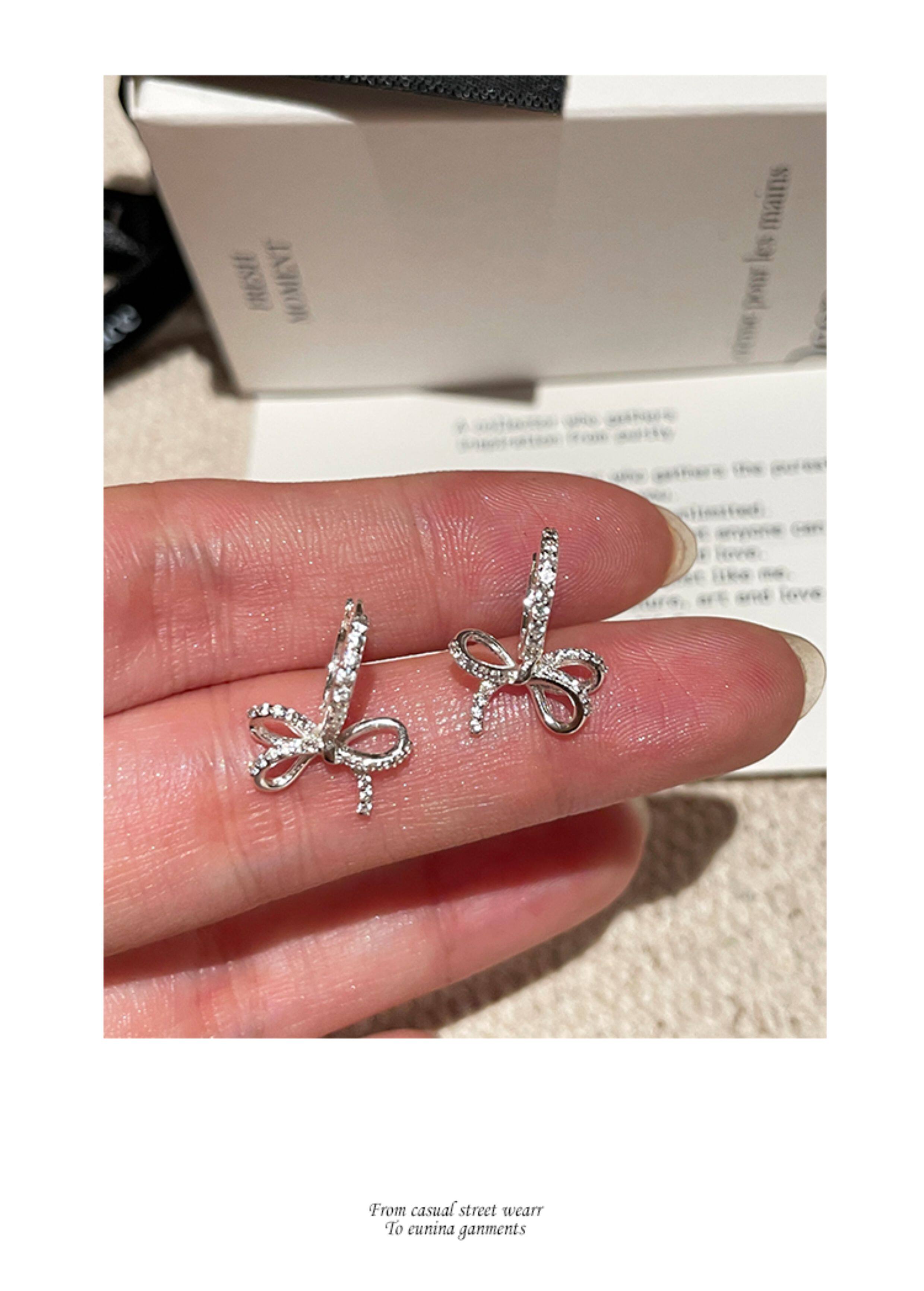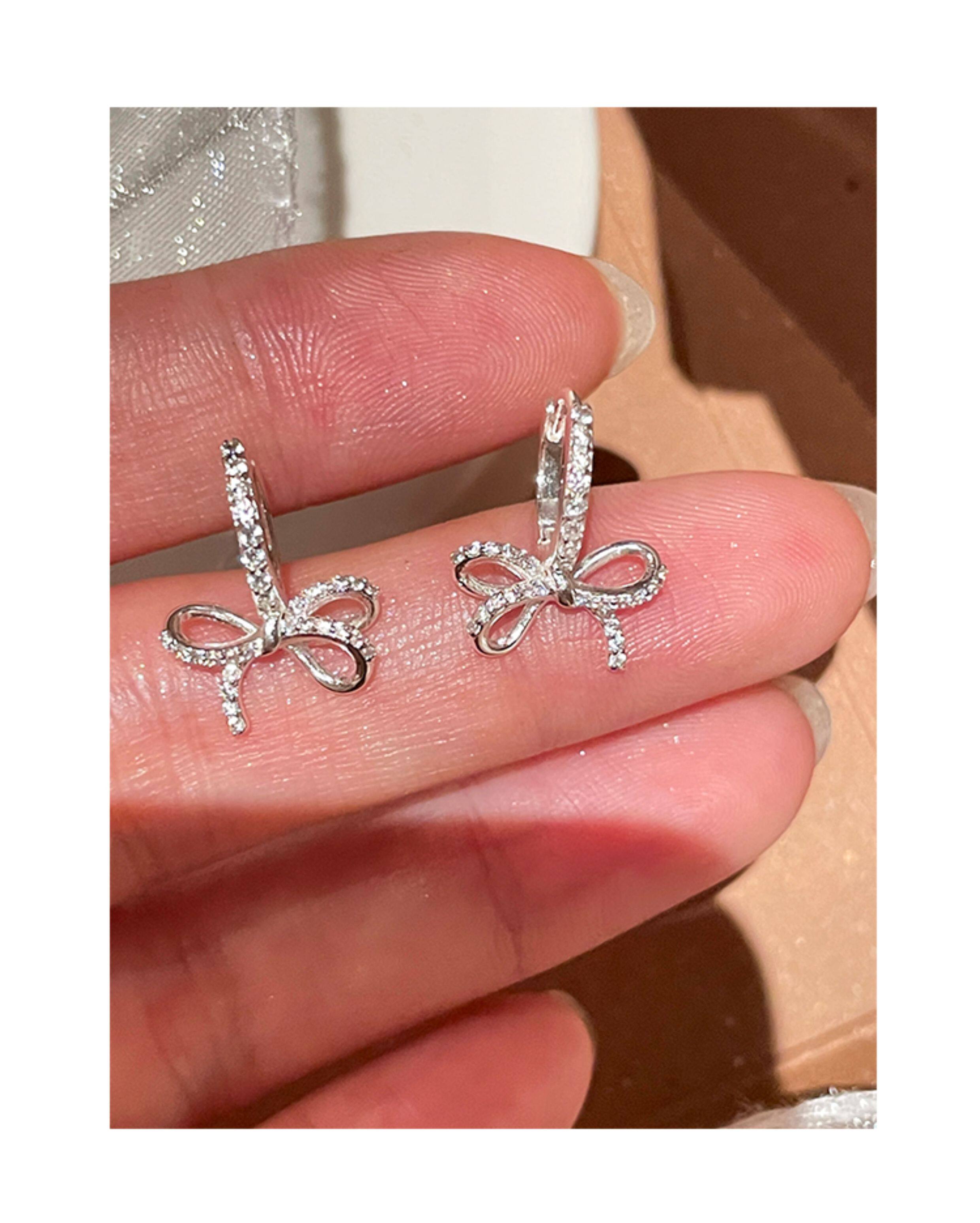 蝴蝶結鑲鑽鋯石耳環女款輕奢小衆設計感高級耳圈耳釦耳釘銀針耳飾
