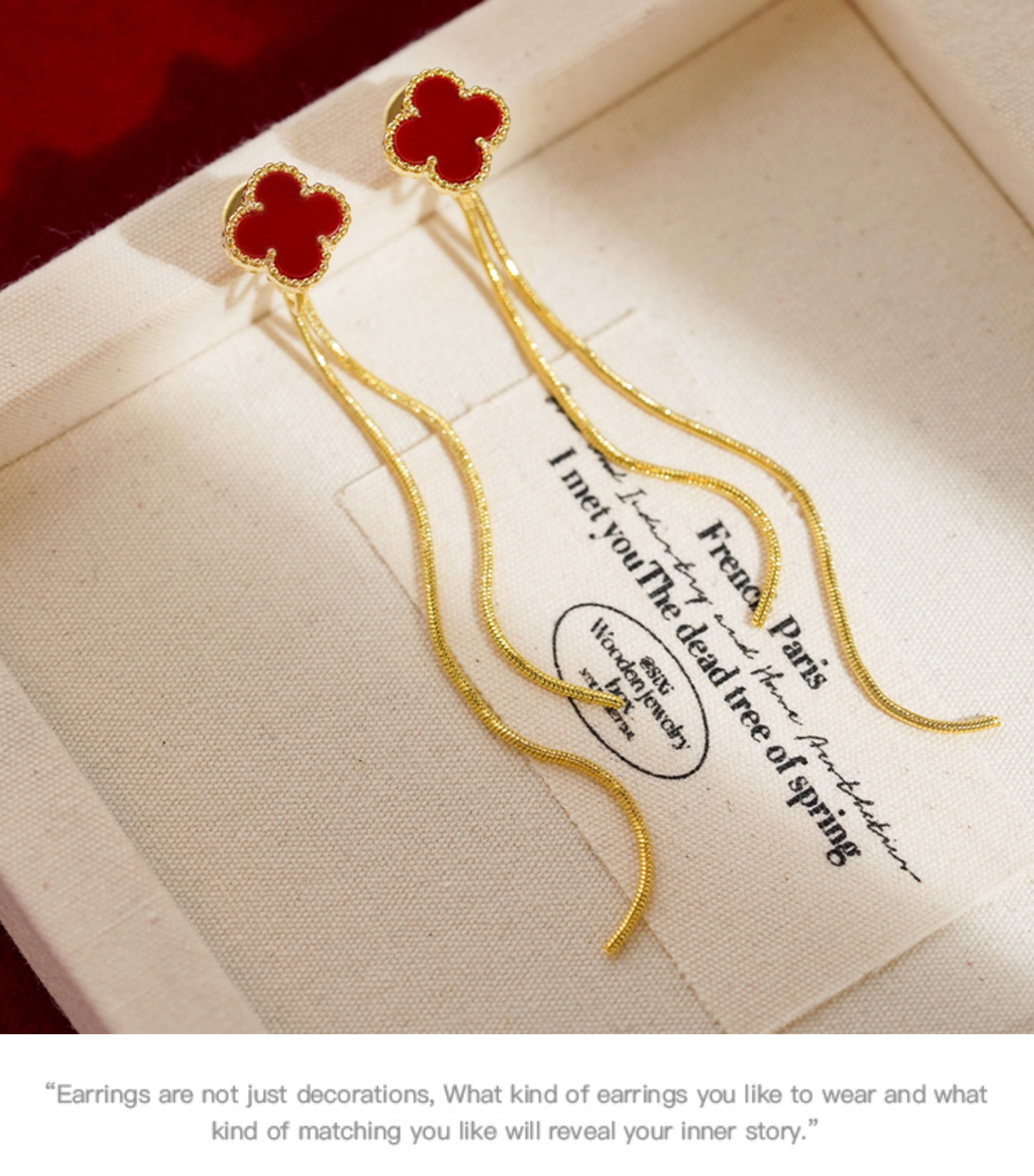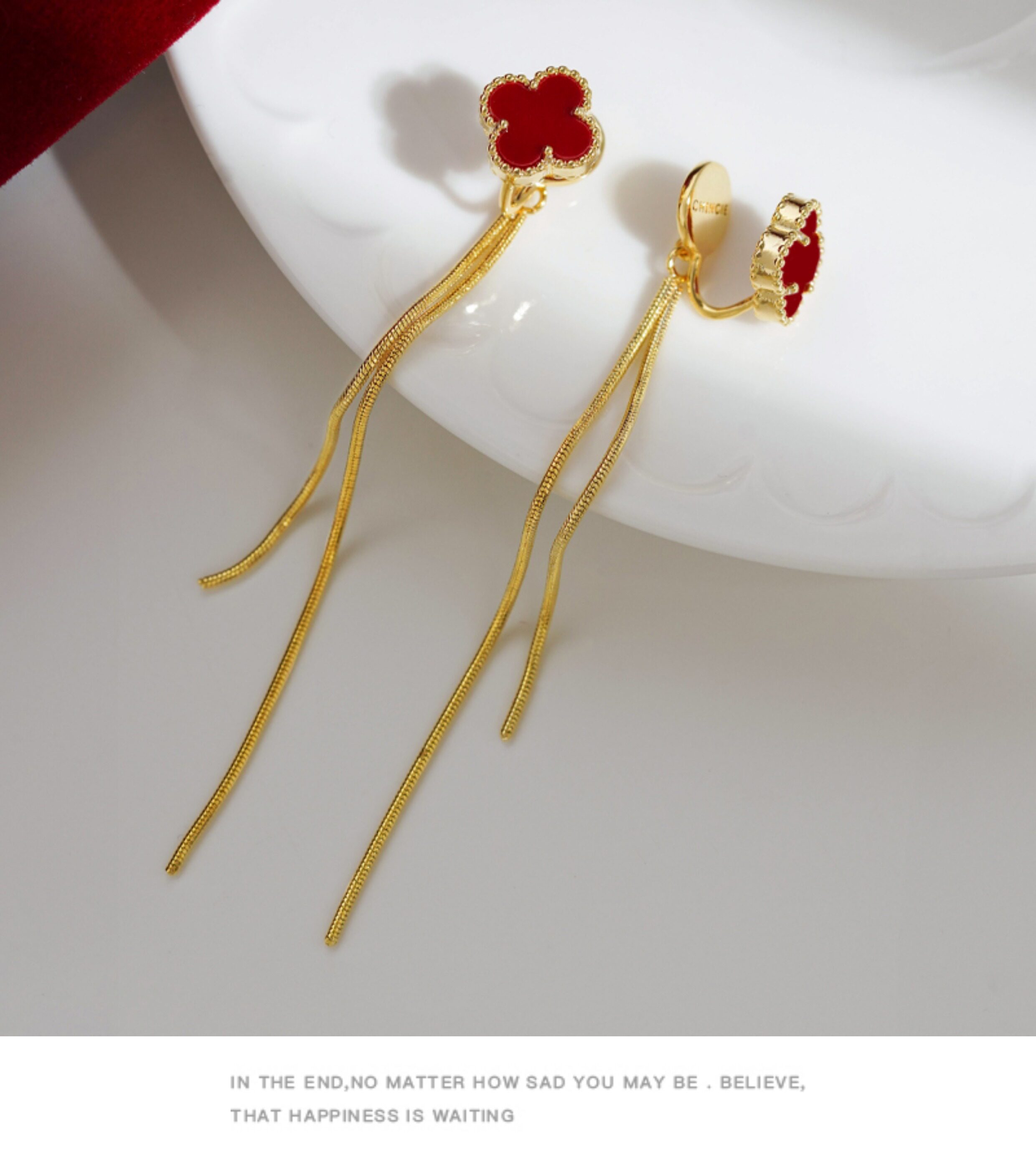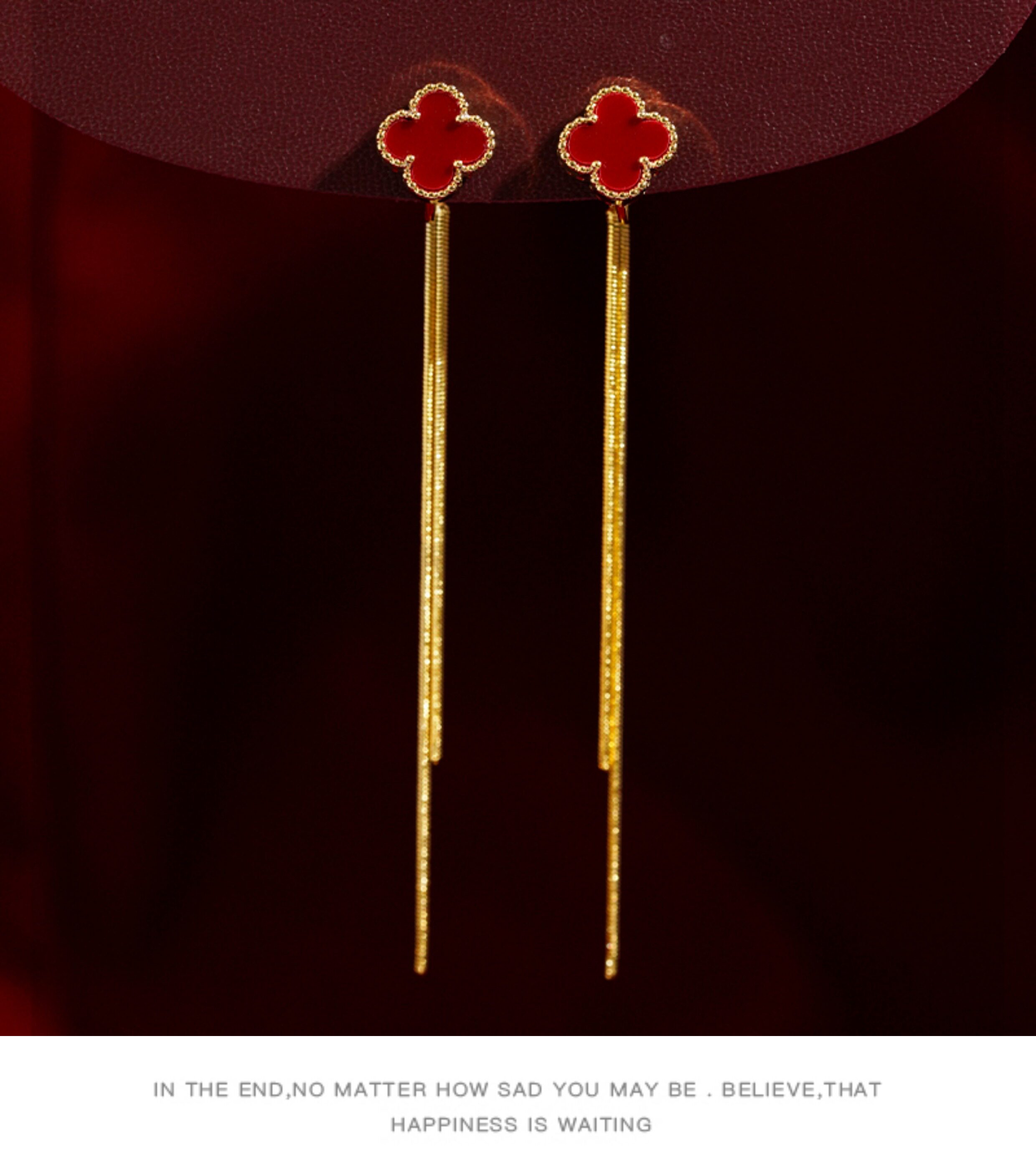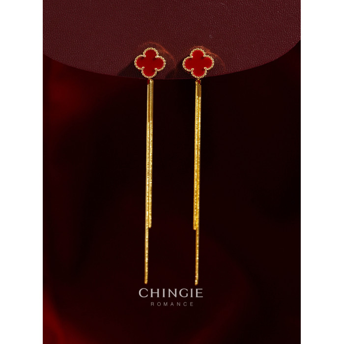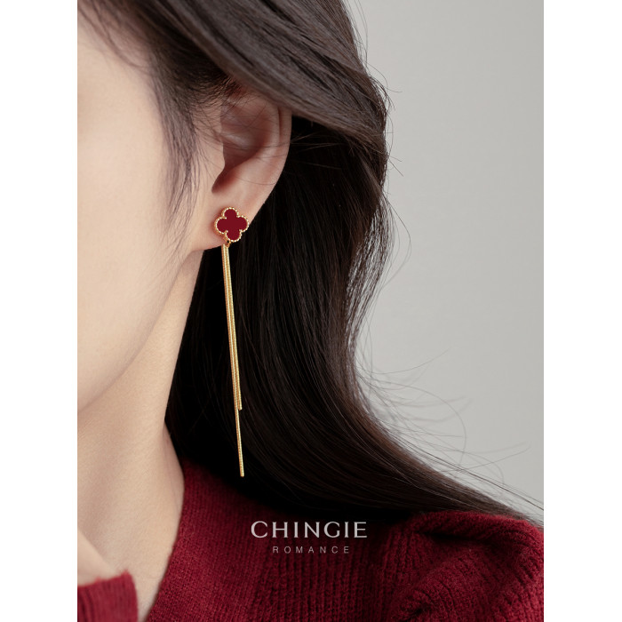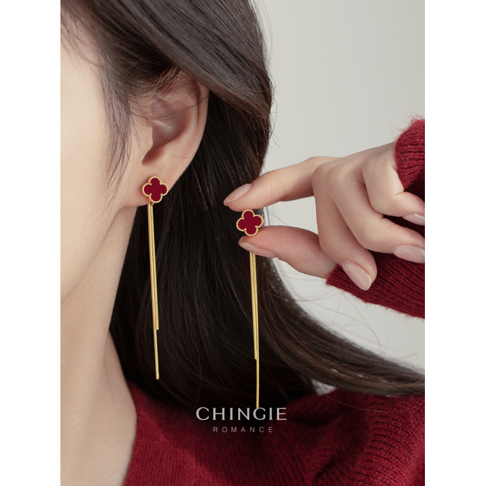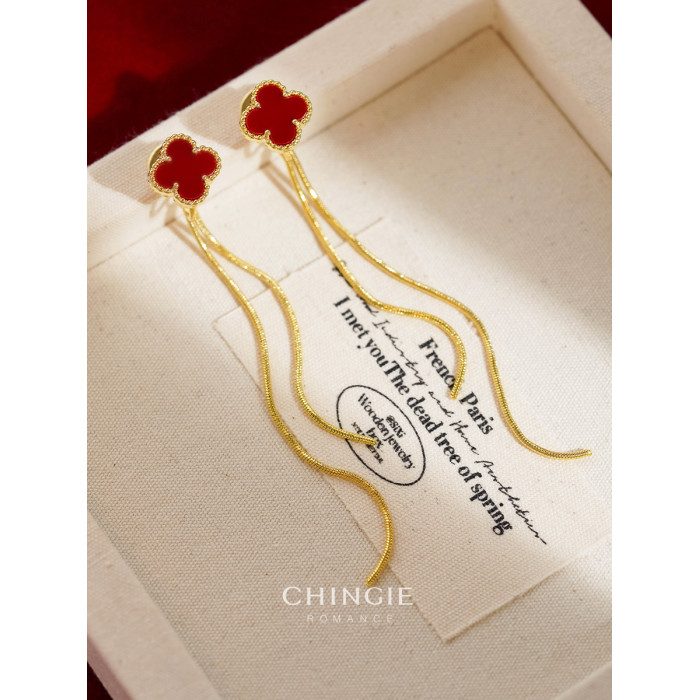 紅色四葉草長流蘇耳飾輕奢高級感蚊香盤耳夾女無耳洞雙戴耳環耳釘