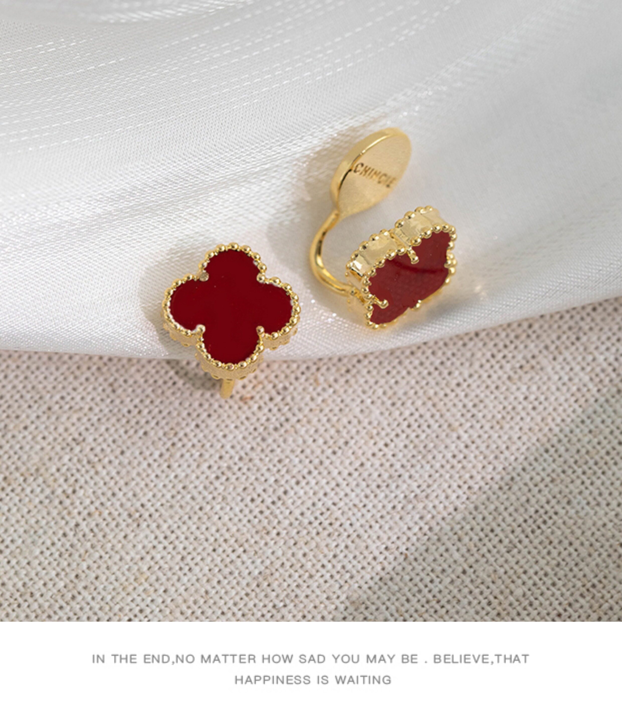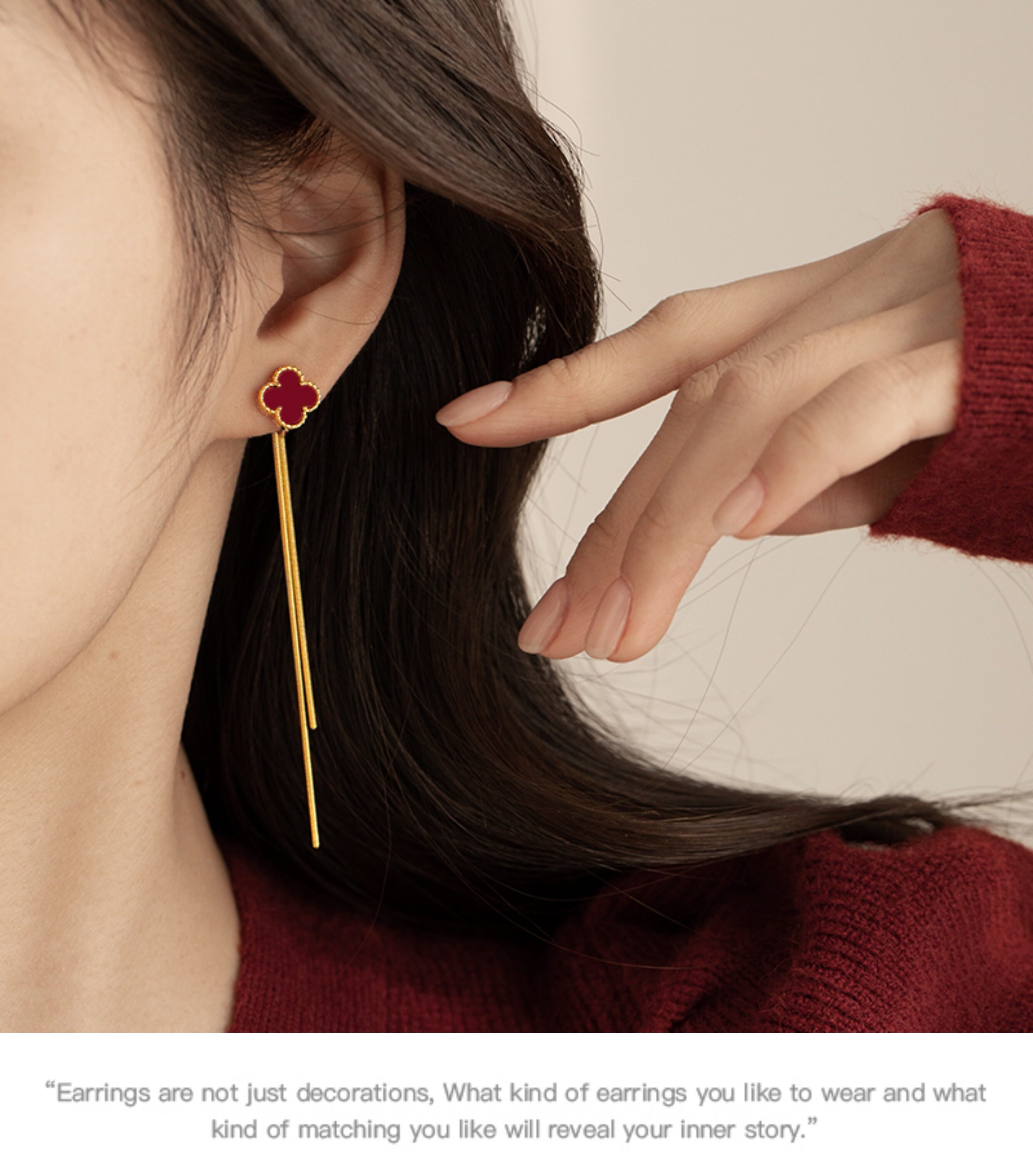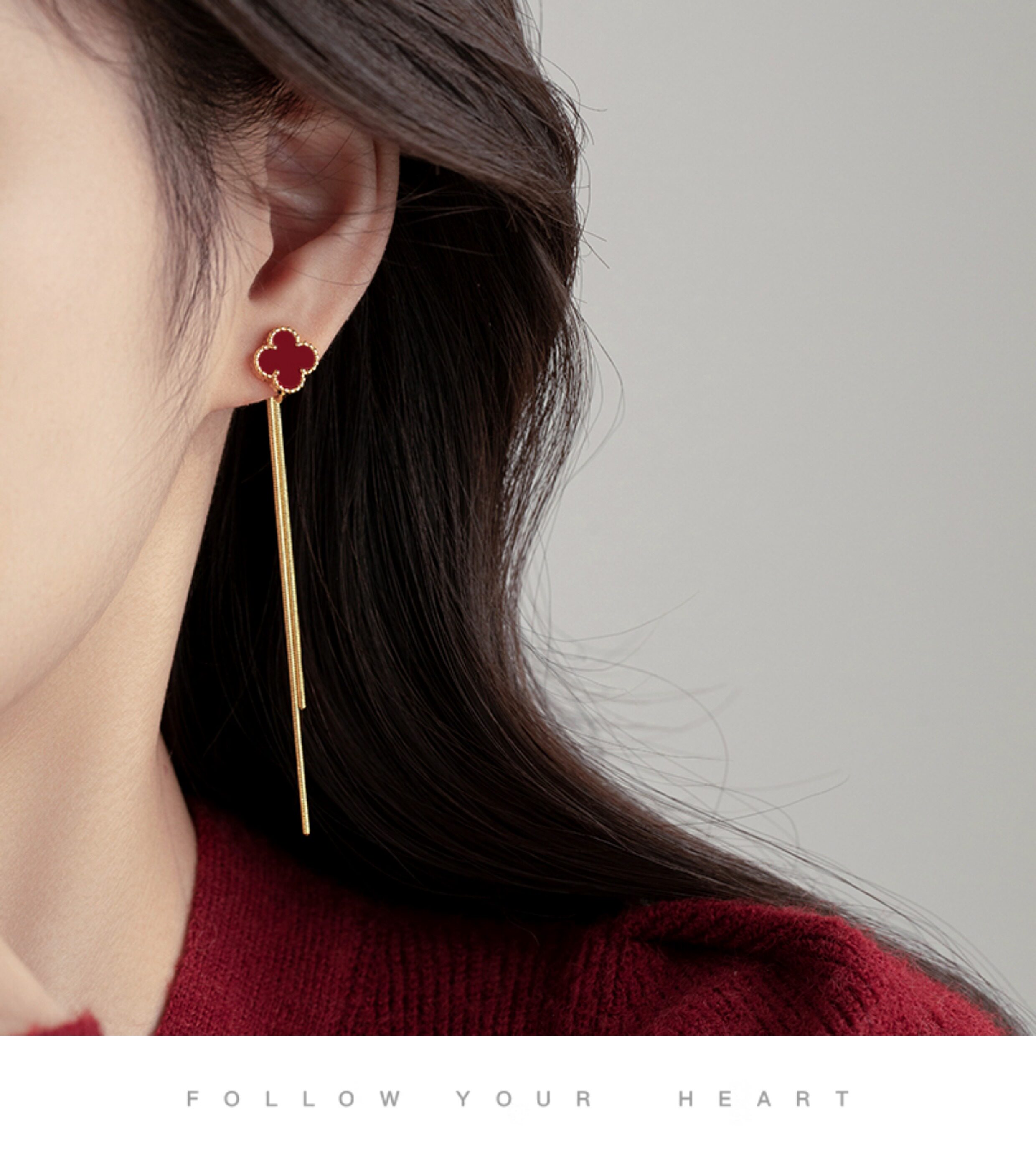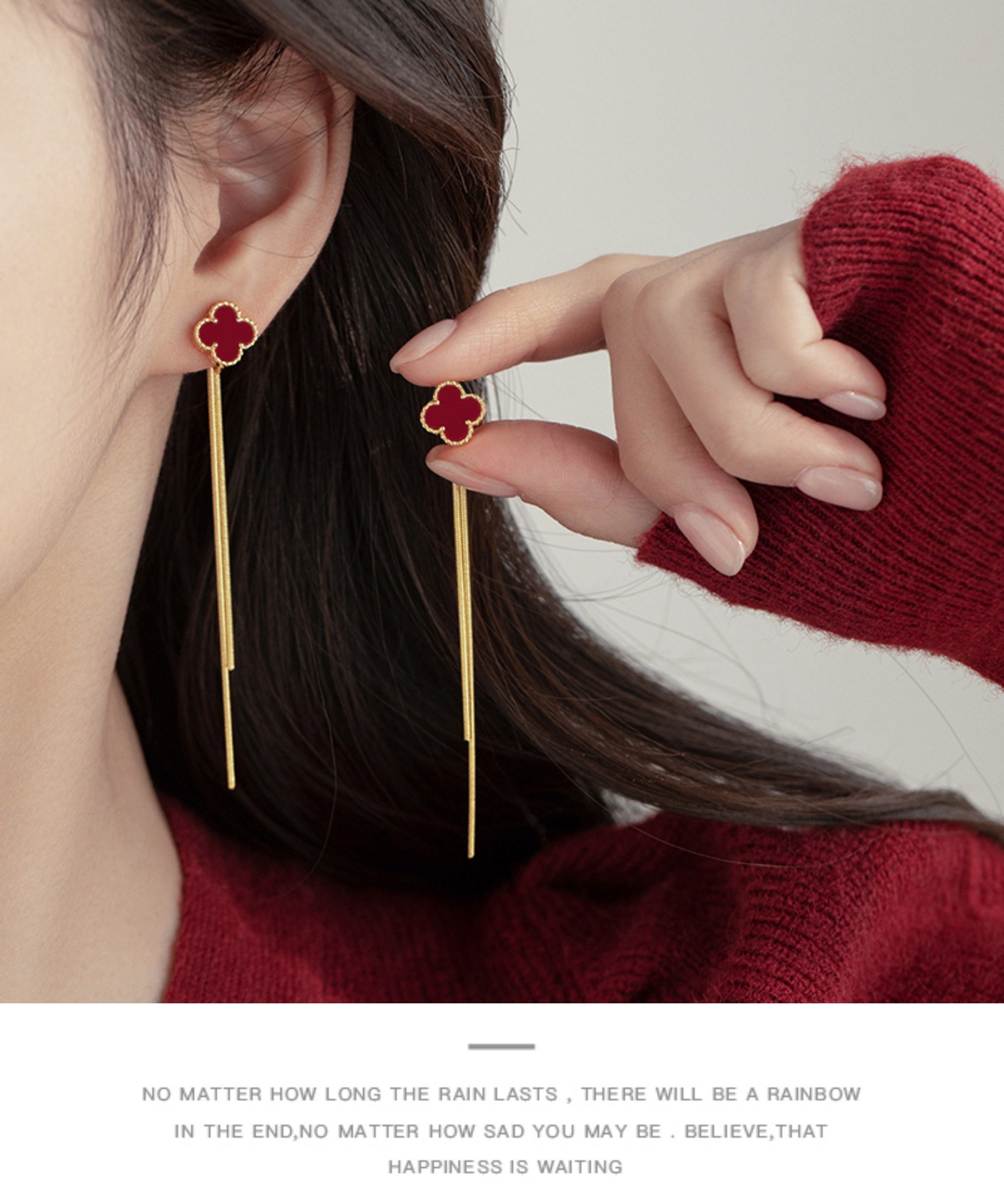 紅色四葉草長流蘇耳飾輕奢高級感蚊香盤耳夾女無耳洞雙戴耳環耳釘