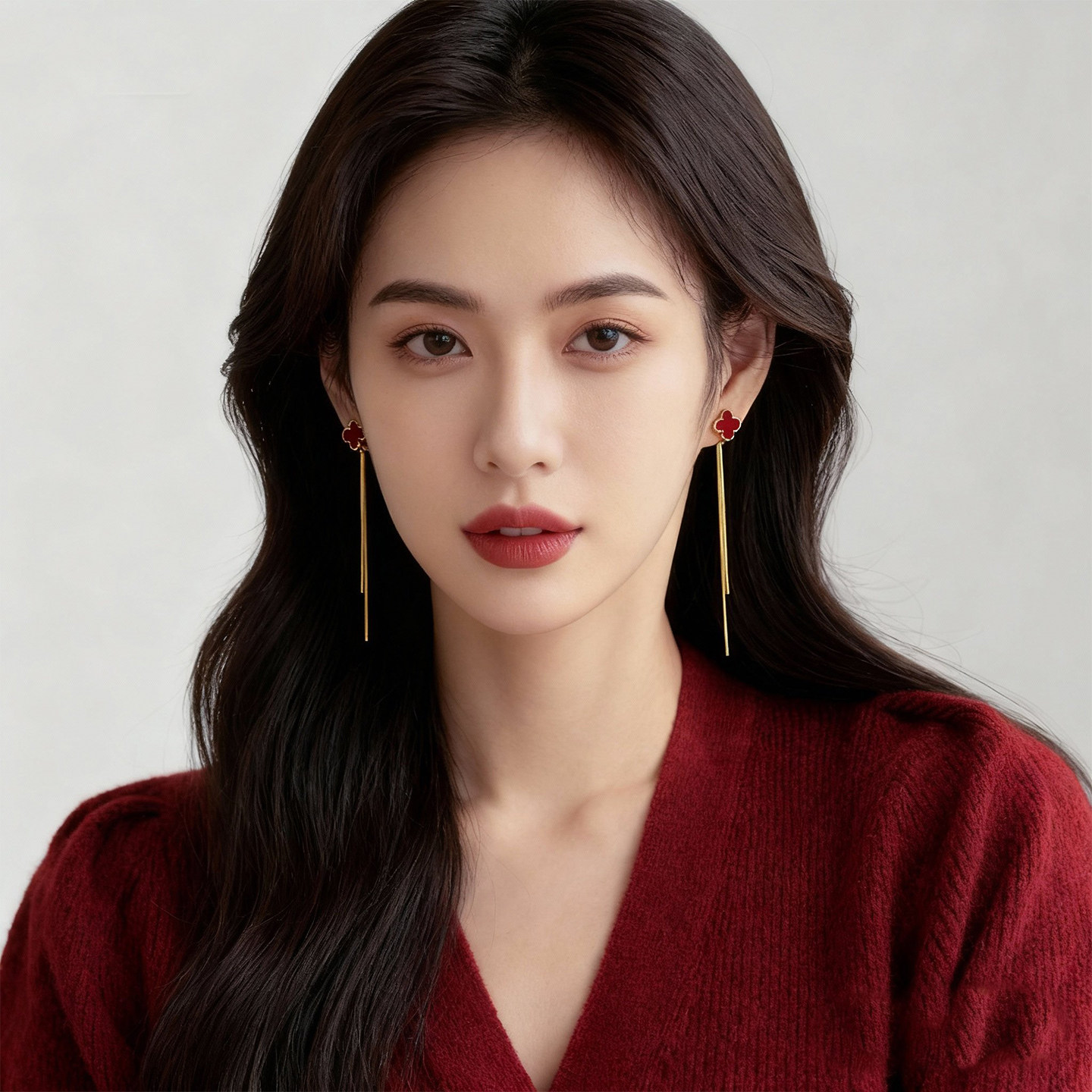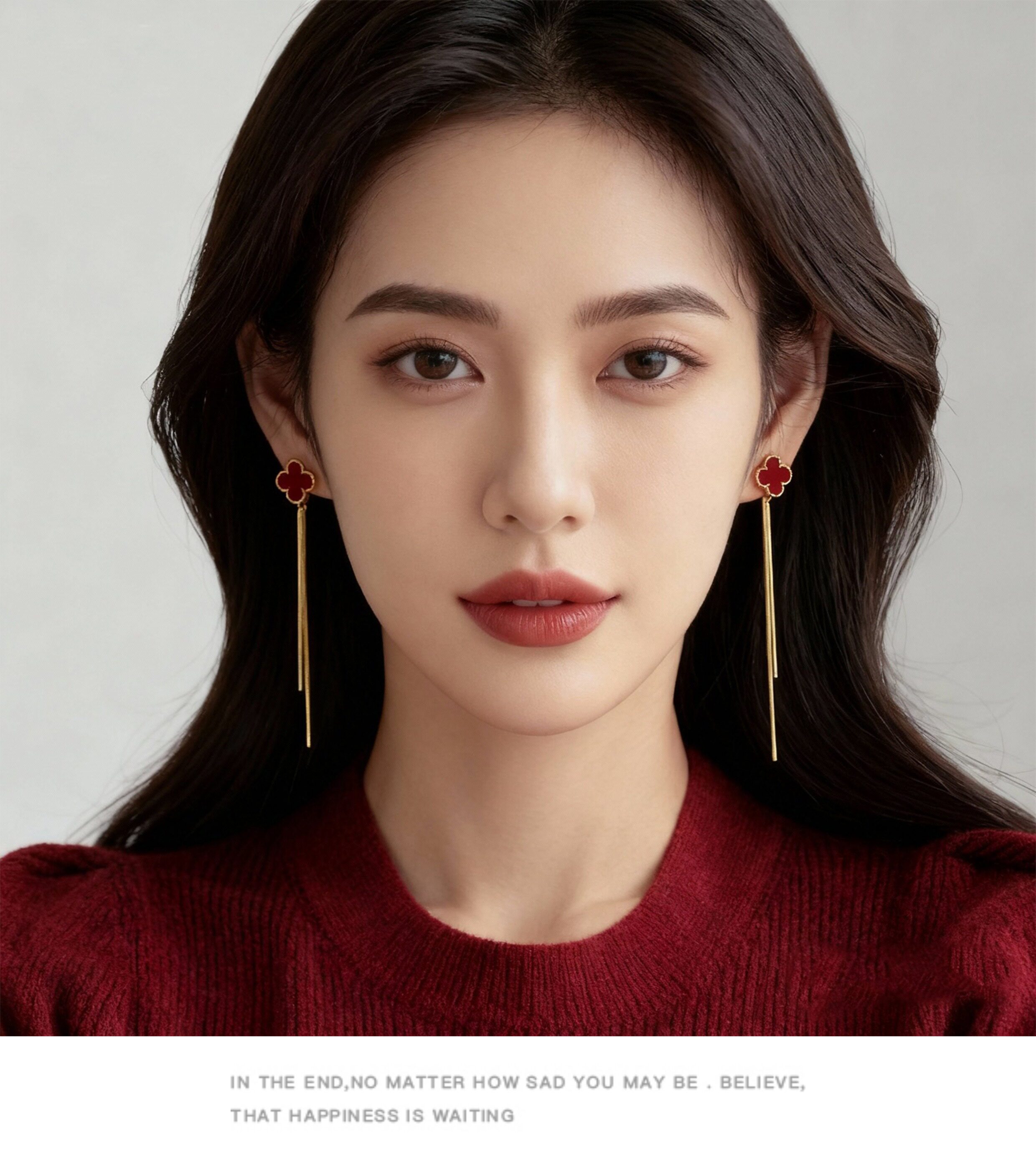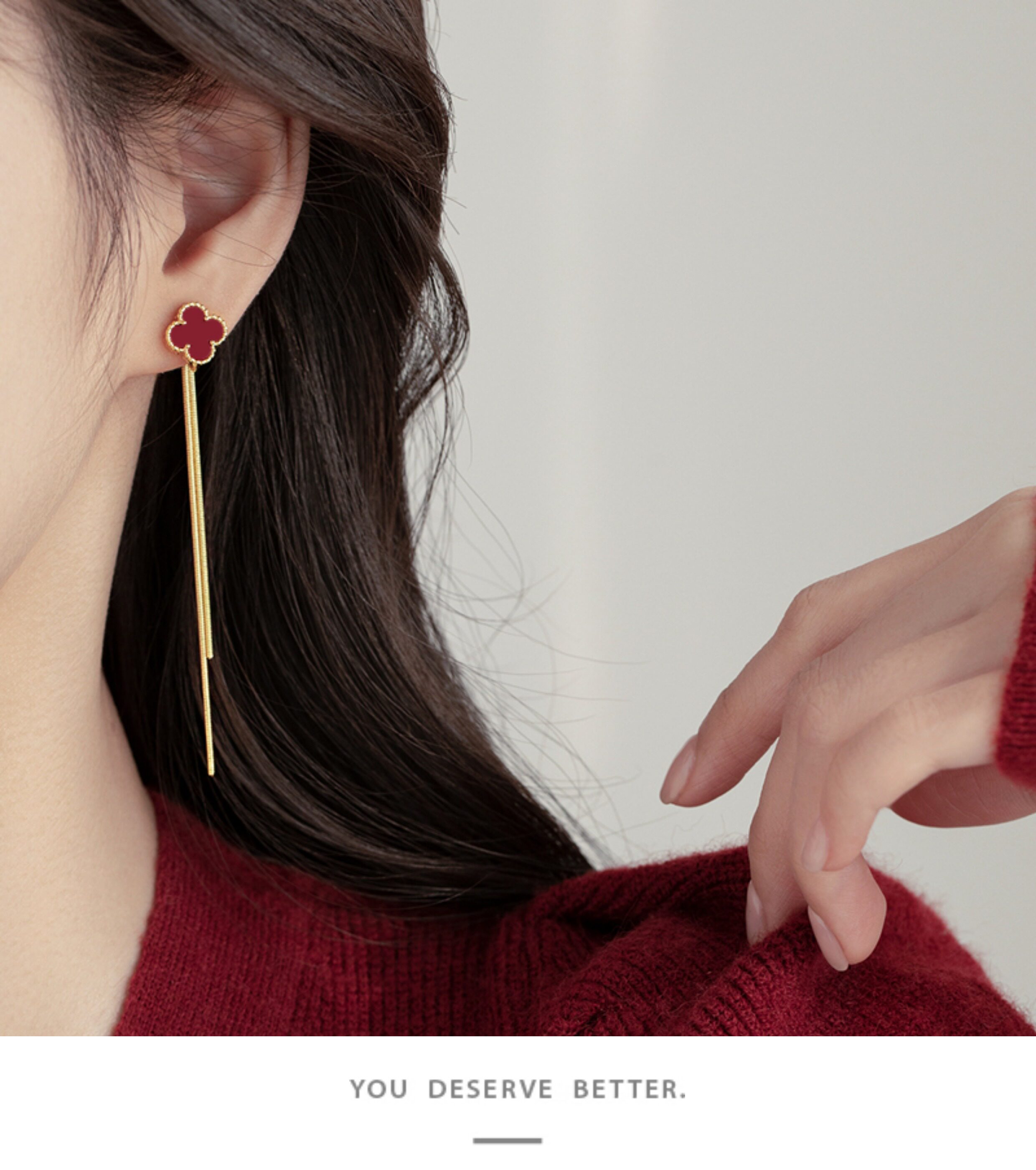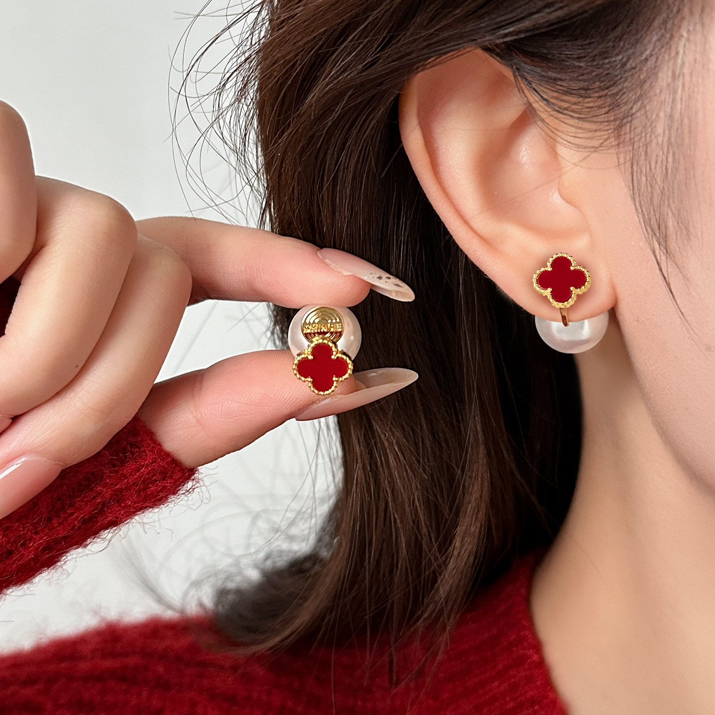 紅色四葉草長流蘇耳飾輕奢高級感蚊香盤耳夾女無耳洞雙戴耳環耳釘