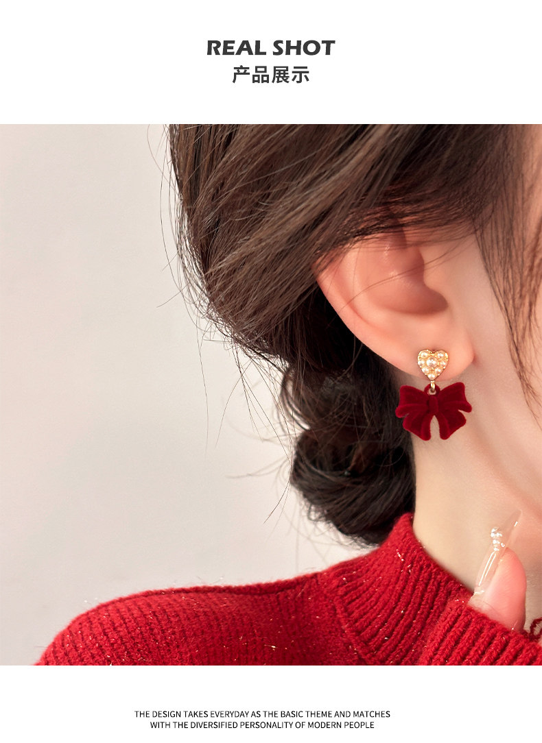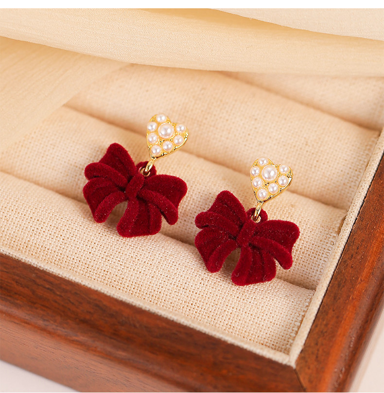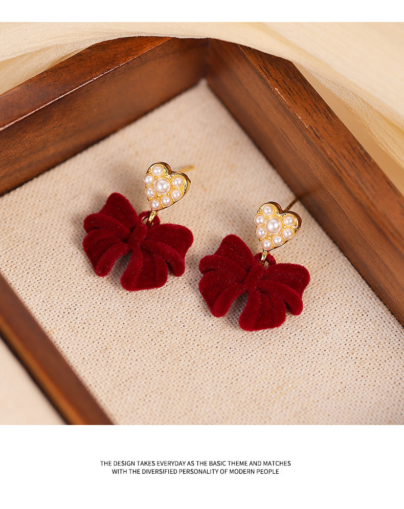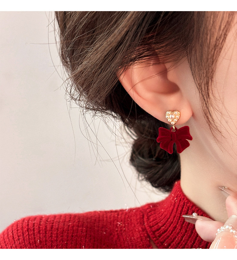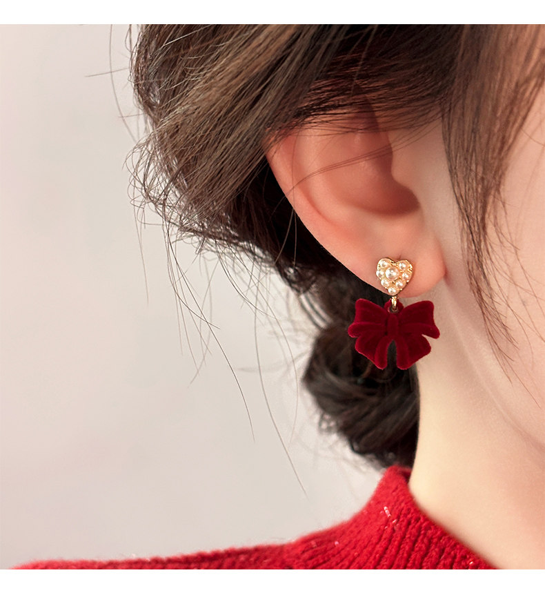 紅色植絨蝴蝶結愛心仿仿仿珍珠耳環女2025新款爆款耳夾無耳洞高級