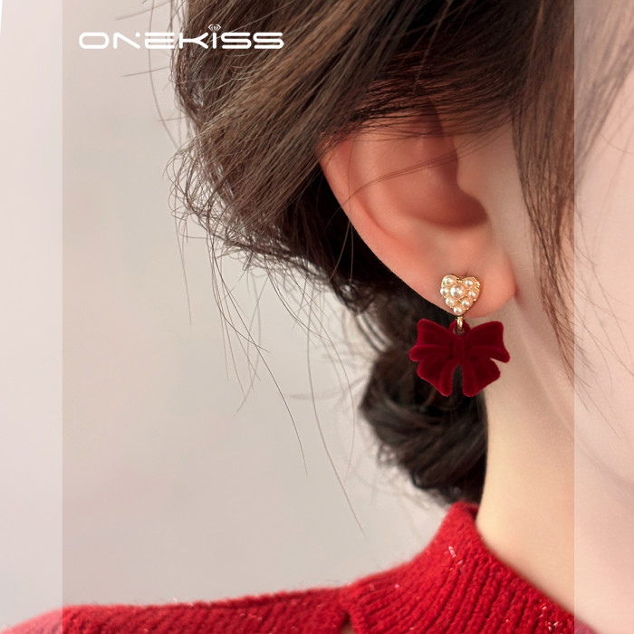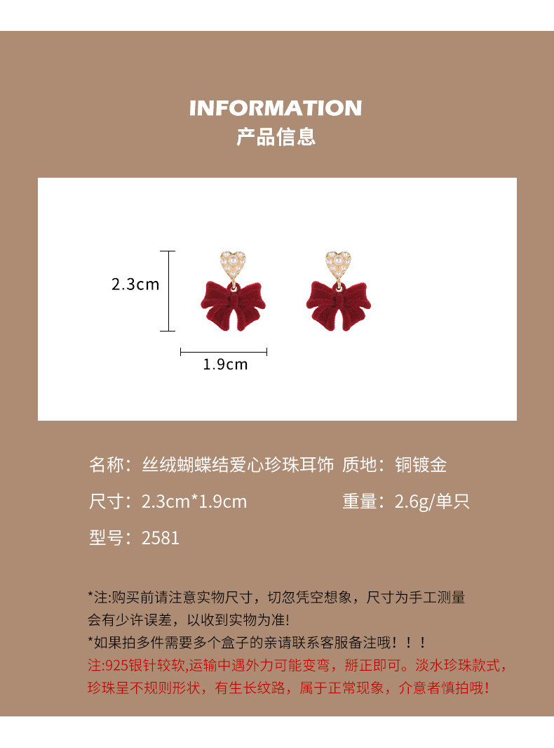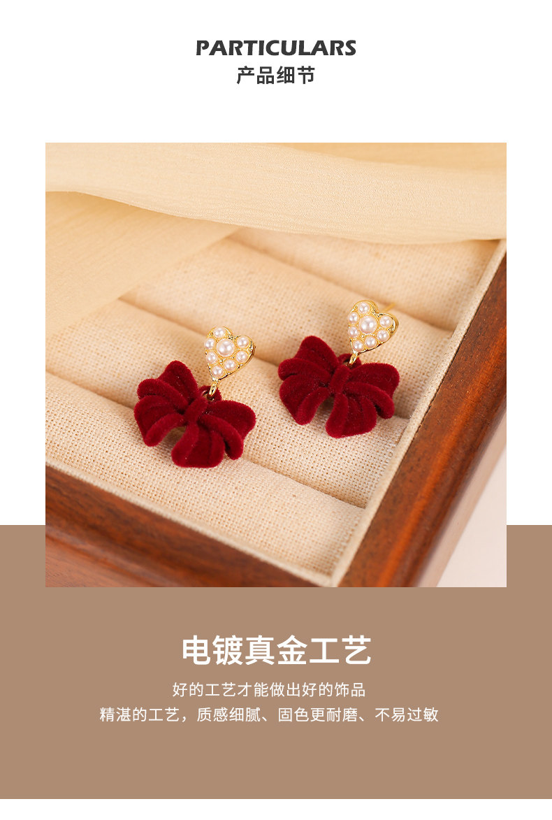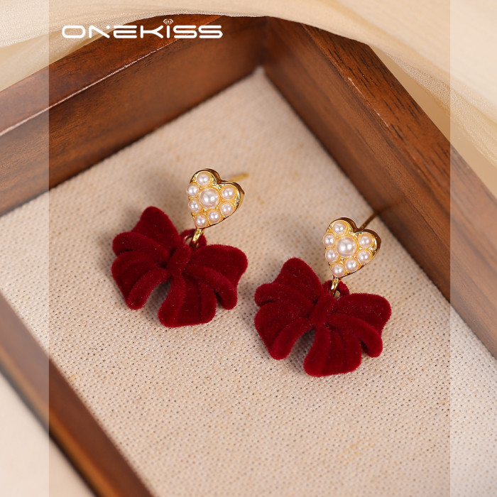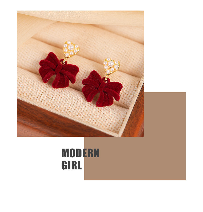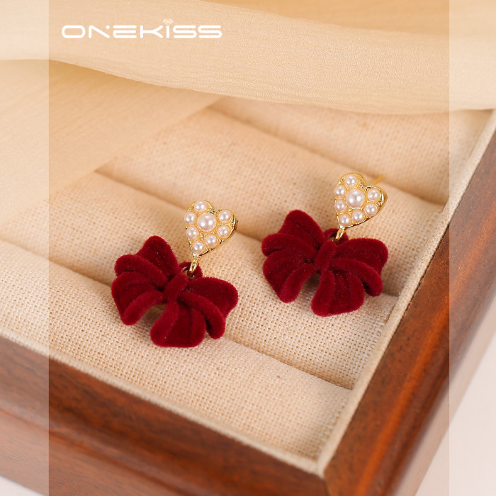 紅色植絨蝴蝶結愛心仿仿仿珍珠耳環女2025新款爆款耳夾無耳洞高級