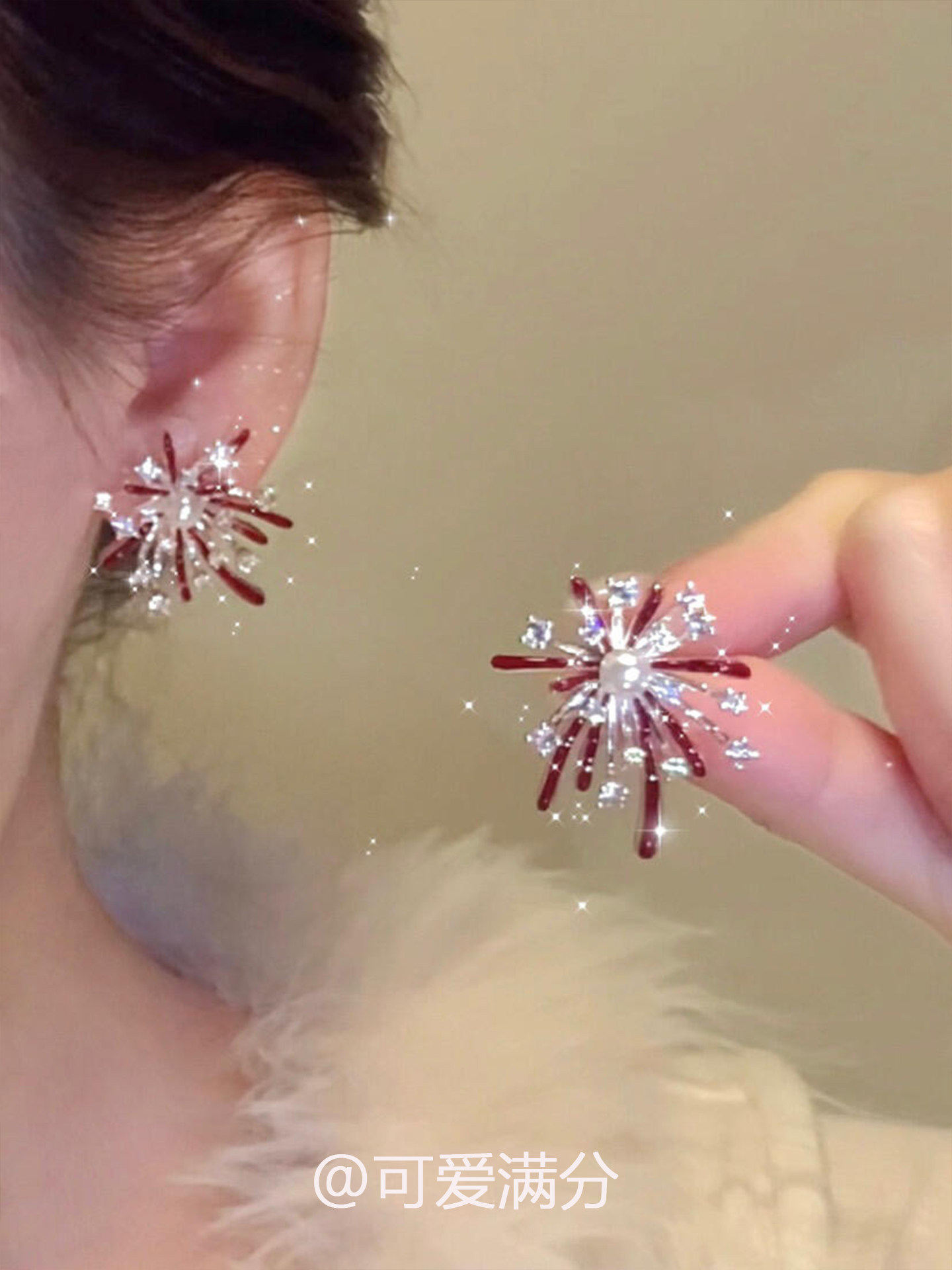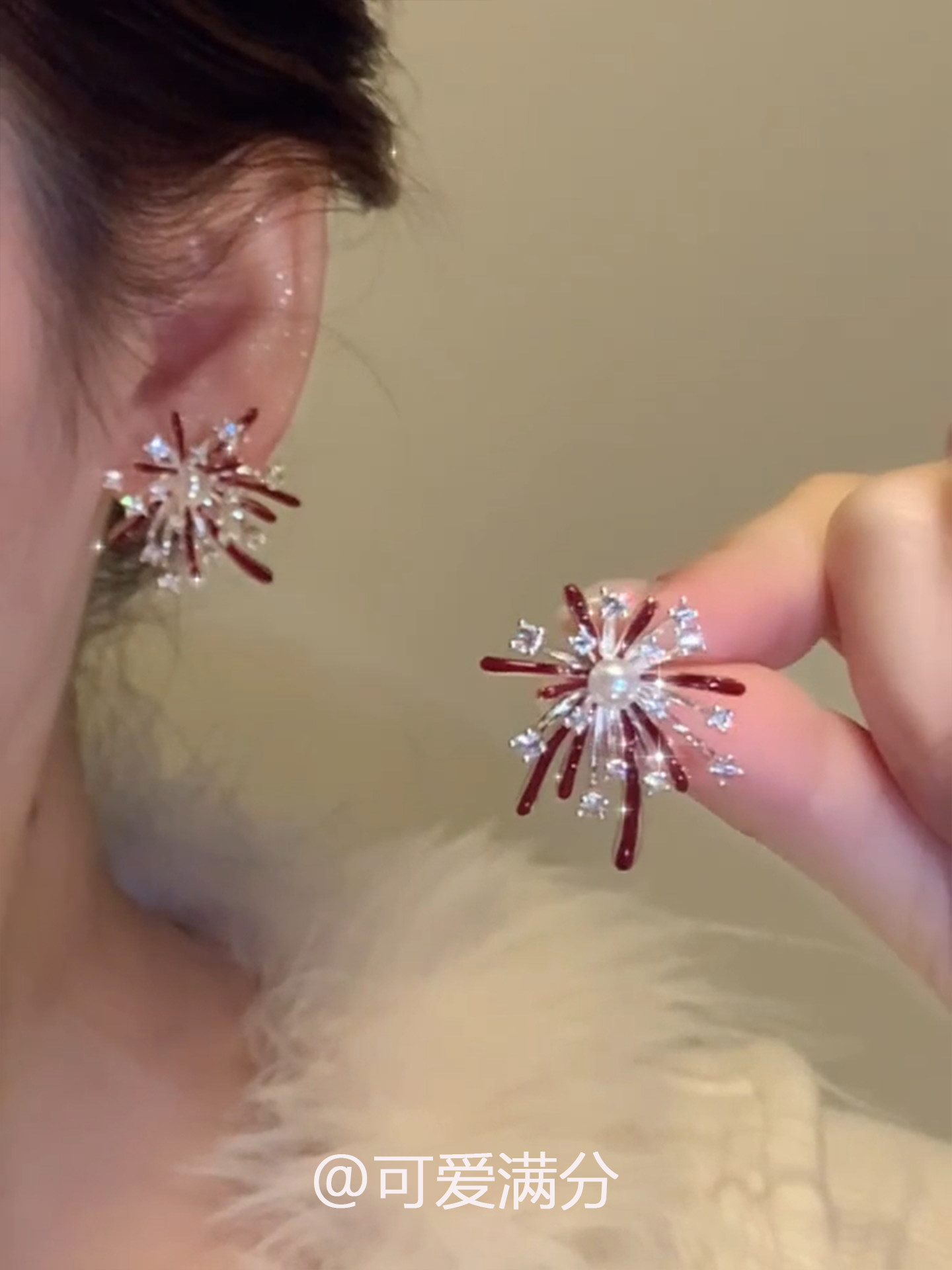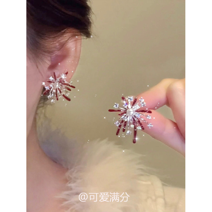「絢爛綻放」新年紅色滴釉菸花珍珠耳釘爆閃精緻顯白氣質閃鑽耳飾