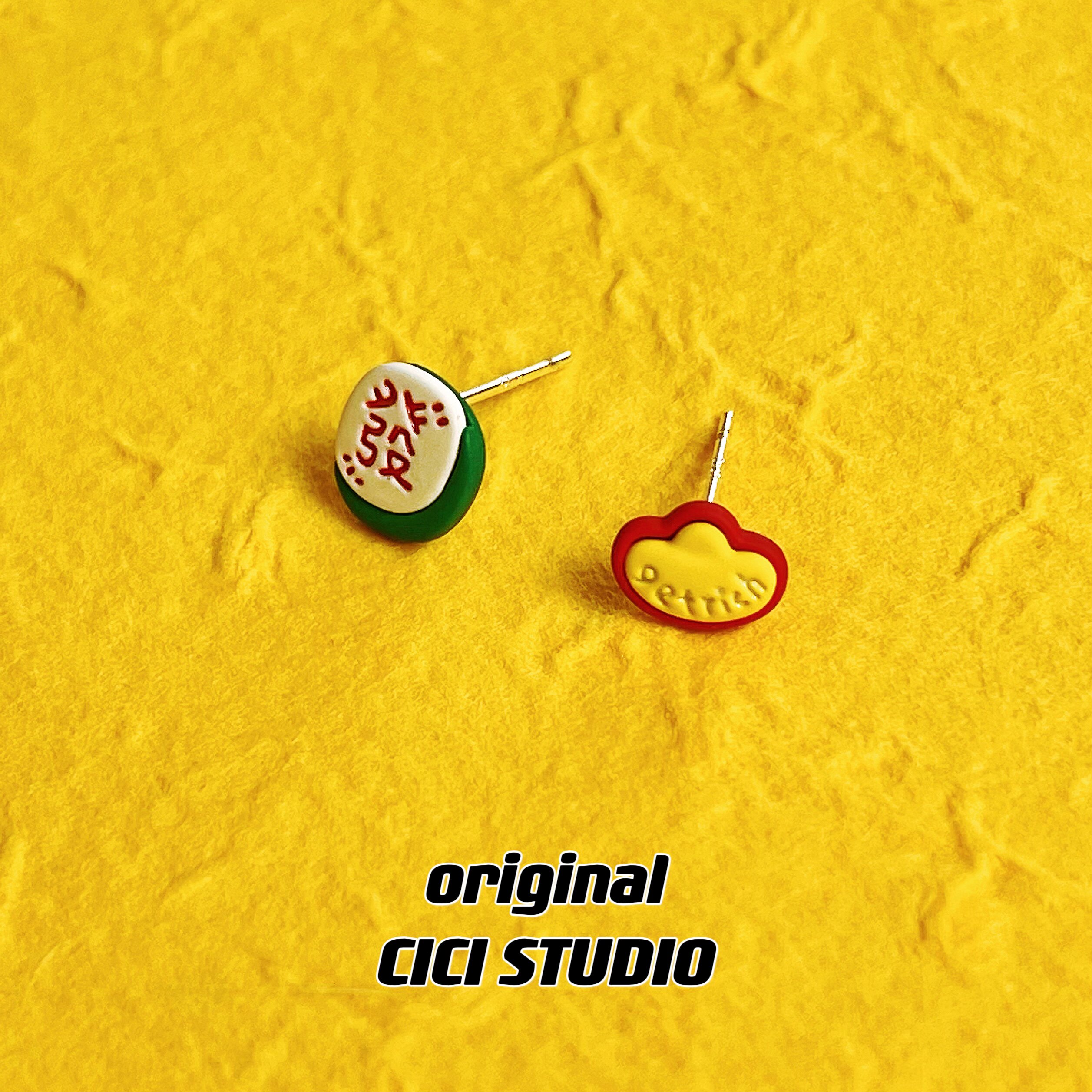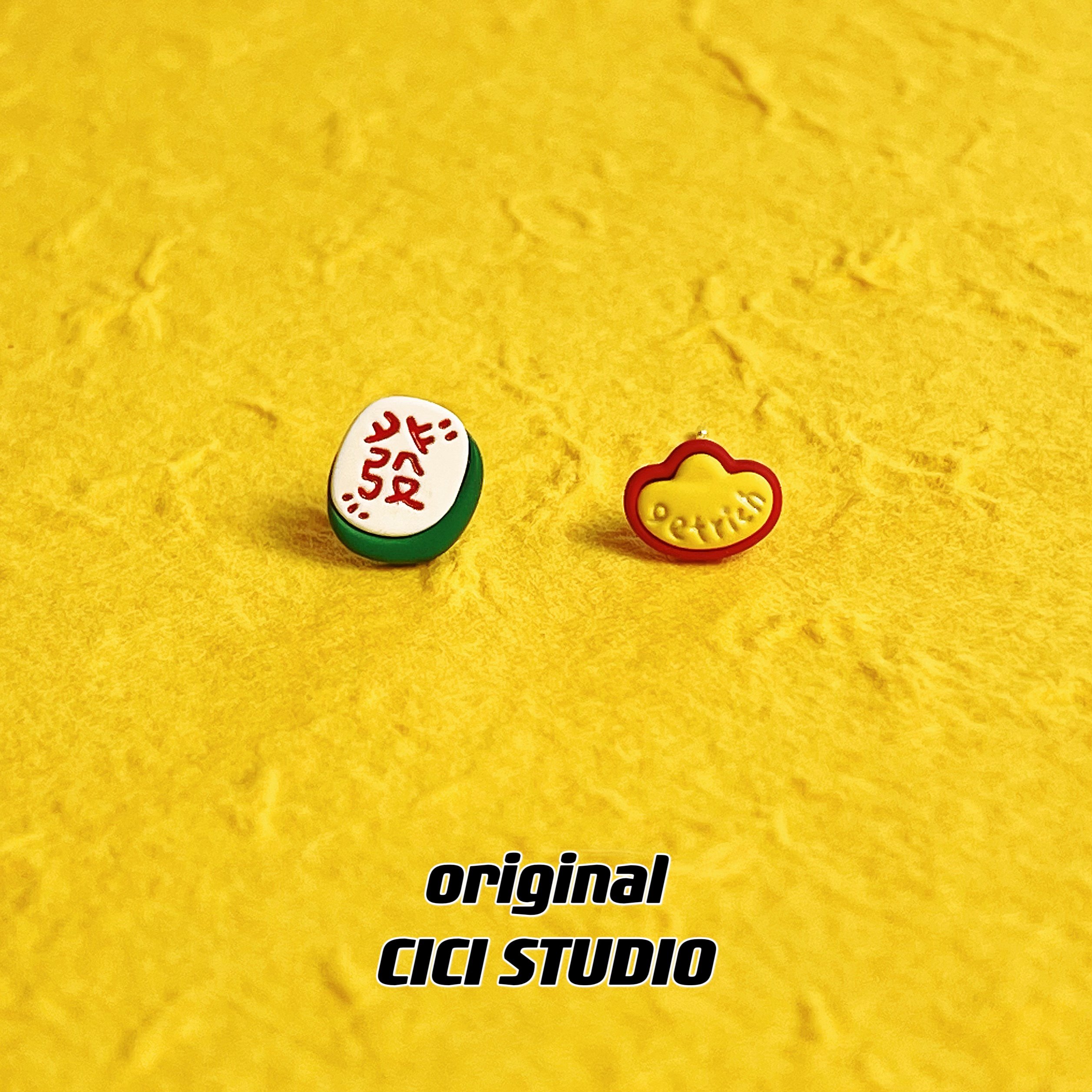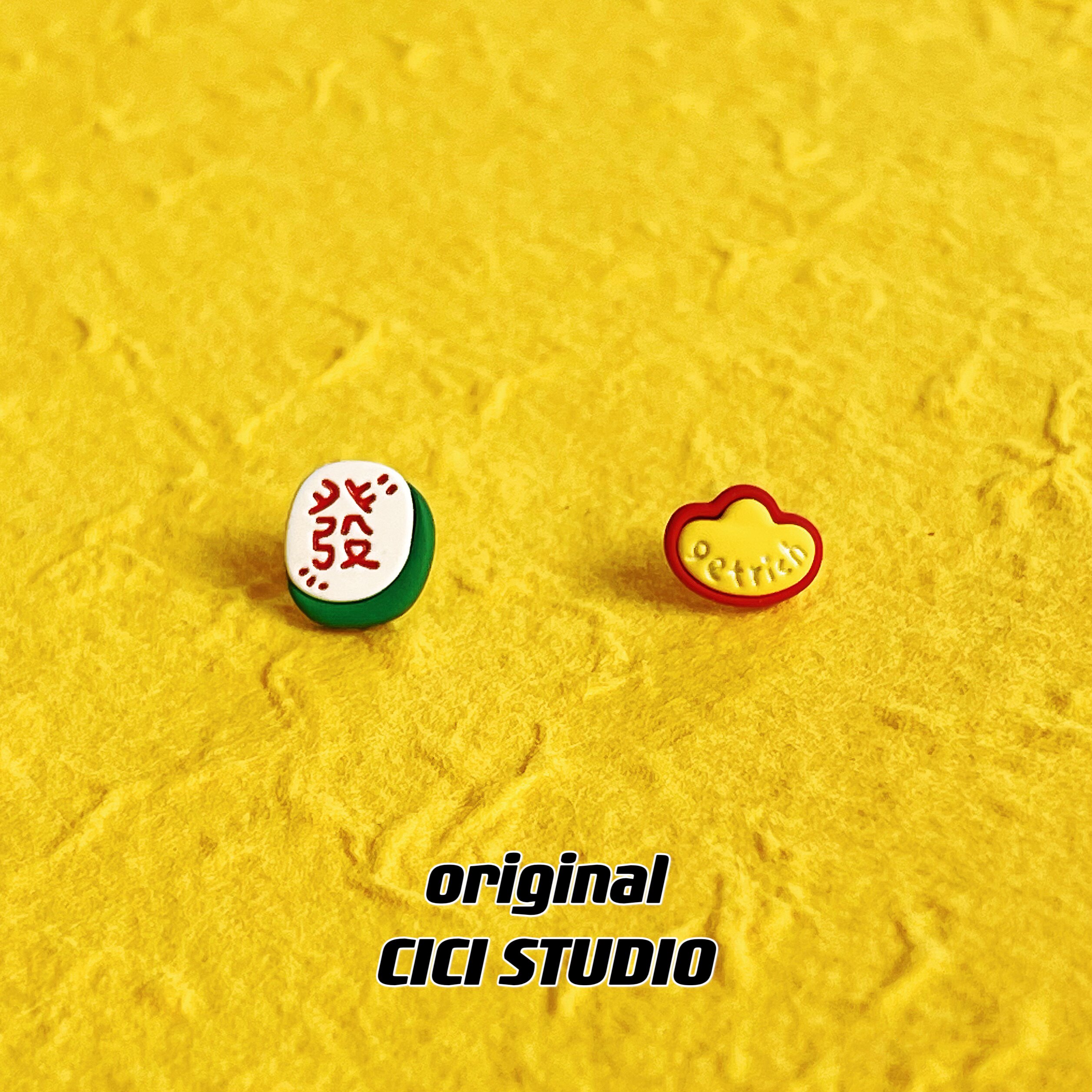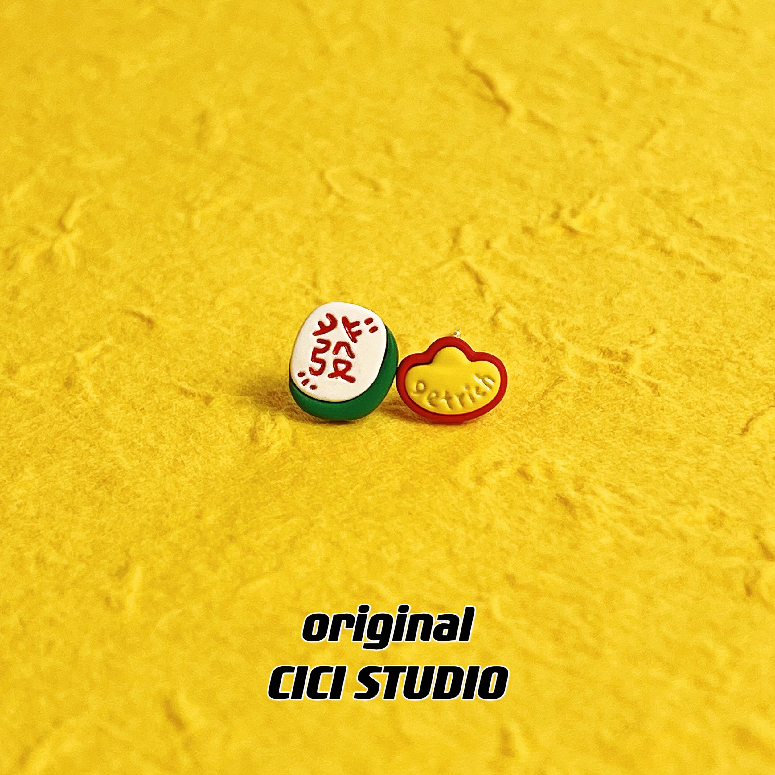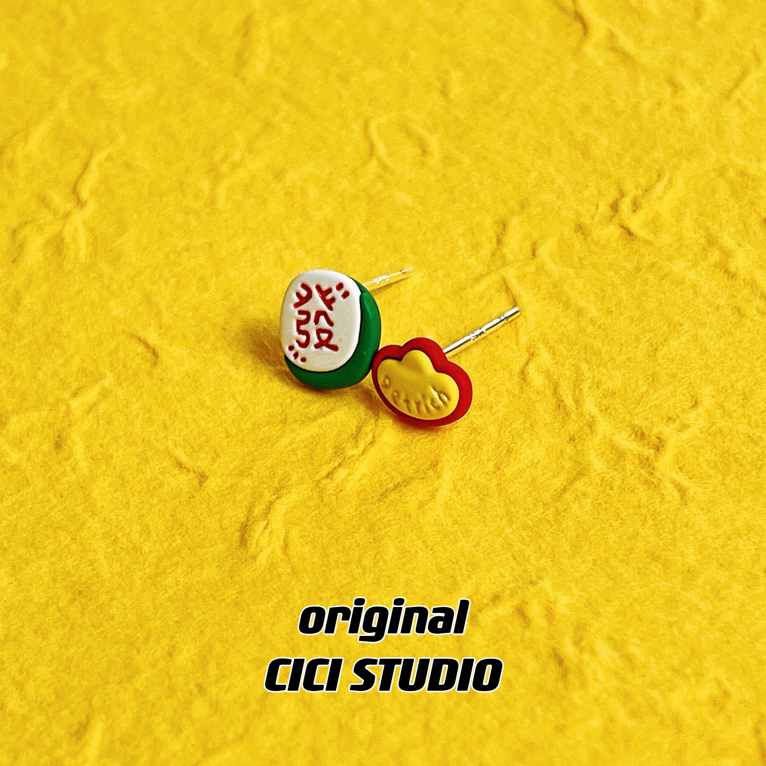 CICI創意麻將金元寶耳釘寓意發財趣味新年國風耳飾可愛新中式耳釘