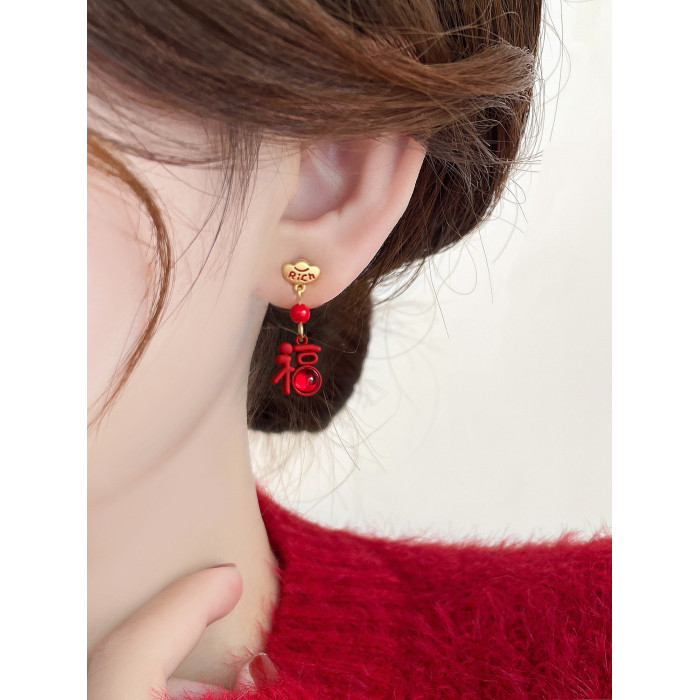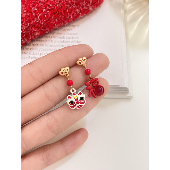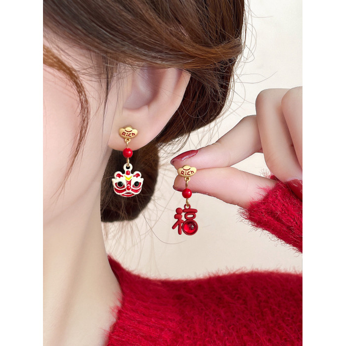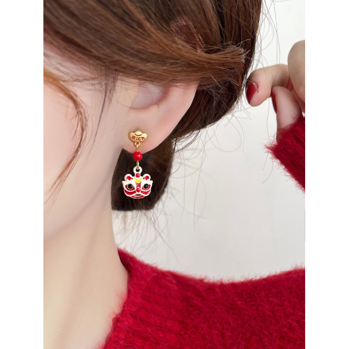 醒獅新年過年耳釘適合冬天的耳環紅色秋冬女小衆獨特氣質高級耳飾