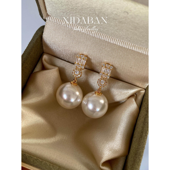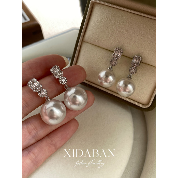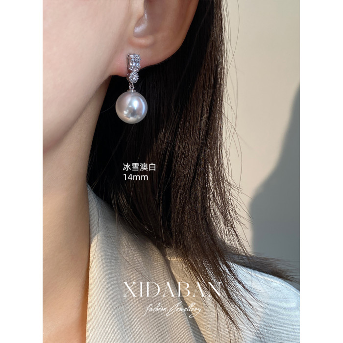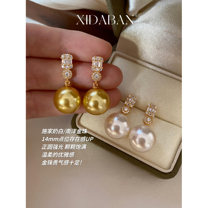 經典戴妃款施家人造澳白珍珠耳環鑲鋯鑽耳釘小衆輕奢高級感耳飾女