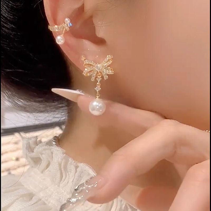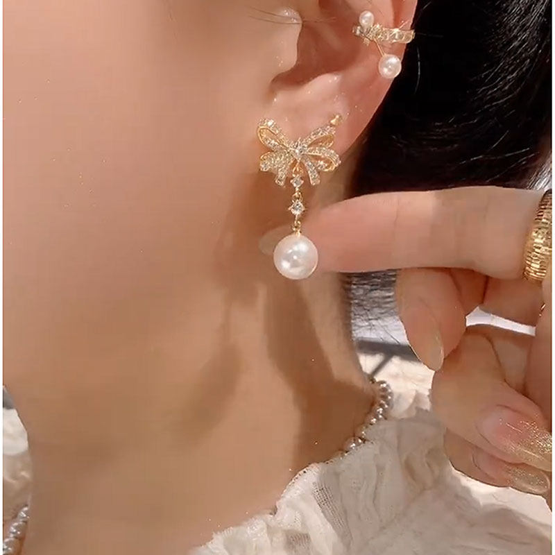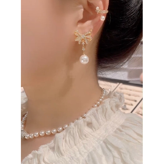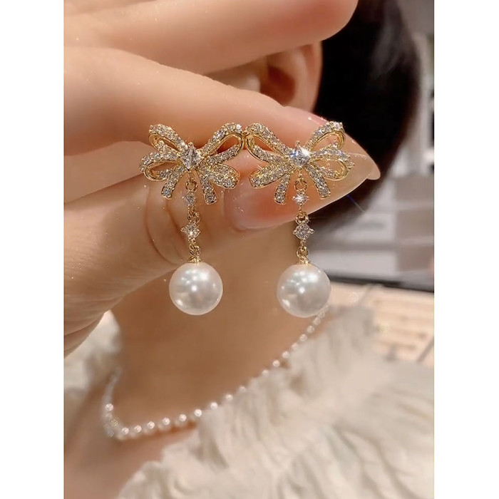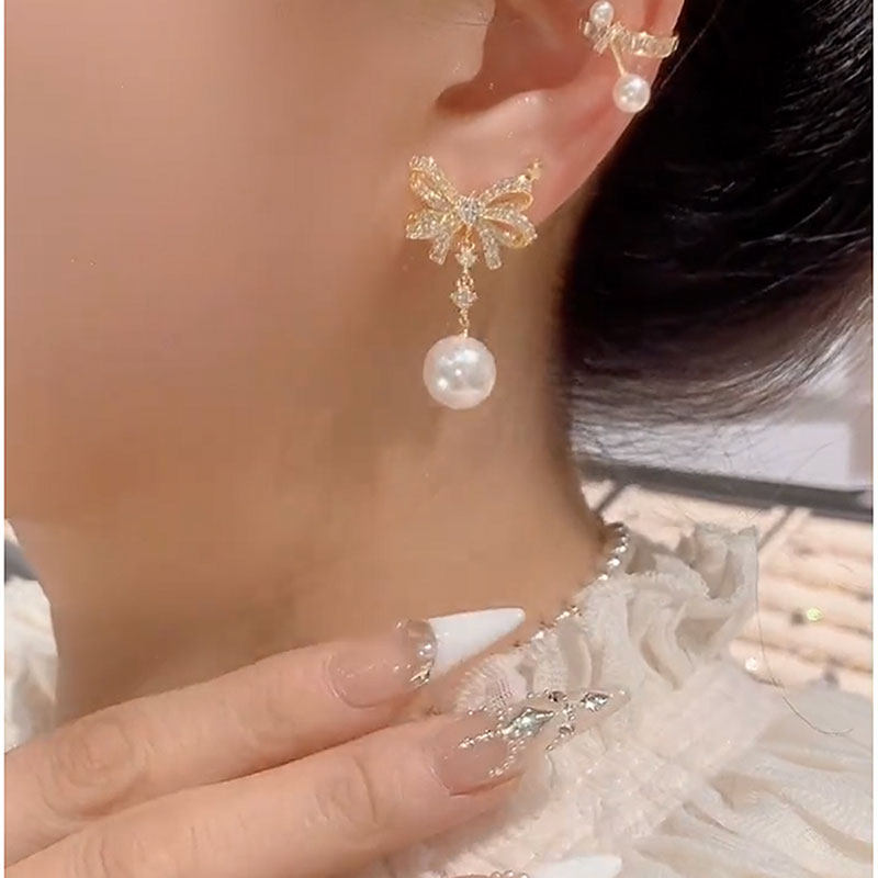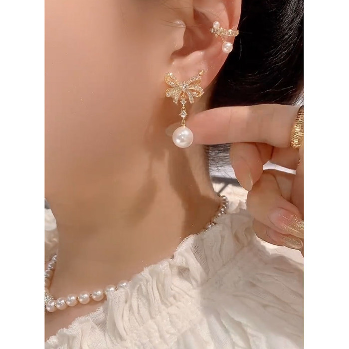 2025年新款微鑲鋯石珍珠蝴蝶結耳環女小衆設計感時尚耳墜氣質耳飾